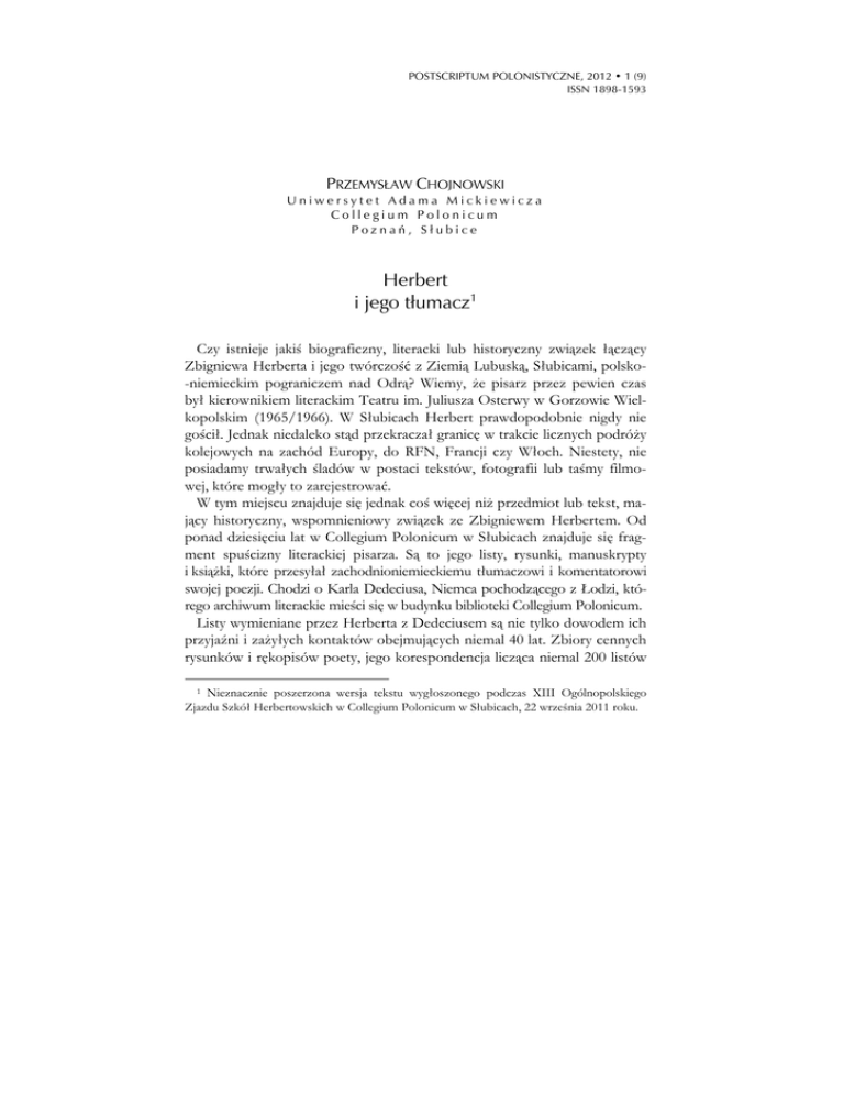 POSTSCRIPTUM POLONISTYCZNE, 2012 • 1 (9) ISSN 1898-1593 PRZEMYSŁAW CHOJNOWSKI Uniwersytet Adama Mickiewicza Collegium Polonicum Poznań, Słubice Herbert i jego tłumacz1 Czy istnieje jakiś biograficzny, literacki lub historyczny związek łączący Zbigniewa Herberta i jego twórczość z Ziemią Lubuską, Słubicami, polsko-niemieckim pograniczem nad Odrą? Wiemy, że pisarz przez pewien czas był kierownikiem literackim Teatru im. Juliusza Osterwy w Gorzowie Wielkopolskim (1965/1966). W Słubicach Herbert prawdopodobnie nigdy nie gościł. Jednak niedaleko stąd przekraczał granicę w trakcie licznych podróży kolejowych na zachód Europy, do RFN, Francji czy Włoch. Niestety, nie posiadamy trwałych śladów w postaci tekstów, fotografii lub taśmy filmowej, które mogły to zarejestrować. W tym miejscu znajduje się jednak coś więcej niż przedmiot lub tekst, mający historyczny, wspomnieniowy związek ze Zbigniewem Herbertem. Od ponad dziesięciu lat w Collegium Polonicum w Słubicach znajduje się fragment spuścizny literackiej pisarza. Są to jego listy, rysunki, manuskrypty i książki, które przesyłał zachodnioniemieckiemu tłumaczowi i komentatorowi swojej poezji. Chodzi o Karla Dedeciusa, Niemca pochodzącego z Łodzi, którego archiwum literackie mieści się w budynku biblioteki Collegium Polonicum. Listy wymieniane przez Herberta z Dedeciusem są nie tylko dowodem ich przyjaźni i zażyłych kontaktów obejmujących niemal 40 lat. Zbiory cennych rysunków i rękopisów poety, jego korespondencja licząca niemal 200 listów 1 Nieznacznie poszerzona wersja tekstu wygłoszonego podczas XIII Ogólnopolskiego Zjazdu Szkół Herbertowskich w Collegium Polonicum w Słubicach, 22 września 2011 roku. 236 POSTSCRIPTUM POLONISTYCZNE, 2012 • 1 (9) i kart pocztowych2 stanowią przede wszystkim cenny dokument historycznoliteracki. Listy, wysyłane na przestrzeni lat 1959–1994 z Warszawy, Paryża, Londynu, Wiednia, włoskiej Taorminy, Nowego Jorku oraz innych miejsc na świecie, ukazują przeżycia i przemyślenia Herberta, jego los półemigranta, który niemal bez przerwy jest w drodze. Korespondencja odsłania również etapy pracy pisarza nad kolejnymi tomami esejów i wierszy, a także jego własnych okazjonalnych przekładów z literatury niemieckiej. Obok tematów literackich odnajdujemy sprawy codzienne, z którymi borykał się pisarz: na przykład starania o wizę, w celu odbycia następnej podróży na Zachód, troska o zdrowie, kłopoty z finansami. Listy są pełne ciepła, humoru i przyjaźni, którą Herbert przez wiele lat darzył Dedeciusa. Autor Pana Cogito, świetnie znający język niemiecki, dostrzegał pasję, talent i swobodę, z jaką Dedecius tłumaczył jego teksty i układał z nich nowe niemieckie tomy wierszy. Herbert widział w nim poetę, który poniechał własnej oryginalnej twórczości na rzecz przekładów dzieł innych pisarzy. Warto zaznaczyć, że zanim doszło do ich pierwszego spotkania, które miało miejsce we Frankfurcie nad Menem w 1963 roku, w trakcie podróży Herberta z Paryża do Warszawy, ich znajomość opierała się wyłącznie na korespondencji. W liście z 14 sierpnia 1964 roku poeta pisze do tłumacza następujące słowa: Drogi panie Karolu, przesyłam Panu spod dymiącej Etny najserdeczniejsze pozdrowienia i życzenia zdrowego urlopu. Ja roztapiam się w upale i zwiedzam Sycylię śladami znakomitego Pana rodaka i drogiego mi poety. Bardzo chciałbym, żeby nasze spotkanie we Frankfurcie i we Wiedniu udało się. Mam jednak dość przykre doświadczenia wizowo-paszportowe. Czy nie udałoby się przed moim powrotem do Francji (będę w Paryżu w pierwszej połowie października) wystąpić za pośrednictwem wydawnictwa o wizę? Normalny tryb załatwiania trwa 1 miesiąc – do 6 tygodni. Przykro mi, że zawracam Panu tym głowę, ale sam Pan nieostrożnie zaproponował mi pomoc. 2 Wśród nich znajduje się 6 listów napisanych przez żonę poety, panią Katarzynę Herbert. Kwerenda w Archiwum Zbigniewa Herberta (Dział Rękopisów Biblioteki Narodowej w Warszawie) wskazuje na to, że po skompletowaniu pełna korespondencja tłumacza z poetą liczy ok. 370 listów i kart pocztowych. Jest to więc w ogóle jeden z najobszerniejszych zbiorów korespondencji spośród tych, które na przestrzeni lat prowadził zarówno Herbert, jak i sam Dedecius. PRZEMYSŁAW CHOJNOWSKI: Herbert i jego tłumacz 237 Siedzę teraz na tarasie w willi Piccina; w dole skała, cyprysy, kaktusy i morze. Jest noc pełna światła i zapachów. Aż słabo od słodyczy. Naprawdę za pięknie. Wciąż mi się zdaje, że za chwilę przyjdzie ktoś i podrze tę pocztówkę. Jutro jadę pod Etnę i spróbuję się wspinać, pomny wszelako na los Empedoklesa. Zwiedzam pilnie Greków, ale głównie zajmuję się sprawami Normanów. Zawszeć to bowiem pobratymcy. Bardzo serdecznie Pana pozdrawiam, dla rodziny łączę ukłony i serdecznie dłoń ściskam. Zbigniew Herbert Taormina 14 VIII 64 (cyt. za: Herbert 2011) Kontakty Herberta z Dedeciusem pokazują też drogę pisarza w szeroki świat, do salonów literackich Berlina, Monachium, Wiednia, gdzie otrzymywał liczne nagrody literackie (około 15). Przyjaźń poety i tłumacza pomaga też zrozumieć, jak i dlaczego w latach 60. i 70. XX wieku twórczość Herberta była lepiej znana w Niemczech Zachodnich niż w Polsce, jak powstawały niemieckie zbiory jego liryków. To, że niektóre jego teksty ukazywały się wiele lat wcześniej w niemieckich tomach wierszy niż w publikacjach krajowych, ma ścisły związek z działaniami Karla Dedeciusa jako tłumacza (i „drugiego autora”), jako antologisty, komentatora i popularyzatora tej poezji, człowieka doskonale obeznanego z polityką najbardziej prestiżowych zachodnioniemieckich wydawnictw literackich i horyzontem oczekiwań czytelniczych w RFN. Twórczość Herberta wyróżnia się na tle innych polskich poetów w Niemczech, gdyż nakłady jego