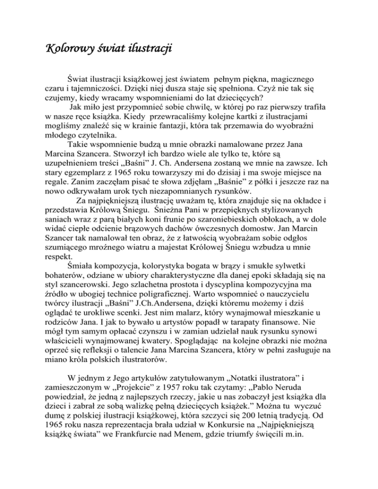 Kolorowy świat ilustracji Świat ilustracji książkowej jest światem pełnym piękna, magicznego czaru i tajemniczości. Dzięki niej dusza staje się spełniona. Czyż nie tak się czujemy, kiedy wracamy wspomnieniami do lat dziecięcych? Jak miło jest przypomnieć sobie chwilę, w której po raz pierwszy trafiła w nasze ręce książka. Kiedy przewracaliśmy kolejne kartki z ilustracjami mogliśmy znaleźć się w krainie fantazji, która tak przemawia do wyobraźni młodego czytelnika. Takie wspomnienie budzą u mnie obrazki namalowane przez Jana Marcina Szancera. Stworzył ich bardzo wiele ale tylko te, które są uzupełnieniem treści „Baśni” J. Ch. Andersena zostaną we mnie na zawsze. Ich stary egzemplarz z 1965 roku towarzyszy mi do dzisiaj i ma swoje miejsce na regale. Zanim zaczęłam pisać te słowa zdjęłam „Baśnie” z półki i jeszcze raz na nowo odkrywałam urok tych niezapomnianych rysunków. Za najpiękniejszą ilustrację uważam tę, która znajduje się na okładce i przedstawia Królową Śniegu. Śnieżna Pani w przepięknych stylizowanych saniach wraz z parą białych koni frunie po szaroniebieskich obłokach, a w dole widać ciepłe odcienie brązowych dachów ówczesnych domostw. Jan Marcin Szancer tak namalował ten obraz, że z łatwością wyobrażam sobie odgłos szumiącego mroźnego wiatru a majestat Królowej Śniegu wzbudza u mnie respekt. Śmiała kompozycja, kolorystyka bogata w brązy i smukłe sylwetki bohaterów, odziane w ubiory charakterystyczne dla danej epoki składają się na styl szancerowski. Jego szlachetna prostota i dyscyplina kompozycyjna ma źródło w ubogiej technice poligraficznej. Warto wspomnieć o nauczycielu twórcy ilustracji „Baśni” J.Ch.Andersena, dzięki któremu możemy i dziś oglądać te urokliwe scenki. Jest nim malarz, który wynajmował mieszkanie u rodziców Jana. I jak to bywało u artystów popadł w tarapaty finansowe. Nie mógł tym samym opłacać czynszu i w zamian udzielał nauk rysunku synowi właścicieli wynajmowanej kwatery. Spoglądając na kolejne obrazki nie można oprzeć się refleksji o talencie Jana Marcina Szancera, który w pełni zasługuje na miano króla polskich ilustratorów. W jednym z Jego artykułów zatytułowanym „Notatki ilustratora” i zamieszczonym w „Projekcie” z 1957 roku tak czytamy: „Pablo Neruda powiedział, że jedną z najlepszych rzeczy, jakie u nas zobaczył jest książka dla dzieci i zabrał ze sobą walizkę pełną dziecięcych książek.” Można tu wyczuć dumę z polskiej ilustracji książkowej, która szczyci się 200 letnią tradycją. Od 1965 roku nasza reprezentacja brała udział w Konkursie na „Najpiękniejszą książkę świata” we Frankfurcie nad Menem, gdzie triumfy święcili m.in. Bohdan Butenko czy Zdzisław Witwicki. Album tego drugiego otrzymała moja córka jako pamiątkę po zwiedzeniu wystawy ilustracji w książce podczas Nocy Muzeów, zorganizowanej w Wojewódzkiej i Miejskiej Publicznej Bibliotece w Zielonej Górze. Ze wstępu do albumu wiem, że ilustracje dla dzieci mogą tworzyć tylko Ci, który kochają to, co robią. Tak mawia sam Zdzisław Witwicki: „Miałem chyba wielkie szczęście w życiu, że mogłem pracować w dziedzinie sztuki zwanej ilustracją. I to ilustracją dla dzieci. Przez kilkadziesiąt lat robiłem to, co najbardziej robić lubiłem. Malowałem obrazki dla najwrażliwszego odbiorcy na świecie. Czy może być dla artysty coś wspanialszego?” Jeszcze na zakończenie chciałabym wspomnieć o Wandzie Orlińskiej, która wspólnie z mężem i córką trudni się od lat ilustratorską twórczością dla dzieci. Interesującą ekspozycję poświęconą ilustracjom, jakie załączała do treści książkowych czy różnych czasopism mogliśmy oglądać jeszcze kilka dni temu w pomieszczeniu przy Sali Dębowej WiMBP w Zielonej Górze. Jej artyzm jest wynikiem szkoły, jaką otrzymała będąc uczennicą Króla Polskich Ilustratorów – Jana Marcina Szancera. Obcowanie z pięknem czyni nasze życie bardziej kolorowym dlatego dbanie o jego pielęgnację może być wyzwaniem, dla którego warto podjąć wysiłek. Chciałabym zachęcić Was, drodzy czytelnicy do wyjścia z domu, do obejrzenia wystawy w Bibliotece lub Muzeum... To magiczne miejsca, w których chwile spędzone nigdy nie są stracone...