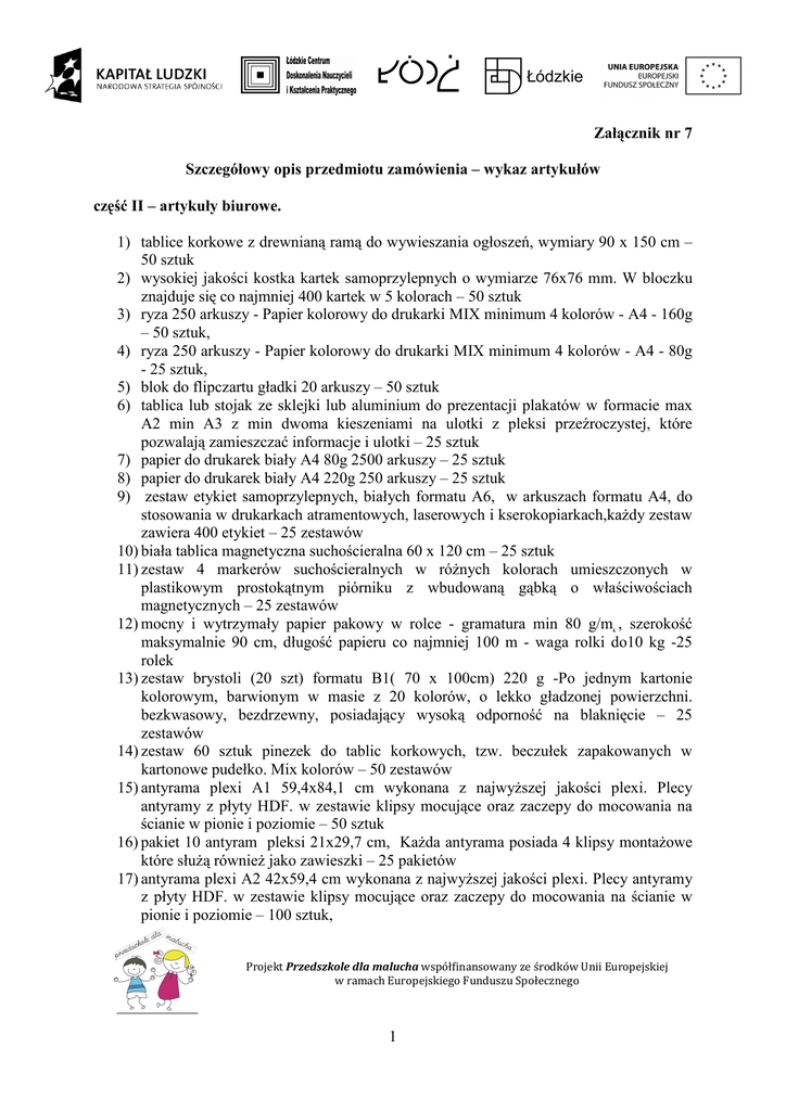 Załącznik nr 7 Szczegółowy opis przedmiotu zamówienia – wykaz artykułów część II – artykuły biurowe. 1) tablice korkowe z drewnianą ramą do wywieszania ogłoszeń, wymiary 90 x 150 cm – 50 sztuk 2) wysokiej jakości kostka kartek samoprzylepnych o wymiarze 76x76 mm. W bloczku znajduje się co najmniej 400 kartek w 5 kolorach – 50 sztuk 3) ryza 250 arkuszy - Papier kolorowy do drukarki MIX minimum 4 kolorów - A4 - 160g – 50 sztuk, 4) ryza 250 arkuszy - Papier kolorowy do drukarki MIX minimum 4 kolorów - A4 - 80g - 25 sztuk, 5) blok do flipczartu gładki 20 arkuszy – 50 sztuk 6) tablica lub stojak ze sklejki lub aluminium do prezentacji plakatów w formacie max A2 min A3 z min dwoma kieszeniami na ulotki z pleksi przeźroczystej, które pozwalają zamieszczać informacje i ulotki – 25 sztuk 7) papier do drukarek biały A4 80g 2500 arkuszy – 25 sztuk 8) papier do drukarek biały A4 220g 250 arkuszy – 25 sztuk 9) zestaw etykiet samoprzylepnych, białych formatu A6, w arkuszach formatu A4, do stosowania w drukarkach atramentowych, laserowych i kserokopiarkach,kaŜdy zestaw zawiera 400 etykiet – 25 zestawów 10) biała tablica magnetyczna suchościeralna 60 x 120 cm – 25 sztuk 11) zestaw 4 markerów suchościeralnych w róŜnych kolorach umieszczonych w plastikowym prostokątnym piórniku z wbudowaną gąbką o właściwościach magnetycznych – 25 zestawów 12) mocny i wytrzymały papier pakowy w rolce - gramatura min 80 g/m˛, szerokość maksymalnie 90 cm, długość papieru co najmniej 100 m - waga rolki do10 kg -25 rolek 13) zestaw brystoli (20 szt) formatu B1( 70 x 100cm) 220 g -Po jednym kartonie kolorowym, barwionym w masie z 20 kolorów, o lekko gładzonej powierzchni. bezkwasowy, bezdrzewny, posiadający wysoką odporność na blaknięcie – 25 zestawów 14) zestaw 60 sztuk pinezek do tablic korkowych, tzw. beczułek zapakowanych w kartonowe pudełko. Mix kolorów – 50 zestawów 15) antyrama plexi A1 59,4x84,1 cm wykonana z najwyŜszej jakości plexi. Plecy antyramy z płyty HDF. w zestawie klipsy mocujące oraz zaczepy do mocowania na ścianie w pionie i poziomie – 50 sztuk 16) pakiet 10 antyram pleksi 21x29,7 cm, KaŜda antyrama posiada 4 klipsy montaŜowe które słuŜą równieŜ jako zawieszki – 25 pakietów 17) antyrama plexi A2 42x59,4 cm wykonana z najwyŜszej jakości plexi. Plecy antyramy z płyty HDF. w zestawie klipsy mocujące oraz zaczepy do mocowania na ścianie w pionie i poziomie – 100 sztuk, Projekt Przedszkole dla malucha współfinansowany ze środków Unii Europejskiej w ramach Europejskiego Funduszu Społecznego 1 18) zestaw magnesów do tablic - Rozmiar: 20 mm, 6 sztuk mix kolorów- 75 zestawów, 19) zestaw trójkątnych spinaczy - 50szt spinaczy 32mm – 75 zestawów 20) taśma klejąca pakowa, bezbarwna, o wymiarach 48mm×66m – 50 sztuk, 21) zestaw błyszczących i sztywnych folii do laminowania na gorąco A4 216x303 mm 150 mic., zawiera 100 szt, folie posiadają wykończenie antystatyczne – 50 zestawów 22) zestaw papieru fotograficznego błyszczącego, wodoodpornego, powlekanego Ŝywicą do druku atramentowego. Zastosowanie: wydruk zdjęć, grafika artystyczna, prezentacje biznesowe, okładki publikacji., pakowany po 20 arkuszy w rozmiarze formatu A4 i gramaturze 260g/m2 – 25 zestawów 23) segregator formatu A4 z mechanizmem (tzw. łyŜwą) i klamrą zaciskową, szerokość 50 mm, dwa ringi, wzmocniony otwór na palec, wzmocniona dolna krawędź segregatora metalową listwą, segregator wykonany z kartonu, pokryty folią PCV, etykieta na grzbiecie wymienna – 50 sztuk, 24) segregator formatu A4 z mechanizmem (tzw. łyŜwą) i klamrą zaciskową, szerokość75 mm, dwa ringi, wzmocniony otwór na palec, wzmocniona dolna krawędź segregatora metalową listwą, segregator wykonany z kartonu, pokryty folią PCV, etykieta na grzbiecie wymienna – 50 sztuk, 25) skoroszyt A4 wpinany do segregatora, przednia okładka przezroczysta, tylna kolorowa z miękkiego tworzywa, pasujący do wszystkich typów segregatorów – 250 sztuk 26) ryza 250 arkuszy - Papier kolorowy do drukarki MIX minimum 4 kolorów - A4 - 160g – 2 sztuki, 27) ryza 250 arkuszy - Papier kolorowy do drukarki MIX minimum 4 kolorów - A4 - 80g - 2 sztuki, 28) zestaw koszulek antystatycznych A4 krystaliczna gruba 120 mic., europerforacja do wpięcia do segregatorów, w zestawie 100 szt – 25 zestawów, 29) biała masa samoprzylepna wielokrotnego uŜytku. UmoŜliwia szybkie i czyste mocowanie dekoracji, plakatów, notatek oraz lekkich przedmiotów do większości gładkich powierzchni. Opakowanie 50g. - 25 opakowań 30) papier do drukarek biały A4 80g 2500 arkuszy – 10 sztuk 31) papier do drukarek biały A4 220g 250 arkuszy – 2 sztuki 32) zestaw przekładek do segregatorów rozmiar 98x240mm wykonanych z kartonu barwionego w masie, posiadających 5 otworów do wpinania w zamki segregatorowe 2 ringowe róŜne kolory, w zestawie 100 szt – 10 zestawów, 33) korektor w taśmie o szerokości 4.2 mm i długości 8 mz aplikacją boczną, ze śrubą mechanizmu napinania taśmy – 10 sztuk, 34) pudło do archiwizacji dokumentów 100mm x 520mm x 710mm – 40 sztuk, 35) klej w sztyfcie 35 g, niebrudzący, zmywalny, nadający się do klejenia papieru, tektury,zdjęć i tkanin – 75 sztuk, 36) zestaw płyt DVD-R 4.7GB, szpule 25szt – 4 zestawy, 37) samoprzylepne etykiety na płyty CD – 10 arkuszy A4, po 2 naklejki na arkuszu – 2 sztuki 38) zestaw przezroczystych plastikowych obwolut do wpinania do segregatora na płyty CD, zawiera 100 szt – 2 zestawy, Projekt Przedszkole dla malucha współfinansowany ze środków Unii Europejskiej w ramach Europejskiego Funduszu Społecznego 2 39) zestaw klipsów do papieru, metalowe 19 mm i 25mm, w zestawie 24 szt – 100 zestawów, 40) etykiety samoprzylepne białe formatu A4 na 10 arkuszach formatu A4, do stosowania w drukarkach atramentowych, laserowych i kserokopiarkach. Dostępne w kolorze białym – 2 
