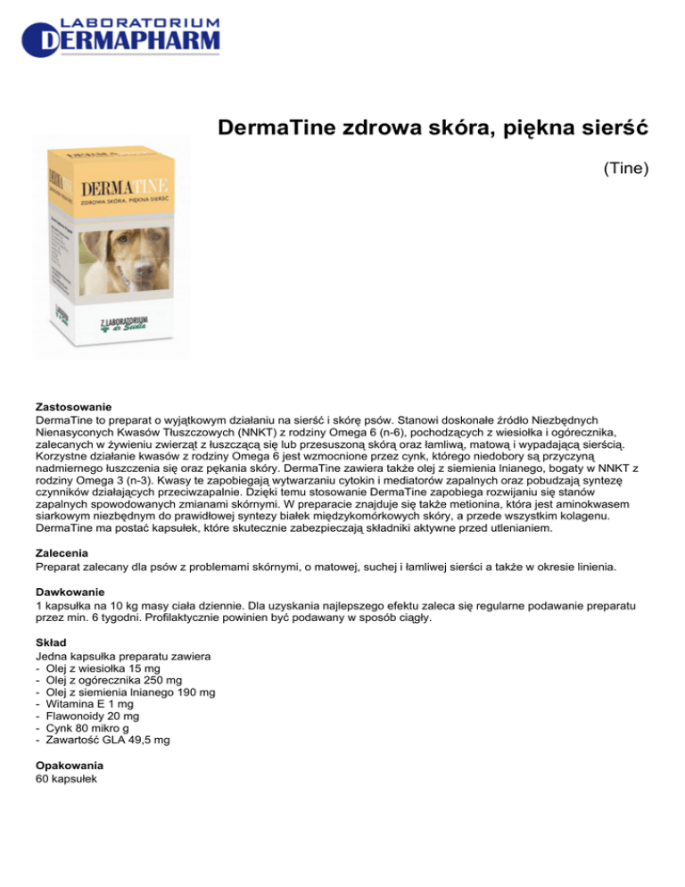 DermaTine zdrowa skóra, piękna sierść (Tine) Zastosowanie DermaTine to preparat o wyjątkowym działaniu na sierść i skórę psów. Stanowi doskonałe źródło Niezbędnych Nienasyconych Kwasów Tłuszczowych (NNKT) z rodziny Omega 6 (n-6), pochodzących z wiesiołka i ogórecznika, zalecanych w żywieniu zwierząt z łuszczącą się lub przesuszoną skórą oraz łamliwą, matową i wypadającą sierścią. Korzystne działanie kwasów z rodziny Omega 6 jest wzmocnione przez cynk, którego niedobory są przyczyną nadmiernego łuszczenia się oraz pękania skóry. DermaTine zawiera także olej z siemienia lnianego, bogaty w NNKT z rodziny Omega 3 (n-3). Kwasy te zapobiegają wytwarzaniu cytokin i mediatorów zapalnych oraz pobudzają syntezę czynników działających przeciwzapalnie. Dzięki temu stosowanie DermaTine zapobiega rozwijaniu się stanów zapalnych spowodowanych zmianami skórnymi. W preparacie znajduje się także metionina, która jest aminokwasem siarkowym niezbędnym do prawidłowej syntezy białek międzykomórkowych skóry, a przede wszystkim kolagenu. DermaTine ma postać kapsułek, które skutecznie zabezpieczają składniki aktywne przed utlenianiem. Zalecenia Preparat zalecany dla psów z problemami skórnymi, o matowej, suchej i łamliwej sierści a także w okresie linienia. Dawkowanie 1 kapsułka na 10 kg masy ciała dziennie. Dla uzyskania najlepszego efektu zaleca się regularne podawanie preparatu przez min. 6 tygodni. Profilaktycznie powinien być podawany w sposób ciągły. Skład Jedna kapsułka preparatu zawiera - Olej z wiesiołka 15 mg - Olej z ogórecznika 250 mg - Olej z siemienia lnianego 190 mg - Witamina E 1 mg - Flawonoidy 20 mg - Cynk 80 mikro g - Zawartość GLA 49,5 mg Opakowania 60 kapsułek