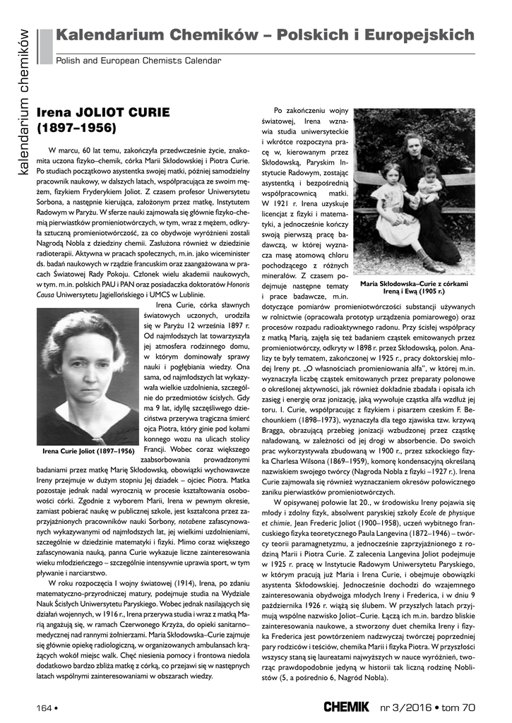 kalendarium chemików Kalendarium Chemików – Polskich i Europejskich Polish and European Chemists Calendar Irena JOLIOT CURIE (1897–1956) W marcu, 60 lat temu, zakończyła przedwcześnie życie, znakomita uczona fizyko–chemik, córka Marii Skłodowskiej i Piotra Curie. Po studiach początkowo asystentka swojej matki, później samodzielny pracownik naukowy, w dalszych latach, współpracująca ze swoim mężem, fizykiem Fryderykiem Joliot. Z czasem profesor Uniwersytetu Sorbona, a następnie kierująca, założonym przez matkę, Instytutem Radowym w Paryżu. W sferze nauki zajmowała się głównie fizyko-chemią pierwiastków promieniotwórczych, w tym, wraz z mężem, odkryła sztuczną promieniotwórczość, za co obydwoje wyróżnieni zostali Nagrodą Nobla z dziedziny chemii. Zasłużona również w dziedzinie radioterapii. Aktywna w pracach społecznych, m.in. jako wiceminister ds. badań naukowych w rządzie francuskim oraz zaangażowana w pracach Światowej Rady Pokoju. Członek wielu akademii naukowych, w tym. m.in. polskich PAU i PAN oraz posiadaczka doktoratów Honoris Causa Uniwersytetu Jagiellońskiego i UMCS w Lublinie. Irena Curie, córka sławnych światowych uczonych, urodziła się w Paryżu 12 września 1897 r. Od najmłodszych lat towarzyszyła jej atmosfera rodzinnego domu, w którym dominowały sprawy nauki i pogłębiania wiedzy. Ona sama, od najmłodszych lat wykazywała wielkie uzdolnienia, szczególnie do przedmiotów ścisłych. Gdy ma 9 lat, idyllę szczęśliwego dzieciństwa przerywa tragiczna śmierć ojca Piotra, który ginie pod kołami konnego wozu na ulicach stolicy Irena Curie Joliot (1897–1956) Francji. Wobec coraz większego zaabsorbowania prowadzonymi badaniami przez matkę Marię Skłodowską, obowiązki wychowawcze Ireny przejmuje w dużym stopniu Jej dziadek – ojciec Piotra. Matka pozostaje jednak nadal wyrocznią w procesie kształtowania osobowości córki. Zgodnie z wyborem Marii, Irena w pewnym okresie, zamiast pobierać naukę w publicznej szkole, jest kształcona przez zaprzyjaźnionych pracowników nauki Sorbony, notabene zafascynowanych wykazywanymi od najmłodszych lat, jej wielkimi uzdolnieniami, szczególnie w dziedzinie matematyki i fizyki. Mimo coraz większego zafascynowania nauką, panna Curie wykazuje liczne zainteresowania wieku młodzieńczego – szczególnie intensywnie uprawia sport, w tym pływanie i narciarstwo. W roku rozpoczęcia I wojny światowej (1914), Irena, po zdaniu matematyczno-przyrodniczej matury, podejmuje studia na Wydziale Nauk Ścisłych Uniwersytetu Paryskiego. Wobec jednak nasilających się działań wojennych, w 1916 r., Irena przerywa studia i wraz z matką Marią angażują się, w ramach Czerwonego Krzyża, do opieki sanitarno– medycznej nad rannymi żołnierzami. Maria Skłodowska–Curie zajmuje się głównie opiekę radiologiczną, w organizowanych ambulansach krążących wokół miejsc walk. Chęć niesienia pomocy i frontowa niedola dodatkowo bardzo zbliża matkę z córką, co przejawi się w następnych latach wspólnymi zainteresowaniami w obszarach wiedzy. 164 • Po zakończeniu wojny światowej, Irena wznawia studia uniwersyteckie i wkrótce rozpoczyna pracę w, kierowanym przez Skłodowską, Paryskim Instytucie Radowym, zostając asystentką i bezpośrednią współpracownicą matki. W 1921 r. Irena uzyskuje licencjat z fizyki i matematyki, a jednocześnie kończy swoją pierwszą pracę badawczą, w której wyznacza masę atomową chloru pochodzącego z różnych minerałów. Z czasem podejmuje następne tematy Maria Skłodowska–Curie z córkami Ireną i Ewą (1905 r.) i prace badawcze, m.in. dotyczące pomiarów promieniotwórczości substancji używanych w rolnictwie (opracowała prototyp urządzenia pomiarowego) oraz procesów rozpadu radioaktywnego radonu. Przy ścisłej współpracy z matką Marią, zajęła się też badaniem cząstek emitowanych przez promieniotwórczy, odkryty w 1898 r. przez Skłodowską, polon. Analizy te były tematem, zakończonej w 1925 r., pracy doktorskiej młodej Ireny pt. „O własnościach promieniowania alfa”, w której m.in. wyznaczyła liczbę cząstek emitowanych przez preparaty polonowe o określonej aktywności, jak również dokładnie zbadała i opisała ich zasięg i energię oraz jonizację, jaką wywołuje cząstka alfa wzdłuż jej toru. I. Curie, współpracując z fizykiem i pisarzem czeskim F. Bechounkiem (1898–1973), wyznaczyła dla tego zjawiska tzw. krzywą Bragga, obrazującą przebieg jonizacji wzbudzonej przez cząstkę naładowaną, w zależności od jej drogi w absorbencie. Do swoich prac wykorzystywała zbudowaną w 1900 r., przez szkockiego fizyka Charlesa Wilsona (1869–1959), komorę kondensacyjną określaną nazwiskiem swojego twórcy (Nagroda Nobla z fizyki –1927 r.). Irena Curie zajmowała się również wyznaczaniem okresów połowicznego zaniku pierwiastków promieniotwórczych. W opisywanej połowie lat 20., w środowisku Ireny pojawia się młody i zdolny fizyk, absolwent paryskiej szkoły Ecole de physique et chimie, Jean Frederic Joliot (1900–1958), uczeń wybitnego francuskiego fizyka teoretycznego Paula Langevina (1872–1946) – twórcy teorii paramagnetyzmu, a jednocześnie zaprzyjaźnionego z rodziną Marii i Piotra Curie. Z zalecenia Langevina Joliot podejmuje w 1925 r. pracę w Instytucie Radowym Uniwersytetu Paryskiego, w którym pracują już Maria i Irena Curie, i obejmuje obowiązki asystenta Skłodowskiej. Jednocześnie dochodzi do wzajemnego zainteresowania obydwojga młodych Ireny i Frederica, i w dniu 9 października 1926 r. wiążą się ślubem. W przyszłych latach przyjmują wspólne nazwisko Joliot–Curie. Łączą ich m.in. bardzo bliskie zainteresowania naukowe, a stworzony duet chemika Ireny i fizyka Frederica jest powtórzeniem nadzwyczaj twórczej poprzedniej pary rodziców i teściów, chemika Marii i fizyka Piotra. W przyszłości wszyscy staną się laureatami 