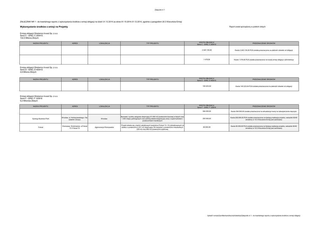 Załącznik nr 1 ZAŁĄCZNIK NR 1 - do kwartalnego raportu z wykorzystania środków z emisji obligacji na dzień 31.12.2014 za okres 01.10.2014-31.12.2014, zgodnie z paragrafem 20.3 Warunków Emisji Wykorzystanie środków z emisji na Projekty Raport został sporządzony w polskich złotych Emisja obligacji Ghelamco Invest Sp. z o.o. Seria C - GHEL C 200415 132,5 Miliona Złotych NAZWA PROJEKTU ADRES LOKALIZACJA TYP PROJEKTU KWOTA OBLIGACJI Seria C - GHEL C 200415 PRZEZNACZENIE ŚRODKÓW 2 445 139,26 Kwota 2.445.139,26 PLN została przeznaczona na płatność odsetek od obligacji 1 478,06 Kwota 1.478,06 PLN została przeznaczona na koszty emisji obligacji i administracji KWOTA OBLIGACJI Seria D - GHEL D 400415 PRZEZNACZENIE ŚRODKÓW 140 223,04 Kwota 140.223,04 PLN została przeznaczona na płatność odsetek od obligacji Emisja obligacji Ghelamco Invest Sp. z o.o. Seria D - GHEL D 400415 4,6 Miliona Złotych NAZWA PROJEKTU ADRES LOKALIZACJA TYP PROJEKTU Emisja obligacji Ghelamco Invest Sp. z o.o. Seria F - GHEL F 120816 9,2 Milionów Złotych NAZWA PROJEKTU ADRES LOKALIZACJA TYP PROJEKTU KWOTA OBLIGACJI Seria F - GHEL F 120816 PRZEZNACZENIE ŚRODKÓW 594 000,00 Kwota 594.000,00 została przeznaczona na aktualizacje kwoty na zabezpieczenie depozytu Synergy Business Park Wrocław, ul. Horbaczewskiego / Na ostatnim Groszu Wrocław Biurowiec i punkty usługowe obejmujący 61.000 m2 powierzchni biurowej w fazach oraz 1.400 miejsc parkingowych oraz parking wielokondygnacyjny wraz z supermarketem i powierzchniami handlowymi 200 000,00 Kwota 200.000,00 PLN została przeznaczona na bieżącą realizację projektu; wskaźnik 60/40 określony w 10.5 Warunków Emisji jest zachowany Foksal Warszawa, Śródmieście, ul.Foksal 13 i Foksal 15 Aglomeracja Warszawska Projekt składa się z dwóch zabytkowych budynków (Foksal 13 i 15) zlokalizowanych na działce o powierzchni 2.251 m2 obejmujący 39 mieszkań o powierzchni mieszkalnej 6 229 m2 oraz 990 m2 powierzchni użytkowej 90 000,00 Kwota 90.000,00 PLN została przeznaczona na bieżącą realizację projektu; wskaźnik 60/40 określony w 10.5 Warunków Emisji jest zachowany \\plwa01-svrsan2\profiles\karolina.bryk\desktop\Załącznik nr 1 - do kwartalnego raportu z wykorzystania środków z emisji obligacji Załącznik nr 1 Emisja obligacji Ghelamco Invest Sp. z o.o. Seria G - GHEL G 141116 6,53 Milionów Złotych NAZWA PROJEKTU ADRES LOKALIZACJA TYP PROJEKTU KWOTA OBLIGACJI Seria G - GHEL G 141116 PRZEZNACZENIE ŚRODKÓW 222 196,31 Kwota 222.196,31 PLN została przeznaczona na płatność odsetek od obligacji 500,00 Kwota 500,00 PLN została przeznaczona na koszty emisji obligacji i administracji Emisja obligacji Ghelamco Invest Sp. z o.o. Seria H - GHEL H 27,17 Milionów Złotych NAZWA PROJEKTU ADRES LOKALIZACJA TYP PROJEKTU KWOTA OBLIGACJI Seria H - GHEL H PRZEZNACZENIE ŚRODKÓW 8 500,00 Kwota 8.500,00 PLN została przeznaczona na koszty emisji obligacji i administracji 986 271,00 Kwota 986.271,00 PLN została przeznaczona na płatność odsetek od obligacji Projekt składa się z dwóch zabytkowych budynków (Foksal 13 i 15) zlokalizowanych na działce o powierzchni 2.251 m2 obejmujący 39 mieszkań o powierzchni mieszkalnej 6 229 m2 oraz 990 m2 powierzchni użytkowej 190 000,00 Kwota 190.000,00 PLN została przeznaczona na bieżącą realizację projektu; wskaźnik 60/40 określony w 9.5 Warunków Emisji jest zachowany Foksal Warszawa, Śródmieście, ul.Foksal 13 i Foksal 15 Aglomeracja Warszawska Grzybowska 77 Warszawa, centralny obszar miejski Aglomeracja Warszawska Budynek biurowy o pow. najmu 4 152 m2 oraz nieruchomość pod zabudowę 150 000,00 Kwota 150.000,00 PLN została przeznaczona na bieżącą realizację projektu; wskaźnik 60/40 określony w 9.5 Warunków Emisji jest zachowany Biurowiec i punkty usługowe obejmujący 61.000 m2 powierzchni biurowej w fazach oraz 1.400 miejsc parkingowych oraz parking wielokondygnacyjny wraz z supermarketem i powierzchniami handlowymi 250 000,00 Kwota 250.000,00 PLN została przeznaczona na bieżącą realizację projektu; wskaźnik 60/40 określony w 9.5 Warunków Emisji jest zachowany 2 500 000,00 Kwota 2.500.000,00 PLN została przeznaczona na bieżącą realizację projektu; wskaźnik 60/40 określony w 9.5 Warunków Emisji jest zachowany 90 000,00 Kwota 90.000,00 PLN została przeznaczona na bieżącą realizację projektu; wskaźnik 60/40 określony w 9.5 Warunków Emisji jest zachowany Synergy Business Park Wrocław, ul. Horbaczewskiego / Na ostatnim Groszu Wrocław Warsaw Spire Warszawa, ul. Towarowa/ul. Łucka/ ul. Grzybowska (centralny obszar miejski) Aglomeracja Warszawska Postępu Business Park Warszawa, ul. Postępu 2 Aglomeracja Warszawska Łącznie 106.624 m2 podlegające wynajmowi (w tym: 102.184 m2 powierzchni biurowych, 4.438 m2 powierzchni handlowych, restauracyjnych, ok. 1.200 miejsc parkingowych na 5 podziemnych kondygnacjach) Budynek biurowy około 29.000 m2 \\plwa01-svrsan2\profiles\karolina.bryk\desktop\Załącznik nr 1 - do kwartalnego raportu z wykorzystania środków z emisji obligacji Załącznik nr 1 Emisja obligacji Ghelamco Invest Sp. z o.o. Seria J - GHEL J 30,00 Milionów Złotych NAZWA PROJEKTU Warsaw Spire ADRES LOKALIZACJA Warszawa, ul. Towarowa/ul. Łucka/ ul. Grzybowska (centralny obszar miejski) Aglomeracja Warszawska ADRES LOKALIZACJA TYP PROJEKTU Łącznie 106.624 m2 podlegające wynajmowi (w tym: 102.184 m2 powierzchni biurowych, 4.438 m2 powierzchni handlowych, restauracyjnych, ok. 1.200 miejsc parkingowych na 5 podziemnych kondygnacjach) KWOTA OBLIGACJI Seria J - GHEL J PRZEZNACZENIE ŚRODKÓW 30 600,29 Kwota 30.600,29 PLN została przeznaczona na koszty emisji obligacji i administracji 2 135 430,00 Kwota 2.135.430,00 PLN została przeznaczona na aktualizacje kwoty na zabezpieczenie depozytu 2 000 000,00 Kwota 2.000.000,00 PLN została przeznaczona na bieżącą realizację projektu; wskaźnik 60/40 określony w 9.5 Warunków Emisji jest zachowany Emisja