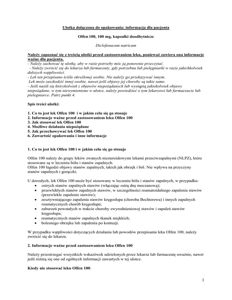 Ulotka dołączona do opakowania: informacja dla pacjenta Olfen 100, 100 mg, kapsułki doodbytnicze Diclofenacum natricum Należy zapoznać się z treścią ulotki przed zastosowaniem leku, ponieważ zawiera ona informacje ważne dla pacjenta. - Należy zachować tę ulotkę, aby w razie potrzeby móc ją ponownie przeczytać. - Należy zwrócić się do lekarza lub farmaceuty, gdy potrzebna lub pielęgniarki w razie jakichkolwiek dalszych wątpliwości. - Lek ten przepisano ściśle określonej osobie. Nie należy go przekazywać innym. Lek może zaszkodzić innej osobie, nawet jeśli objawy jej choroby są takie same. - Jeśli nasili się którykolwiek z objawów niepożądanych lub wystąpią jakiekolwiek objawy niepożądane, w tym niewymienione w ulotce, należy powiedzieć o tym lekarzowi lub farmaceucie lub pielegniarce. Patrz punkt 4. Spis treści ulotki: 1. Co to jest lek Olfen 100 i w jakim celu się go stosuje 2. Informacje ważne przed zastosowaniem leku Olfen 100 3. Jak stosować lek Olfen 100 4. Możliwe działania niepożądane 5. Jak przechowywać lek Olfen 100 6. Zawartość opakowania i inne informacje 1. Co to jest lek Olfen 100 i w jakim celu się go stosuje Olfen 100 należy do grupy leków zwanych niesteroidowymi lekami przeciwzapalnymi (NLPZ), które stosowane są w leczeniu bólu i stanów zapalnych. Olfen 100 łagodzi objawy stanów zapalnych, takich jak obrzęk i ból. Nie wpływa na przyczyny stanów zapalnych i gorączki. U dorosłych, lek Olfen 100 może być stosowany w leczeniu bólu i stanów zapalnych, w przypadku: ostrych stanów zapalnych stawów (włączając ostrą dnę moczanową); przewlekłych stanów zapalnych stawów, w szczególności reumatoidalnego zapalenia stawów (przewlekłe zapalenie stawów); zesztywniającego zapalenia stawów kręgosłupa (choroba Bechterewa) i innych zapalnych reumatycznych chorób kręgosłupa; zaburzeń powstałych w trakcie choroby zwyrodnieniowej stawów i zapaleń stawów kręgosłupa; reumatycznych stanów zapalnych tkanek miękkich; bolesnego obrzęku lub zapalenia po kontuzji. W przypadku wątpliwości dotyczących działania lub powodów przepisania leku Olfen 100, należy zwrócić się do lekarza. 2. Informacje ważne przed zastosowaniem leku Olfen 100 Należy przestrzegać wszystkich wskazówek udzielonych przez lekarza lub farmaceutę uważnie, nawet jeśli różnią się one od ogólnych informacji zawartych w tej ulotce. Kiedy nie stosować leku Olfen 100: 1 jeśli pacjent ma uczulenie na diklofenak lub którykolwiek z pozostałych składników tego leku (wymienionych w punkcie 6). jeśli u pacjenta występuje lub występowała choroba wrzodowa żołądka i jelit, krwawienie, objawy związane z wystąpieniem krwi w stolcu lub czarne stolce lub perforacja żołądka jeśli u pacjenta występowały w przeszłości krwawienia lub perforacja jelit lub żołądka związane ze stosowaniem NLPZ, w ciągu ostatnich trzech miesięcy ciąży jeśli u pacjenta występuje ciężka niewydolność wątroby, nerek lub serca, jeśli u pacjenta wystąpiła kiedykolwiek reakcja alergiczna po zastosowaniu leku przeciwzapalnego lub przeciwbólowego (np. kwasu acetylosalicylowego, diklofenaku lub ibuprofenu). W powyższym przypadku może wystąpić astma, wyciek z nosa, wysypka na skórze, obrzęk twarzy. Jeśli podejrzewasz u siebie uczulenie, należy zapytać lekarza o radę. jeśli u pacjenta stwierdzono chorobę serca i (lub) chorobę naczyń mózgowych np. po przebyciu zawału serca, udaru, mini-udaru (przejściowego niedokrwienia mózgu) lub zatoru naczyń krwionośnych serca, lub mózgu, albo zabiegu udrożnienia, lub pomostowania zamkniętych naczyń, jeśli u pacjenta występują lub występowały zaburzenia krążenia (choroba naczyń obwodowych). W przypadku wątpliwości dotyczących działania lub powodów przepisania leku Olfen 100 należy zwrócić się do lekarza. Nie można stosować leku Olfen 100 u dzieci i młodzieży. Ostrzeżenia i środki ostrożności Należy poinformować lekarza jeśli: stosujesz lek Olfen 100 jednocześnie z innymi NLPZ, w tym z kwasem acetylosalicylowym, kortykosteroidami, „lekami rozrzedzającymi krew” lub niektórymi lekami przeciwdepresyjnymi (patrz także „Lek Olfen 100 a inne leki”), pacjent cierpi na astmę lub alergie, u pacjenta w przeszłości występowały zaburzenia żołądkowo-jelitowe, np. wrzody żołądka, krwawienia lub czarne stolce, lub pacjenci odczuwali dolegliwości żołądkowe lub zgagę po zastosowaniu NLPZ w przeszłości, u pacjenta występuje stan zapalny okrężnicy (wrzodziejące zapalenie jelita grubego) lub przewodu pokarmowego (choroba Leśniowskiego-Crohna), pacjent ma lub kiedykolwiek miał problemy z sercem lub wysokie ciśnienie krwi (patrz "Inne specjalne ostrzeżenia" poniżej), u pacjenta występują problemy z nerkami lub wątrobą, u pacjenta występuje obrzęk stóp, u pacjenta występują zaburzenia krwawienia lub inne choroby krwi, w tym rzadka choroba wątroby zwana porfirią, Przed przyjęciem diklofenaku należy poinformować lekarza jeśli pacjent pali tytoń jeśli pacjent choruje na cukrzycę jeśli u pacjenta występuje dusznica bolesna, zakrzepy, nadciśnienie tętnicze, zwiększone stężenie cholesterolu lub zwiększone stężenie triglicerydów. Występowanie działań niepożądanych można ograniczyć stosując lek w najmniejszej skutecznej dawce i nie dłużej niż to konieczne. Jeśli którekolwiek z powyższych ostrzeżeń odnosi się do pacjenta, należy poinformować lekarza przed zastosowaniem leku Olfen 100. 2 Inne szczególne ostrzeżenia Nie należy jednocześnie stosować leku Olfen 100 z innymi ogólno działającymi niesteroidowymi lekami przeciwzapalnymi, w tym selektywnymi inhibitorami cyklooksygenazy-2. Stosowanie leków takich jak Olfen 100 może być związane z niewielkim zwiększeniem ryzyka ataku serca „zawału serca” lub udaru. Jakiekolwiek ryzyko jest bardziej prawdopodobne po stosowaniu d