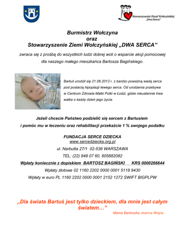 Burmistrz Wołczyna oraz Stowarzyszenie Ziemi Wołczyńskiej „DWA SERCA” zwraca się z prośbą do wszystkich ludzi dobrej woli o wsparcie akcji pomocowej dla naszego małego mieszkańca Bartosza Bagińskiego. Bartuś urodził się 21.06.2013 r. z bardzo poważną wadą serca pod postacią hipoplazji lewego serca. Od urodzenia przebywa w Centrum Zdrowia Matki Polki w Łodzi, gdzie nieustannie trwa walka o każdy dzień jego życia. Jeżeli chcecie Państwo podzielić się sercem z Bartusiem i pomóc mu w leczeniu oraz rehabilitacji przekażcie 1 % swojego podatku FUNDACJA SERCE DZIECKA www.sercedziecka.org.pl ul. Narbutta 27/1 02-536 WARSZAWA TEL: (22) 848 07 60, 605882082 Wpłaty koniecznie z dopiskiem BARTOSZ BAGIŃSKI KRS 0000266644 Wpłaty złotowe 02 1160 2202 0000 0001 5118 9430 Wpłaty w euro PL 1160 2202 0000 0001 2152 1272 SWIFT BIGPLPW „Dla świata Bartuś jest tylko dzieckiem, dla mnie jest całym światem…” Mama Bartoszka Joanna Wojna