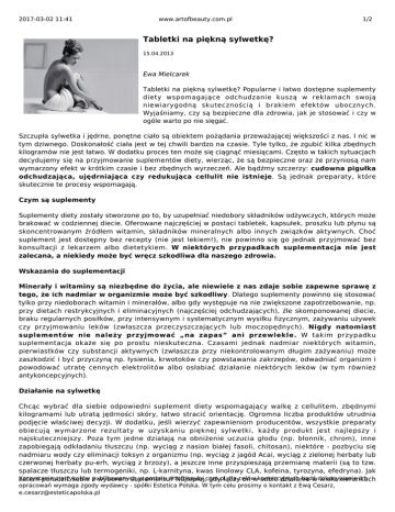 2017-03-02 11:41 www.artofbeauty.com.pl 1/2 Tabletki na piękną sylwetkę? 15.04.2013 Ewa Mielcarek Tabletki na piękną sylwetkę? Popularne i łatwo dostępne suplementy diety wspomagające odchudzanie kuszą w reklamach swoją niewiarygodną skutecznością i brakiem efektów ubocznych. Wyjaśniamy, czy są bezpieczne dla zdrowia, jak je stosować i czy w ogóle warto po nie sięgać. Szczupła sylwetka i jędrne, ponętne ciało są obiektem pożądania przeważającej większości z nas. I nic w tym dziwnego. Doskonałość ciała jest w tej chwili bardzo na czasie. Tyle tylko, że zgubić kilka zbędnych kilogramów nie jest łatwo. W dodatku proces ten może się ciągnąć miesiącami. Często w takich sytuacjach decydujemy się na przyjmowanie suplementów diety, wierząc, że są bezpieczne oraz że przyniosą nam wymarzony efekt w krótkim czasie i bez zbędnych wyrzeczeń. Ale bądźmy szczerzy: cudowna pigułka odchudzająca, ujędrniająca czy redukująca cellulit nie istnieje. Są jednak preparaty, które skutecznie te procesy wspomagają. Czym są suplementy Suplementy diety zostały stworzone po to, by uzupełniać niedobory składników odżywczych, których może brakować w codziennej diecie. Oferowane najczęściej w postaci tabletek, kapsułek, proszku lub płynu są skoncentrowanym źródłem witamin, składników mineralnych albo innych związków aktywnych. Choć suplement jest dostępny bez recepty (nie jest lekiem!), nie powinno się go jednak przyjmować bez konsultacji z lekarzem albo dietetykiem. W niektórych przypadkach suplementacja nie jest zalecana, a niekiedy może być wręcz szkodliwa dla naszego zdrowia. Wskazania do suplementacji Minerały i witaminy są niezbędne do życia, ale niewiele z nas zdaje sobie zapewne sprawę z tego, że ich nadmiar w organizmie może być szkodliwy. Dlatego suplementy powinno się stosować tylko przy niedoborach witamin i minerałów, albo gdy występuje na nie zwiększone zapotrzebowanie, np. przy dietach restrykcyjnych i eliminacyjnych (najczęściej odchudzających), źle skomponowanej diecie, braku regularnych posiłków, przy intensywnym i systematycznym wysiłku fizycznym, zażywaniu używek czy przyjmowaniu leków (zwłaszcza przeczyszczających lub moczopędnych). Nigdy natomiast suplementów nie należy przyjmować „na zapas” ani przewlekle. W takim przypadku suplementacja okaże się po prostu nieskuteczna. Czasami jednak nadmiar niektórych witamin, pierwiastków czy substancji aktywnych (zwłaszcza przy niekontrolowanym długim zażywaniu) może zaszkodzić i być przyczyną np. łysienia, krwotoków czy powstawania zakrzepów, odwadniać organizm i powodować utratę cennych elektrolitów albo osłabiać działanie niektórych leków (w tym również antykoncepcyjnych). Działanie na sylwetkę Chcąc wybrać dla siebie odpowiedni suplement diety wspomagający walkę z cellulitem, zbędnymi kilogramami lub utratą jędrności skóry, łatwo stracić orientację. Ogromna liczba produktów utrudnia podjęcie właściwej decyzji. W dodatku, jeśli wierzyć zapewnieniom producentów, wszystkie preparaty obiecują wymarzone rezultaty w uzyskaniu pięknej sylwetki, każdy produkt jest najlepszy i najskuteczniejszy. Poza tym jedne działają na obniżenie uczucia głodu (np. błonnik, chrom), inne zapobiegają odkładaniu tłuszczu (np. wyciąg z nasion białej fasoli, chitosan), niektóre - pozbyciu się nadmiaru wody czy eliminacji toksyn z organizmu (np. wyciąg z jagód Acai, wyciąg z zielonej herbaty lub czerwonej herbaty pu-erh, wyciąg z brzozy), a jeszcze inne przyspieszają przemianę materii (są to tzw. spalacze tłuszczu lub termogeniki, np. L-karnityna, kwas linolowy CLA, kofeina, tyrozyna, efedryna). Jak Korzystanie z artykułów publikowanych w portalu artofbeauty.com.pl dla celów bądź ich zatem poradzić sobie z wyborem suplementu? Najlepiej, gdy łączy on wkomercyjnych sobie działanie wdokonywanie wielu kierunkach opracowań wymaga zgody wydawcy - spółki Estetica Polska. W tym celu prosimy o kontakt z Ewą Cesarz, [email protected] 2017-03-02 11:41 www.artofbeauty.com.pl 2/2 i odpowiada prawdziwemu zapotrzebowaniu naszego organizmu. Zasady bezpieczeństwa Ponieważ suplementy wspomagające odchudzanie mogą silnie działać na organizm, stosując je należy trzymać się kilku prostych zasad: 1. Decydując się na przyjmowanie suplementów, warto rozważyć zakup specyfiku pochodzącego od renomowanej firmy. Dzięki temu zyskasz większą pewność, że preparat jest dobrej jakości. 2. Przed zakupem postaraj się dowiedzieć o preparacie tak dużo, jak to tylko możliwe. Zapoznaj się z opiniami ekspertów i konsumentów danego produktu oraz przeczytaj uważnie ulotkę. 3. Nie przekraczaj rekomendowanych przez producenta dawek preparatu. Jeśli na ulotce informacyjnej podany jest zakres zalecanych dawek, należy zawsze zacząć od najmniejszej. 4. Przyglądaj się uważnie reakcji swojego organizmu. Jeżeli pojawią się jakieś objawy niepożądane, preparat należy niezwłocznie odstawić. 5. Co jakiś czas zrób sobie przerwę w przyjmowaniu suplementu po to, by ocenić czy preparat przynosi spodziewane efekty. 6. Jeśli zaistnieje potrzeba przyjmowania jakichś leków, zawsze zapytaj lekarza, czy nie ma interakcji między już stosowanymi suplementami, a przepisanymi właśnie preparatami. Skuteczność suplementacji Suplementy mają w sobie olbrzymi potencjał. Mogą się okazać niezwykle skuteczne w walce ze zbędnymi kilogramami i uzyskaniu wymarzonej sylwetki, ale tylko wtedy, gdy zwiększymy aktywność fizyczną i zmienimy sposób odżywiania. Suplementacja w żadnym wypadku nie może stanowić podstawy diety, lecz tylko jej uzupełnienie. Trzeba mieć również świadomość, że nie zawsze i na każdego działają tak samo. Są adresowane do indywidualnych osób o konkretnym zapotrzebowaniu. Dlatego zanim sięgniesz po suplementy wspomagające proces odchudzania, może