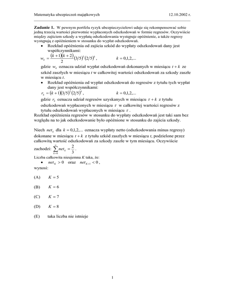 • rozkład opóźnienia wypłat odszkodowań dany był współczynnikami: