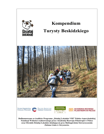 Kompendium Turysty Beskidzkiego Dofinansowano ze środków Programu „Działaj Lokalnie VIII” Polsko-Amerykańskiej Fundacji Wolności realizowanego przez Akademię Rozwoju Filantropii w Polsce oraz Ośrodek Działaj Lokalnie działającym przy Babiogórskim Stowarzyszeniu Zielona Linia w Stryszawie. Logistyka, czyli planujemy wycieczkę zagrożeniem, np. dzikim zwierzęciem, zmianą pogody, głębokimśniegiem lub oblodzonym szlakiem, zmianą pogody. W nagłych przypadkach, np. przy gwałtownej zmianie pogody, zrezygnuj z dalszej wyprawy i podejmij decyzję o powrocie lub gdy to możliwe – udaj się do najbliższego schroniska. Zanim wyruszysz na wyprawę w góry, musisz odpowiednio się do tego przygotować. Nie powinno się tego robić w pośpiechu, ani w dniu wycieczki. Wtedy najłatwiej jest coś przeoczyć lub o czymś zapomnieć. Pamiętaj o tym, aby zabrane przez Ciebie ubrania oraz wyposażenie były dostosowane do pory roku oraz prognozowanej pogody. Na każdą wycieczkę weź kurtkę przeciwdeszczową nawet, gdy deszcz nie jest zapowiadany. Wybraną przez Ciebie trasę dostosuj do pory roku oraz długości dnia. Zimą i jesienią planuj krótsze wycieczki, gdyż bardzo szybko nastaje zmrok, a wtedy łatwiej możesz się zgubić. Natomiast latem i wiosną możesz pozwolić sobie na dłuższe eskapady bez obawy, że zastanie cię ciemność. Idąc w grupie, nigdy nie zapominaj o osobach ze słabszą kondycją. Staraj się dostosować tempo marszu do umiejętności najsłabszego uczestnika, aby nikt nie został w tyle. Szczególnie zwracaj na to uwagę, gdy w wycieczce uczestniczą dzieci, dla których strome podejścia mogą być zbyt męczące. Planując wycieczkę, musisz pamiętać o uwzględnieniu ewentualnej zmiany trasy spowodowanej jakimś Koniecznie przed wyruszeniem w góry sprawdź prognozę pogody, by móc właściwie przygotować się do wędrówki. Prognozę sprawdzaj dzień przed wycieczką i z wielu źródeł (zwłaszcza internetowych), gdyż wtedy najdokładniej określisz, w jakich warunkach będziesz wędrować. Na wycieczkę wyruszaj jak najwcześniej. Dzięki temu zyskasz więcej czasu na marsz, odpoczynki, nieprzewidziane okoliczności oraz nie będziesz mieć obaw, że nie uda ci się dotrzeć do celu przed zmrokiem. Przed rozpoczęciem wycieczki w góry, poinformuj co najmniej jedną osobę o trasie wycieczki oraz o godzinie jej zakończenia. Po osiągnięciu celu skontaktuj się z tą osobą. Nie zapomnij poinformować jej również o każdej zmianie Twoich planów. Zapamiętaj! Staranne zaplanowanie wycieczki zapobiega przykrym niespodziankom na szlaku. 2 Rewia mody, czyli jak się ubrać cechą charakterystyczną powinna być dobra przyczepność do podłoża. Dobierając obuwie, pamiętaj o ich przeznaczeniu. Przy zakupie zwróć uwagę na membranę, podeszwę, wysokość cholewki, a także co najważniejsze na ogólny komfort noszenia. Wybierając się w góry musisz pamiętać o odpowiednim ubiorze. Ubierz się uwzględniając możliwość zmiany pogody. Najlepsza jest metoda na przysłowiową ,,cebulkę”. Pamiętaj, by odzieży turystycznej nie kupować w ostatniej chwili. Łatwo wtedy o pomyłkę a zazwyczaj zakup jest wówczas przepłacony. Sam dobór butów to nie wszystko, pamiętaj o odpowiednich skarpetach, unikając tych ze sztucznych włókien, a wybierając np. te z włóknami bambusowymi. W razie potrzeby zabierz z sobą stuptuty (ochraniacze). Dzięki nim Twoje spodnie i buty pozostaną suche, a śnieg, deszcz czy błoto mniej będą przeszkadzać w wędrówce. Ponieważ w górach pogoda zmienić się może bardzo szybko, zawsze zabieraj pelerynę lub kurtkę przeciwdeszczową. Wędrując jesienią i zimą, pamiętaj o rękawiczkach i czapce. Przez głowę i dłonie nasz organizm traci najwięcej ciepła. Wybierając się na wycieczkę, możesz również zabrać kijki trekkingowe. Zapewnią one stabilność w trakcie wędrówki, odciążą stawy kolanowe, a przede wszystkim ułatwią wchodzenie i schodzenie po stromym stoku zwłaszcza, gdy dźwigasz ciężki plecak. Kurtka (z kapturem) powinna łączyć w sobie wiele elementów, np. wodoodporność, oddychalność i ochronę przed wiatrem, co w górach jest bardzo ważne w okresie późnej jesieni i zimą. Weź ze sobą polar (jeżeli Twoja kurtka nie posiada go po wewnętrznej stronie lub nie jest odpinany) lub bluzę. Ważnym elementem odzieży jest bielizna termoaktywna. Materiał, z którego jest wykonana ma na zadaniu odprowadzenie nadmiaru wilgoci, która występuje w postaci potu, ma na celu zapobieganie wychładzania się skóry i utraty ciepła. Zapewni Ci ona ciepło bliżej skóry. Spodnie powinny być z materiałów wielostrefowych, które nie utrudnią Ci ruchów i zapewnią komfort podczas wędrówki. Najlepiej sprawdzą się te z regulowanymi nogawkami. Buty, w których będziesz wędrować muszą być wygodne, a ich Zapamiętaj! Ekwipunek może być na „wagę złota”, a czasem i życia. 3 Pakowanie z głową, czyli co włożyć do plecaka Trudno wyobrazić sobie wycieczkę w góry bez plecaka. Jego wielkość powinna zależeć od długości wycieczki i ilości zabranego wyposażenia. Plecaki 20-30 litrowe są odpowiednie na jednodniowe wycieczki, 40-litrowe – na dwudniowe wycieczki, a te 50-80 litrowe – na dłuższe eskapady. się zgubić, zabierz ze sobą mapę oraz przewodnik. Gdy nie będziesz pewny, czy idziesz dobrym szlakiem, będziesz mógł sprawdzić to na mapie. Dodatkowo miej przy sobie kompas lub GPS, dzięki którym łatwo określisz kierunek, w którym zmierzasz i określisz swoje położenie. W Twoim plecaku nie powinno zabraknąć latarki. Zwłaszcza zimą, na szlaku może zastać cię zmrok, wtedy na pewno ci się przyda. Pamiętaj też o dodatkowych bateriach. Przy niskich temperaturach, baterie szybko się wyczerpują. W górach przydać się mogą również zapałki lub zapalniczka. Gdy się zgubisz, zastanie cię noc i nie będziesz mie