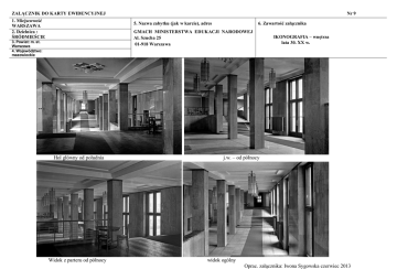 ZAŁĄCZNIK DO KARTY EWIDENCYJNEJ 1. Miejscowość WARSZAWA 2. Dzielnica : ŚRÓDMIEŚCIE Nr 9 6. Zawartość załącznika 5. Nazwa zabytku (jak w karcie), adres GMACH MINISTERSTWA EDUKACJI NARODOWEJ Al. Szucha 25 01-918 Warszawa 3. Powiat: m. st. Warszawa 4. Województwo: mazowieckie Hol główny od południa Widok z parteru od północy IKONOGRAFIA – wnętrza lata 30. XX w. j.w. – od północy widok ogólny Oprac. załącznika: Iwona Sygowska czerwiec 2013 Klatka schodowa północna Wejście do poczekalni na I p. od południa hol północny, schody i wejście do poczekalni przy Sali konferencyjnej na 2 p. poczekalnia na I p. Opracowanie załącznika: Iwona Sygowska czerwiec 2013