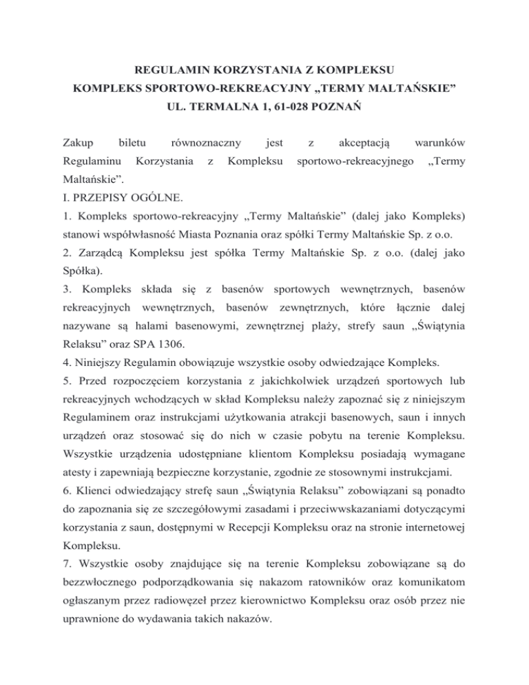 REGULAMIN KORZYSTANIA Z KOMPLEKSU KOMPLEKS SPORTOWO-REKREACYJNY „TERMY MALTAŃSKIE” UL. TERMALNA 1, 61-028 POZNAŃ Zakup biletu Regulaminu równoznaczny Korzystania z jest Kompleksu z akceptacją sportowo-rekreacyjnego warunków „Termy Maltańskie”. I. PRZEPISY OGÓLNE. 1. Kompleks sportowo-rekreacyjny „Termy Maltańskie” (dalej jako Kompleks) stanowi współwłasność Miasta Poznania oraz spółki Termy Maltańskie Sp. z o.o. 2. Zarządcą Kompleksu jest spółka Termy Maltańskie Sp. z o.o. (dalej jako Spółka). 3. Kompleks składa się z basenów sportowych wewnętrznych, basenów rekreacyjnych wewnętrznych, basenów zewnętrznych, które łącznie dalej nazywane są halami basenowymi, zewnętrznej plaży, strefy saun „Świątynia Relaksu” oraz SPA 1306. 4. Niniejszy Regulamin obowiązuje wszystkie osoby odwiedzające Kompleks. 5. Przed rozpoczęciem korzystania z jakichkolwiek urządzeń sportowych lub rekreacyjnych wchodzących w skład Kompleksu należy zapoznać się z niniejszym Regulaminem oraz instrukcjami użytkowania atrakcji basenowych, saun i innych urządzeń oraz stosować się do nich w czasie pobytu na terenie Kompleksu. Wszystkie urządzenia udostępniane klientom Kompleksu posiadają wymagane atesty i zapewniają bezpieczne korzystanie, zgodnie ze stosownymi instrukcjami. 6. Klienci odwiedzający strefę saun „Świątynia Relaksu” zobowiązani są ponadto do zapoznania się ze szczegółowymi zasadami i przeciwwskazaniami dotyczącymi korzystania z saun, dostępnymi w Recepcji Kompleksu oraz na stronie internetowej Kompleksu. 7. Wszystkie osoby znajdujące się na terenie Kompleksu zobowiązane są do bezzwłocznego podporządkowania się nakazom ratowników oraz komunikatom ogłaszanym przez radiowęzeł przez kierownictwo Kompleksu oraz osób przez nie uprawnione do wydawania takich nakazów. 8. Osoby przebywające na terenie Kompleksu, naruszające porządek publiczny, dobre obyczaje, w tym używające wulgaryzmów, stwarzające zagrożenie dla innych osób przebywających w obiekcie, a także osoby nie stosujące się do przepisów niniejszego Regulaminu, do zaleceń służb porządkowych, pracowników obsługi, a w szczególności ratowników, będą usunięte z terenu Kompleksu bez prawa zwrotu wcześniej uiszczonych opłat. 9. Na terenie Kompleksu obowiązuje zakaz: a. palenia papierosów i spożywania napojów alkoholowych, używania zakazanych środków psychotropowych lub innych środków odurzających, b. wnoszenia ostrych narzędzi oraz innych przedmiotów niebezpiecznych, c. wnoszenia żywności lub innych towarów w opakowaniach szklanych, d. wprowadzania i przebywania zwierząt, e. przebywania w miejscach nieprzeznaczonych dla odwiedzających, w szczególności w miejscach, w których istnieją elementy konstrukcyjne lub instalacje zapewniające funkcjonowanie Kompleksu, f. wstępu osób, których stan wskazuje na spożycie alkoholu, środków psychotropowych lub innych środków odurzających oraz zachowujących się w sposób agresywny lub zagrażający bezpieczeństwu pozostałych gości. 10. Kompleks jest monitorowany w sposób ciągły w celu zapewnienia bezpieczeństwa jego klientom oraz mieniu zarówno przez nich wniesionemu na teren Kompleksu, jak i mieniu Spółki. Urządzenia monitorujące nie zostały zainstalowane w miejscach, w których naruszałyby dobra osobiste osób odwiedzających Kompleks, tj. w toaletach, salach prysznicowych, przebieralniach i saunach. 11. a. Klienci odwiedzający monitorowanie Kompleks, własnego wyrażają w nim zgodę na: pobytu, b. wykorzystanie zapisów monitoringu w przypadku kwestii spornych, dotyczących m.in. uregulowania opłat za korzystanie z usług oferowanych w Kompleksie lub zachowania się zgodnego z Regulaminem. 12. Nagrywanie filmów oraz robienie zdjęć dozwolone jest wyłącznie w celach prywatnych. Spółka nie ponosi odpowiedzialności za naruszenie dóbr osobistych, m.in. poprzez upublicznienie wizerunku, przez osoby trzecie w tym klientów Kompleksu. 13. Na terenie Kompleksu zabrania się prowadzenia działalności komercyjnej i akwizycyjnej bez uzyskania uprzednio pisemnej zgody Zarządcy Kompleksu, jak też bez posiadania stosownych pozwoleń w tym zakresie. 14. W razie jakichkolwiek wątpliwości co do okoliczności mogących mieć wpływ na przebywanie odwiedzającego w Kompleksie, klient może zwrócić się o pomoc do Biura Obsługi Klienta / Recepcji (obsługa Kompleksu), znajdującej się na parterze Kompleksu. 15. Podstawą wstępu dla widzów uczestniczących w imprezach i wydarzeniach odbywających się w hali basenów sportowych Kompleksu jest ważny bilet wstępu lub zaproszenie, o ile organizator nie zadecyduje inaczej. Każdy wchodzący na teren hali basenów sportowych zobowiązany jest do okazania służbie porządkowej i informacyjnej swojego biletu wstępu lub zaproszenia. 15.1 a. Bilet zajęcia wstępu lub miejsca zaproszenie określonego na upoważnia bilecie posiadacza lub do: zaproszeniu, b. korzystania z bazy gastronomicznej przygotowanej w ramach imprezy bądź wydarzenia, c. korzystania z szatni i WC. 15.2 Posiadacz ważnego biletu lub zaproszenia jest zobowiązany do: a. zachowania się zgodnie z regulaminem obiektu, zarządzeniami policji, straży pożarnej, służb porządkowych i informacyjnych oraz zaleceniami prowadzącego imprezę, b. korzystania wyłącznie z wejść na obiekt i wyjść z niego w miejscach wyznaczonych do tego celu, c. poruszania się w Kompleksie wytyczonym ciągiem komunikacyjnym, d. okazania na wezwanie służby porządkowej zawartości posiadanego bagażu. 15.3 Bilet wstępu na imprezy lub wydarzenia organizowane w hali basenów sportowych nie upoważnia do wstępu do innych stref obiektu i korzystania z usług oferowanych w Kompleksie. II. ZASADY KORZYSTANIA Z HAL BASENOWYCH 1. Przed wejściem na halę basenową należy zdjąć biżuterię lub innego rodzaju akcesoria, które łatwo utracić podczas aktywności w 