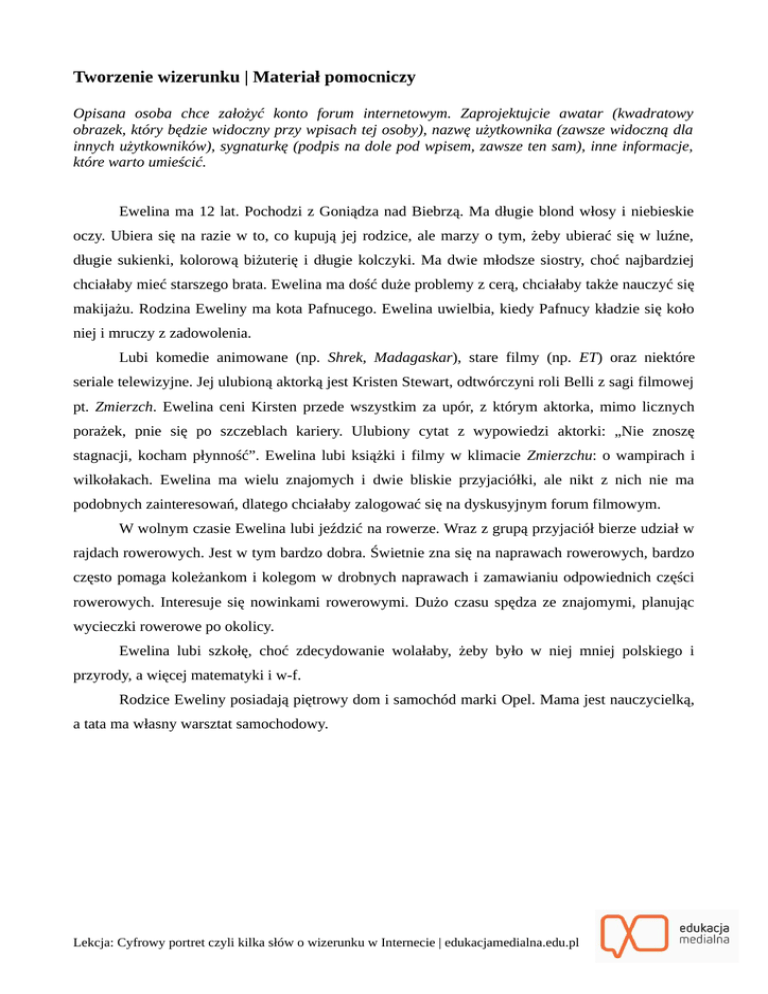 Tworzenie wizerunku | Materiał pomocniczy Opisana osoba chce założyć konto forum internetowym. Zaprojektujcie awatar (kwadratowy obrazek, który będzie widoczny przy wpisach tej osoby), nazwę użytkownika (zawsze widoczną dla innych użytkowników), sygnaturkę (podpis na dole pod wpisem, zawsze ten sam), inne informacje, które warto umieścić. Ewelina ma 12 lat. Pochodzi z Goniądza nad Biebrzą. Ma długie blond włosy i niebieskie oczy. Ubiera się na razie w to, co kupują jej rodzice, ale marzy o tym, żeby ubierać się w luźne, długie sukienki, kolorową biżuterię i długie kolczyki. Ma dwie młodsze siostry, choć najbardziej chciałaby mieć starszego brata. Ewelina ma dość duże problemy z cerą, chciałaby także nauczyć się makijażu. Rodzina Eweliny ma kota Pafnucego. Ewelina uwielbia, kiedy Pafnucy kładzie się koło niej i mruczy z zadowolenia. Lubi komedie animowane (np. Shrek, Madagaskar), stare filmy (np. ET) oraz niektóre seriale telewizyjne. Jej ulubioną aktorką jest Kristen Stewart, odtwórczyni roli Belli z sagi filmowej pt. Zmierzch. Ewelina ceni Kirsten przede wszystkim za upór, z którym aktorka, mimo licznych porażek, pnie się po szczeblach kariery. Ulubiony cytat z wypowiedzi aktorki: „Nie znoszę stagnacji, kocham płynność”. Ewelina lubi książki i filmy w klimacie Zmierzchu: o wampirach i wilkołakach. Ewelina ma wielu znajomych i dwie bliskie przyjaciółki, ale nikt z nich nie ma podobnych zainteresowań, dlatego chciałaby zalogować się na dyskusyjnym forum filmowym. W wolnym czasie Ewelina lubi jeździć na rowerze. Wraz z grupą przyjaciół bierze udział w rajdach rowerowych. Jest w tym bardzo dobra. Świetnie zna się na naprawach rowerowych, bardzo często pomaga koleżankom i kolegom w drobnych naprawach i zamawianiu odpowiednich części rowerowych. Interesuje się nowinkami rowerowymi. Dużo czasu spędza ze znajomymi, planując wycieczki rowerowe po okolicy. Ewelina lubi szkołę, choć zdecydowanie wolałaby, żeby było w niej mniej polskiego i przyrody, a więcej matematyki i w-f. Rodzice Eweliny posiadają piętrowy dom i samochód marki Opel. Mama jest nauczycielką, a tata ma własny warsztat samochodowy. Lekcja: Cyfrowy portret czyli kilka słów o wizerunku w Internecie | edukacjamedialna.edu.pl