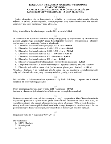 REGULAMIN WYDAWANIA POSIŁKÓW W STOŁÓWCE CHARYTATYWNEJ CARITAS KIELECKA ZESPÓŁ PLACÓWEK OPIEKUŃCZOLECZNICZYCH W MIECHOWIE Z DNIA 02.12.2015 r. §1 Osoby ubiegające się o korzystanie z obiadów z częściową odpłatnością składają OŚWIADCZENIE ( wzór załącznik ) w którym podają swój adres zamieszkania lub odcinek emerytury czy renty zawierający dane adresowe. §2 Pełny koszt obiadu dwudaniowego w roku 2015 wynosi - 9,00zł §3 W zależności od wysokości dochodu osoby ubiegającej się wprowadza się zróżnicowany poziom „częściowego pokrycia” przez beneficjentów kosztów przygotowania obiadów wydawanych przez stołówkę Caritas w Miechowie: 1. Dla osób o dochodach netto powyżej 1.500 zł m-c –9,00 zł 2. Dla osób o dochodach netto od 1.300- 1.500 zł m-c –8,00 zł 3. Dla osób o dochodach netto od 1.000- 1.300 zł m-c –7,00 zł 4. Dla osób o dochodach netto od 600 – 1.000 zł m-c –6,00 zł 5. Dla osób o dochodach netto od 400 - 600 zł m-c – 5,00 zł 6. Dla osób o dochodach netto do 400 zł m-c - 4,00 zł 7. Dla osób w szczególnie trudnej sytuacji potwierdzonej podaniem – 3,00zł 8. Dla podopiecznych ŚDS i osób kierowanych – zgodnie z umową z GOPS Miechów 9. Dla małych dzieci i uczniów szkół (podstawowa, gimnazjum i średnia) – 5,00 zł Wysokość dochodu ( za wyjątkiem pkt.9) ustala się na podstawie oświadczenia(wzór załącznik) lub odcinka emerytury czy renty osób korzystających ze stołówki §4 Dla obiadów z dofinansowaniem wprowadza się limit ilościowy i wynosi on 1 obiad dziennie na 1 osobę ubiegającą się. §5 Pełny koszt przygotowania zupy w roku 2015 wysokości- 1,80 zł Jest ona wydawana w jednej cenie bez różnicowania ze względu na dochód. §6 Dokumenty (oświadczenie, odcinek emerytury, renty) są sposobem klasyfikowania osób do wydawania posiłków i są one ważne przez okres od dnia złożenia do końca roku 2015, za wyjątkiem sytuacji gdy nastąpi udokumentowana utrata lub znaczy (30%) wzrost dochodu. Osoby bezdomne i o szczególnie niskich dochodach mogą korzystać z zup darmowych, lub na podstanie indywidualnych decyzji Kierownika Biura z darmowych obiadów pełnych. §7 Regulamin wchodzi w życie dnia 01.01.2016r. Do wiadomości : 1. GOPS Miechów 2. Beneficjenci 3. a/a załącznik do Regulaminu wydawania posiłków w Stołówce Caritas Miechów Miechów dnia................................. OŚWIADCZENIE Ja......................................................................................... niżej podpisany, zamieszkały w Imię i nazwisko .....................................................................................OŚWIADCZAM, iż moje dochody netto za ostatnie trzy miesiące wyniosły.........................................zł: słownie …............................. ............................................................................ (co potwierdzam okazaniem odcinka renty lub emerytury lub innym dokumentem) ......................................... podpis składającego