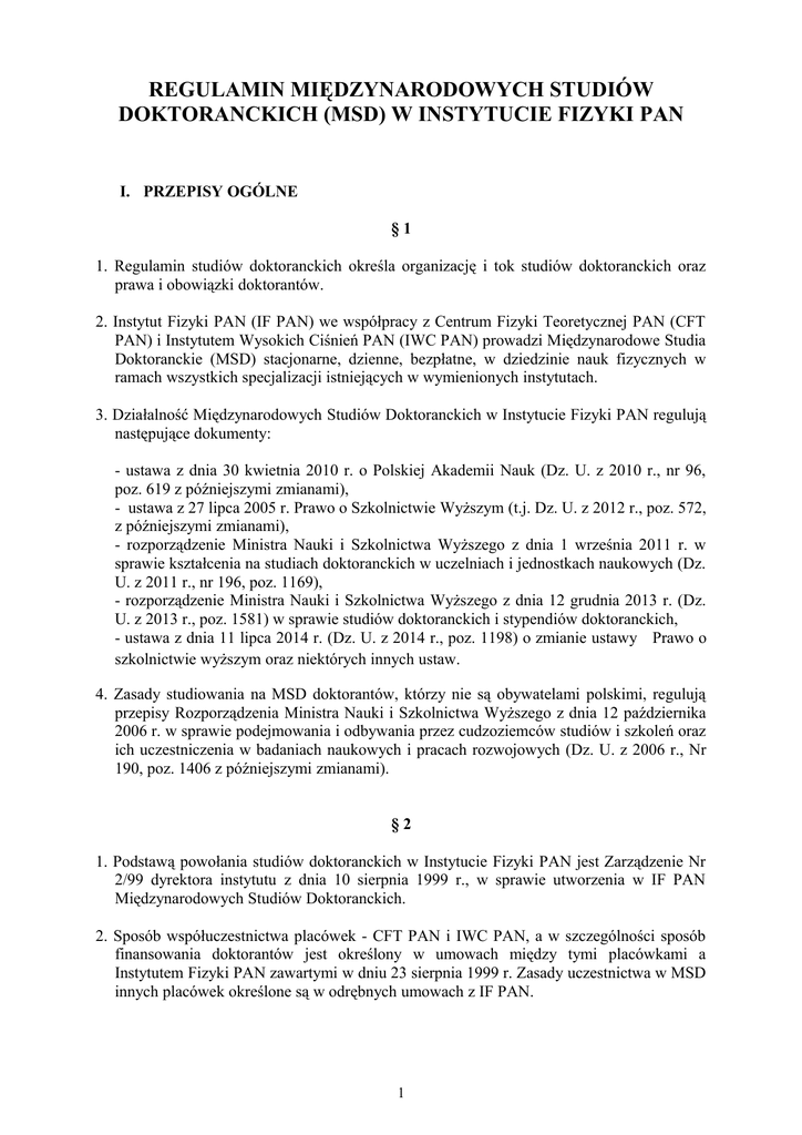 REGULAMIN MIĘDZYNARODOWYCH STUDIÓW DOKTORANCKICH (MSD) W INSTYTUCIE FIZYKI PAN I. PRZEPISY OGÓLNE §1 1. Regulamin studiów doktoranckich określa organizację i tok studiów doktoranckich oraz prawa i obowiązki doktorantów. 2. Instytut Fizyki PAN (IF PAN) we współpracy z Centrum Fizyki Teoretycznej PAN (CFT PAN) i Instytutem Wysokich Ciśnień PAN (IWC PAN) prowadzi Międzynarodowe Studia Doktoranckie (MSD) stacjonarne, dzienne, bezpłatne, w dziedzinie nauk fizycznych w ramach wszystkich specjalizacji istniejących w wymienionych instytutach. 3. Działalność Międzynarodowych Studiów Doktoranckich w Instytucie Fizyki PAN regulują następujące dokumenty: - ustawa z dnia 30 kwietnia 2010 r. o Polskiej Akademii Nauk (Dz. U. z 2010 r., nr 96, poz. 619 z późniejszymi zmianami), - ustawa z 27 lipca 2005 r. Prawo o Szkolnictwie Wyższym (t.j. Dz. U. z 2012 r., poz. 572, z późniejszymi zmianami), - rozporządzenie Ministra Nauki i Szkolnictwa Wyższego z dnia 1 września 2011 r. w sprawie kształcenia na studiach doktoranckich w uczelniach i jednostkach naukowych (Dz. U. z 2011 r., nr 196, poz. 1169), - rozporządzenie Ministra Nauki i Szkolnictwa Wyższego z dnia 12 grudnia 2013 r. (Dz. U. z 2013 r., poz. 1581) w sprawie studiów doktoranckich i stypendiów doktoranckich, - ustawa z dnia 11 lipca 2014 r. (Dz. U. z 2014 r., poz. 1198) o zmianie ustawy Prawo o szkolnictwie wyższym oraz niektórych innych ustaw. 4. Zasady studiowania na MSD doktorantów, którzy nie są obywatelami polskimi, regulują przepisy Rozporządzenia Ministra Nauki i Szkolnictwa Wyższego z dnia 12 października 2006 r. w sprawie podejmowania i odbywania przez cudzoziemców studiów i szkoleń oraz ich uczestniczenia w badaniach naukowych i pracach rozwojowych (Dz. U. z 2006 r., Nr 190, poz. 1406 z późniejszymi zmianami). §2 1. Podstawą powołania studiów doktoranckich w Instytucie Fizyki PAN jest Zarządzenie Nr 2/99 dyrektora instytutu z dnia 10 sierpnia 1999 r., w sprawie utworzenia w IF PAN Międzynarodowych Studiów Doktoranckich. 2. Sposób współuczestnictwa placówek - CFT PAN i IWC PAN, a w szczególności sposób finansowania doktorantów jest określony w umowach między tymi placówkami a Instytutem Fizyki PAN zawartymi w dniu 23 sierpnia 1999 r. Zasady uczestnictwa w MSD innych placówek określone są w odrębnych umowach z IF PAN. 1 II. POSTĘPOWANIE REKRUTACYJNE §3 1. Do studiowania na studiach doktoranckich może być dopuszczona osoba, która posiada kwalifikacje drugiego stopnia lub jest beneficjentem programu „Diamentowy Grant”, o którym mowa w art. 187a ust. 1, (Dz. U. z 2014 r., poz. 1198), po złożeniu wymaganych dokumentów i rozmowie kwalifikacyjnej zakończonej wynikiem pozytywnym. 2. Rekrutacja na studia doktoranckie odbywa się w drodze konkursu. Warunki i tryb rekrutacji na studia określa Rada Naukowa IF PAN w formie uchwały, którą podaje do publicznej wiadomości na stronie internetowej IF PAN nie później niż do 30 kwietnia roku poprzedzającego rok akademicki, którego uchwała dotyczy. 3. Postępowanie rekrutacyjne przeprowadza komisja rekrutacyjna powołana przez dyrektora instytutu. Komisja rekrutacyjna podejmuje decyzje w sprawach przyjęcia na studia doktoranckie. 4. Od decyzji komisji rekrutacyjnej służy odwołanie, w terminie czternastu dni od dnia doręczenia decyzji, do dyrektora instytutu. Podstawą odwołania może być jedynie wskazanie naruszenia warunków i trybu rekrutacji na studia doktoranckie, o których mowa w ust. 2. Decyzja dyrektora instytutu jest ostateczna. III. ORGANIZACJA MIĘDZYNARODOWYCH STUDIÓW DOKTORANCKICH §4 1. Nadzór merytoryczny nad działalnością studiów doktoranckich sprawuje Rada Naukowa IF PAN. W szczególności Rada Naukowa: - uchwala warunki i tryb rekrutacji uczestników studiów, - uchwala regulamin i ramowy program studiów doktoranckich, - określa odpowiednio do potrzeb instytutu preferencyjne kierunki kształcenia, - opiniuje zgłoszoną przez dyrektora kandydaturę na Kierownika MSD, - opiniuje i przyjmuje coroczne sprawozdanie Kierownika MSD z działalności studium, - powołuje Radę Programową Międzynarodowych Studiów Doktoranckich. 2. Rada Programowa opracowuje ramowy program studiów, opiniuje celowość wykładów i sposobów kształcenia doktorantów proponowanych przez Kierownika MSD oraz przedstawia własne propozycje w tym zakresie. §5 1. Międzynarodowymi Studiami Doktoranckimi Studiami kieruje kierownik, którego powołuje i odwołuje dyrektor instytutu po zasięgnięciu opinii Rady Naukowej oraz samorządu doktorantów. Samorząd doktorantów wyraża opinię w terminie 14 dni od dnia otrzymania wniosku o jej wydanie. 2. Kierownikiem MSD może być osoba posiadająca stopień naukowy co najmniej doktora habilitowanego, zatrudniona w IF PAN w pełnym wymiarze czasu pracy. 2 3. Kierownik Międzynarodowych Studiów Doktoranckich: - przedstawia Radzie Naukowej projekty regulaminu i programu studiów, - współpracuje z Radą Programową Międzynarodowych Studiów Doktoranckich, - organizuje realizację programu studiów doktoranckich, - dokonuje oceny realizacji studiów doktoranckich oraz prowadzenia badań naukowych przez doktorantów poprzez kontrolę rocznych sprawozdań, planów pracy i corocznych ocen doktorantów przez ich opiekunów naukowych, - pełni funkcję przewodniczącego komisji doktoranckiej, - ogłasza nabór kandydatów na studia doktoranckie, - czuwa nad przestrzeganiem regulaminu studiów, - zalicza uczestnikom MSD kolejne lata studiów, - podejmuje decyzje w sprawie przedłużenia studiów doktoranckich w przypadkach wymienionych w §13, - podejmuje decyzje o skreśleniu z listy doktorantów, - raz w roku przedstawia Radzie Naukowej sprawozdanie z działalności MSD. 4. Dyrektor IF PAN rozpatruje zastrzeżenia i odwołania doktorantów od decyzji i ocen kierownika MSD. §6 1. Bezpośrednim przełożonym doktoranta jest jego opiekun naukowy. 2. Opiekunem naukowym/pro