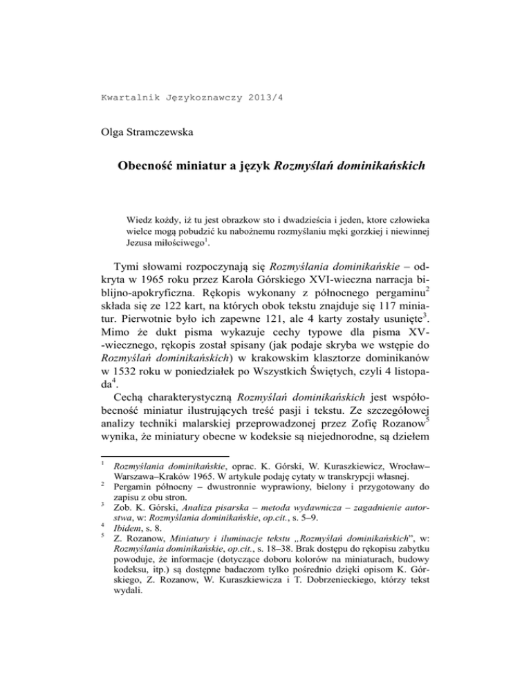 Kwartalnik Językoznawczy 2013/4 Olga Stramczewska Obecność miniatur a język Rozmyślań dominikańskich Wiedz kożdy, iż tu jest obrazkow sto i dwadzieścia i jeden, ktore człowieka wielce mogą pobudzić ku nabożnemu rozmyślaniu męki gorzkiej i niewinnej Jezusa miłościwego1. Tymi słowami rozpoczynają się Rozmyślania dominikańskie – odkryta w 1965 roku przez Karola Górskiego XVI-wieczna narracja biblijno-apokryficzna. Rękopis wykonany z północnego pergaminu2 składa się ze 122 kart, na których obok tekstu znajduje się 117 miniatur. Pierwotnie było ich zapewne 121, ale 4 karty zostały usunięte 3. Mimo że dukt pisma wykazuje cechy typowe dla pisma XV-wiecznego, rękopis został spisany (jak podaje skryba we wstępie do Rozmyślań dominikańskich) w krakowskim klasztorze dominikanów w 1532 roku w poniedziałek po Wszystkich Świętych, czyli 4 listopada4. Cechą charakterystyczną Rozmyślań dominikańskich jest współobecność miniatur ilustrujących treść pasji i tekstu. Ze szczegółowej analizy techniki malarskiej przeprowadzonej przez Zofię Rozanow5 wynika, że miniatury obecne w kodeksie są niejednorodne, są dziełem 1 2 3 4 5 Rozmyślania dominikańskie, oprac. K. Górski, W. Kuraszkiewicz, Wrocław– Warszawa–Kraków 1965. W artykule podaję cytaty w transkrypcji własnej. Pergamin północny – dwustronnie wyprawiony, bielony i przygotowany do zapisu z obu stron. Zob. K. Górski, Analiza pisarska – metoda wydawnicza – zagadnienie autorstwa, w: Rozmyślania dominikańskie, op.cit., s. 5–9. Ibidem, s. 8. Z. Rozanow, Miniatury i iluminacje tekstu „Rozmyślań dominikańskich”, w: Rozmyślania dominikańskie, op.cit., s. 18–38. Brak dostępu do rękopisu zabytku powoduje, że informacje (dotyczące doboru kolorów na miniaturach, budowy kodeksu, itp.) są dostępne badaczom tylko pośrednio dzięki opisom K. Górskiego, Z. Rozanow, W. Kuraszkiewicza i T. Dobrzenieckiego, którzy tekst wydali. Olga Stramczewska, Obecność miniatur a język Rozmyślań… 60 dwóch autorów. 33 przypisywane są pierwszemu z nich, a 84 – drugiemu. Ich rozmieszczenie przedstawia się tak, że do strony 75 rękopisu znajduje się 30 miniatur pierwszego autora i 4 drugiego. W drugiej części znajduje się 80 miniatur drugiego autora i jedna (na stronie 235) pierwszego6. Prawie wszystkie miniatury zajmują stronę recto kart. Jako cechy typowe dla pierwszego z miniaturzystów wskazuje się: indywidualizowanie postaci, przedstawianie wydarzeń na różnorodnym tle, stosowanie gamy kolorystycznej o żywej tonacji, liczne kontrasty7. Rozanow zwraca uwagę, że wiele motywów wykorzystanych przez pierwszego iluminatora powtarza się, np. w Małej pasji, Dużej pasji, czy też Żywocie Marii Albrehta Dürera8, a także w Mszale9 Erazma Ciołka. Ryc 1. Rozmyślania dominikańskie. Źródło: Rozmyślania dominikańskie, oprac. K. Górski, W. Kuraszkiewicz, Wrocław 1965, s. 63 6 7 8 9 Ibidem, s. 18. Z. Rozanow, op.cit., s. 24–30. Zebrane drzeworyty A. Dürera, http://en.wikipedia.org/wiki/List_of_woodcuts_ by_D%C3%BCrer, [dostęp: 12.02.2014]. Erazm Ciołek, Mszał, http://www.polona.pl/search/5a767490-930c-11e3-b768958bcdb2956e/, [dostęp: 12.02.2014]. Olga Stramczewska, Obecność miniatur a język Rozmyślań… 61 Ryc. 2. Mszał, Erazm Ciołek. Źródło: http://www.polona.pl/item/7651562/110/, k. 51 Cechami charakterystycznymi dla stylu drugiego miniaturzysty są według historyków sztuki10: naturalistyczne przedstawienia postaci, dynamika ruchu, wyraźny, czarny kontur, lokalnie kładziona barwa i zawężona skala kolorystyczna. Rozanow wskazuje niektóre źródła inspiracji także dla drugiego miniaturzysty11. To przede wszystkim cykl drzeworytów z Żywota Pana Jezu Krysta Baltazara Opeca12. Ryc. 3. Rozmyślania dominikańskie. Źródło: Rozmyślania dominikańskie, oprac. K. Górski, W. Kuraszkiewicz, Wrocław 1965, s. 201 10 11 12 Z. Rozanow, op.cit., 30–36. Ibidem, s. 35. B. Opec, Żywot Pana Jezu Krysta, http://www.polona.pl/item/11678764/1/, [dostęp: 12.02.2014]. Olga Stramczewska, Obecność miniatur a język Rozmyślań… 62 Ryc. 4. Żywot Pana Jezu Krysta, Baltazar Opec. Źródło: http://www.polona.pl/item/11678764/208/, k. 208 Hieronim Wietor zilustrował Żywot pana Jezu Krysta Baltazara Opeca z 1522 roku cyklem 29 drzeworytów ze Speculum passionis domini nostri Ihesu Christi Ulryka Pindera13. Bardzo wcześnie w średniowieczu zaczęto wykorzystywać siłę oddziaływania obrazu w celu kształcenia ludności i przekazywania im historii biblijnej. Była to tzw. biblia pauperum, czyli – w dużym uproszczeniu – biblia ubogich. Nie towarzyszył jej jednak zapisany tekst, a obraz musiał być samowystarczalny. Także niektóre średniowieczne historiae passionis ozdabiano ilustracjami, które miały unaocznić odbiorcy to, o czym jest mowa w tekście. Przykładem mogą być Medytacje Jana de Caulibus, w których autor pisze, że dzięki obrazom można wyobrazić sobie wydarzenia tak, jakby się było przy nich obecnym14. Podobnie na ten temat wypowiada się np. Ludolf z Saksonii15 czy też Piotr z Alkantary16. 13 14 15 16 T. Dobrzeniecki, Wybrane zagadnienia ikonografii pasyjnej w sztuce polskiej, w: Męka Chrystusa wczoraj i dziś, red. H.D. Wojtyska, J.J. Kopeć, Lublin 1981, s. 131–151. Zob. T. Dobrzeniecki, „Rozmyślania dominikańskie” na tle średniowiecznej literatury pasyjnej, w: Rozmyślania dominikańskie, op.cit., s. 41. Necessarium enim erit, ut aliquando ita cogites te praesentem cogitatione tua, ac si tunc temporis ibi praesens fuisses quando passus fuit., cyt. za: T. Dobrzeniecki, „Rozmyślania dominikańskie” na tle…, s. 49. Non vero considera haec tanquam dudum et ante multa saecula gesta, sed Olga Stramczewska, Obecność miniatur a język Rozmyślań… 63 Od momentu odkrycia Rozmyślań dominikańskich utarło się wśród badaczy przekonanie o współzależności obrazu i tekstu17. Celem artykułu