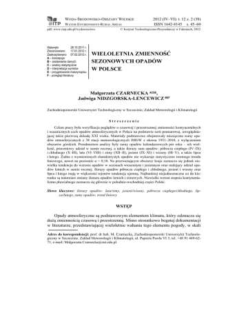 WODA-ŚRODOWISKO-OBSZARY WIEJSKIE WATER-ENVIRONMENT-RURAL AREAS pdf: www.itep.edu.pl/wydawnictwo Wpłynęło 28.10.2011 r. Zrecenzowano 17.01.2012 r. Zaakceptowano 07.02.2012 r. A – koncepcja B – zestawienie danych C – analizy statystyczne D – interpretacja wyników E – przygotowanie maszynopisu F – przegląd literatury 2012 (IV–VI): t. 12 z. 2 (38) ISSN 1642-8145 s. 45–60 © Instytut Technologiczno-Przyrodniczy w Falentach, 2012 WIELOLETNIA ZMIENNOŚĆ SEZONOWYCH OPADÓW W POLSCE Małgorzata CZARNECKA ACDE, Jadwiga NIDZGORSKA-LENCEWICZ BEF Zachodniopomorski Uniwersytet Technologiczny w Szczecinie, Zakład Meteorologii i Klimatologii Streszczenie Celem pracy była weryfikacja poglądów o czasowej i przestrzennej zmienności kontynentalnych i oceanicznych cech opadów atmosferycznych w Polsce na podstawie serii pomiarowej, uwzględniającej także pierwszą dekadę XXI wieku. Materiały podstawowe obejmowały miesięczne sumy opadów atmosferycznych z 38 stacji meteorologicznych IMGW z okresu 1951–2010, z wyłączeniem obszarów górskich. Przedmiotem analizy były sumy opadów kalendarzowych pór roku – ich wielkość, procentowy udział w sumie rocznej, a także ilorazy sum opadów: półrocza ciepłego (IV–IX) i chłodnego (X–III), lata (VI–VIII) i zimy (XII–II), jesieni (IX–XI) i wiosny (III–V), a także lipca i lutego. Żadna z wymienionych charakterystyk opadów nie wykazuje statystycznie istotnego trendu liniowego, nawet na poziomie α = 0,10. Na przeważającym obszarze kraju zaznacza się jednak niewielka tendencja do wzrostu opadów w sezonach wiosennym i jesiennym oraz malejący udział opadów letnich w sumie rocznej. Ilorazy opadów półrocza ciepłego i chłodnego, jesieni i wiosny oraz lipca i lutego mają w większości rejonów tendencję ujemną. Najbardziej niejednoznaczne co do kierunku są natomiast zmiany ilorazu opadów letnich i zimowych. Niewielki wzrost stopnia kontynentalizmu pluwialnego zaznacza się głównie w południo-wschodniej części Polski. Słowa kluczowe: ilorazy opadów: lata/zimy, jesieni/wiosny, półrocza ciepłego/chłodnego, lipca/lutego, sumy opadów, trend liniowy WSTĘP Opady atmosferyczne są podstawowym elementem klimatu, który odznacza się dużą zmiennością czasową i przestrzenną. Mimo stosunkowo bogatej dokumentacji w literaturze, przedstawiającej wieloletnie wahania tego elementu pogody, w skali Adres do korespondencji: prof. dr hab. M. Czarnecka, Zachodniopomorski Uniwersytet Technologiczny w Szczecinie, Zakład Meteorologii i Klimatologii, ul. Papieża Pawła VI 3; tel. +48 91 449-6271, e-mail: [email protected] 46 Woda-Środowisko-Obszary Wiejskie t. 12 z. 2 (38) całego kraju [DEGIRMENDŽIĆ i in. 2004; KIRSCHENSTEIN, BARANOWSKI 2005; KOŻUCHOWSKI 1984; 1996; 2004; MAGER i in. 2009; ZAWORA, ZIERNICKA 2003; ZIERNICKA-WOJTASZEK 2006; ŻMUDZKA 2002; 2009], jak i w regionach, np. BANASZKIEWICZ i in. [2008] i OTOP [2010], zagadnienia te nadal są przedmiotem podejmowanych badań, poniekąd również w związku z możliwością korzystania z coraz dłuższych serii pomiarowych. Poza tym w ostatnich latach, na skutek zniszczeń powodowanych katastrofalnymi powodziami, zainteresowanie opadami atmosferycznymi, ponownie wzrosło. Widocznym przejawem zmian klimatu, potwierdzonym empirycznie również w Polsce, jest postępujące ocieplenie. Ociepleniu, które najsilniej zaznacza się w okresie wiosennym, nie towarzyszą jednak istotne statystycznie zmiany ilości opadów atmosferycznych [ZAWORA, ZIERNICKA 2003; ŻMUDZKA 2009]. W zależności od obserwowanego okresu roczne sumy opadów wykazują nieistotną statystycznie tendencję rosnącą [ŻMUDZKA 2002] bądź malejącą [MAGER i in. 2009]. W ujęciu sezonowym, w minionym półwieczu, niewielki wzrost sum opadów zaznaczył się wiosną i jesienią, a spadek latem i zimą. W ujęciu miesięcznym natomiast, jedynie w marcu obserwuje się statystycznie istotny dodatni trend sum opadów [ŻMUDZKA 2002]. Mimo powyższych faktów, reżim pluwialny w Polsce w ciągu 50 lat (1951–2000) uległ jednak zmianie. Głównym objawem tych przemian jest zmniejszenie udziału sum opadów letnich (czerwiec–sierpień) w sumie rocznej, co – zdaniem DEGIRMENDŽIĆA i in. [2004] – sprawia, że główne cechy klimatu kontynentalnego są coraz mniej widoczne. Mimo braku istotnych trendów, rośnie zmienność opadów [KOŻUCHOWSKI 1996; ZIERNICKA-WOJTASZEK 2006]. Obserwowana zmienność opadów jest w znacznym stopniu wynikiem oddziaływania cyrkulacji atmosferycznej, która decyduje o przewadze wpływów kontynentalnych lub też oceanicznych, kształtując tym samym klimat w skali globalnej i lokalnej [TWARDOSZ i in. 2011]. Obok cyrkulacji atmosferycznej ważnym elementem klimatu, któremu przypisuje się jednocześnie duże znaczenie klimatotwórcze, między innymi w modyfikowaniu efektu cieplarnianego atmosfery, jest również zachmurzenie. Badania ŻMUDZKIEJ [2009] wskazują, że oba czynniki wyjaśniają łącznie do 80% zmienności temperatury powietrza i opadów atmosferycznych. Współczesne prognozy klimatyczne, w tym badania ekspertów IPCC [2007], wskazują, że w Europie Centralnej należy spodziewać się wzrostu opadów zimą, natomiast zmniejszenia latem. Według BORYCZKI i STOPY-BORYCZKI [2004], zimowe sumy opadów atmosferycznych w Warszawie i Krakowie będą w pierwszej połowie XXI wieku oscylować wokół średniej wiekowej. W Warszawie także letnie sumy opadów będą zbliżone do przeciętnych, natomiast w Krakowie – znacznie większe. Mając na uwadze niepewne prognozy zmian opadów, opinie o ich rosnącej zmienności i ekstremalności, będących coraz częściej przyczyną ogromnych strat społecznych, ekonomicznych i przyrodniczych, podjęto próbę weryfikacji poglądów o czasowej i przestrzennej zmienności kontynentalnych i oceanicznych cech sezonowych opadów atmosferycznych w Polsce na podstawie serii pomiarowej, obejmującej tak