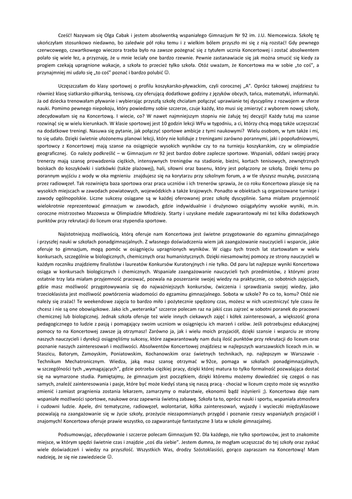 Cześć! Nazywam się Olga Cabak i jestem absolwentką wspaniałego Gimnazjum Nr 92 im. J.U. Niemcewicza. Szkołę tę ukończyłam stosunkowo niedawno, bo zaledwie pół roku temu i z wielkim bólem przyszło mi się z nią rozstać! Gdy pewnego czerwcowego, czwartkowego wieczora trzeba było na zawsze pożegnać się z tytułem ucznia Koncertowej i zostać absolwentem polało się wiele łez, a przyznaję, że u mnie leciały one bardzo rzewnie. Pewnie zastanawiacie się jak można smucić się kiedy za progiem czekają upragnione wakacje, a szkoła to przecież tylko szkoła. Otóż uważam, że Koncertowa ma w sobie „to coś”, a przynajmniej mi udało się „to coś” poznać i bardzo polubić ☺. Uczęszczałam do klasy sportowej o profilu koszykarsko‐pływackim, czyli corocznej „A”. Oprócz takowej znajdziesz tu również klasę siatkarsko‐piłkarską, tenisową, czy oferującą dodatkowe godziny z języków obcych, tańca, matematyki, informatyki. Ja od dziecka trenowałam pływanie i wybierając przyszłą szkołę chciałam połączyć uprawianie tej dyscypliny z rozwojem w sferze nauki. Pomimo pewnego niepokoju, który powiedzmy sobie szczerze, czuje każdy, kto musi się zmierzyć z wyborem nowej szkoły, zdecydowałam się na Koncertową. I wiecie, co? W nawet najmniejszym stopniu nie żałuję tej decyzji! Każdy tutaj ma szanse rozwinąć się w wielu kierunkach. W klasie sportowej jest 10 godzin lekcji WFu w tygodniu, a ci, którzy chcą mogą także uczęszczać na dodatkowe treningi. Nasuwa się pytanie, jak połączyć sportowe ambicje z tymi naukowymi? Wielu osobom, w tym także i mi, to się udało. Dzięki świetnie ułożonemu planowi lekcji, który nie koliduje z treningami zarówno porannymi, jaki i popołudniowymi, sportowcy z Koncertowej mają szanse na osiągnięcie wysokich wyników czy to na turnieju koszykarskim, czy w olimpiadzie geograficznej. Co należy podkreślić – w Gimnazjum nr 92 jest bardzo dobre zaplecze sportowe. Wspaniali, oddani swojej pracy trenerzy mają szansę prowadzenia ciężkich, intensywnych treningów na stadionie, bieżni, kortach tenisowych, zewnętrznych boiskach do koszykówki i siatkówki (także plażowej), hali, siłowni oraz basenu, który jest połączony ze szkołą. Dzięki temu po porannym wyjściu z wody w oka mgnieniu znajdujesz się na korytarzu przy szkolnym forum, a w tle słyszysz muzykę, puszczaną przez radiowęzeł. Tak rozwinięta baza sportowa oraz praca uczniów i ich trenerów sprawia, że co roku Koncertowa plasuje się na wysokich miejscach w zawodach powiatowych, wojewódzkich a także krajowych. Ponadto w obiektach są organizowane turnieje i zawody ogólnopolskie. Liczne sukcesy osiągane są w każdej oferowanej przez szkołę dyscyplinie. Sama miałam przyjemność wielokrotnie reprezentować gimnazjum w zawodach, gdzie indywidualnie i drużynowo osiągałyśmy wysokie wyniki, m.in. coroczne mistrzostwo Mazowsza w Olimpiadzie Młodzieży. Starty i uzyskane medale zagwarantowały mi też kilka dodatkowych punktów przy rekrutacji do liceum oraz stypendia sportowe. Najistotniejszą możliwością, którą oferuje nam Koncertowa jest świetne przygotowanie do egzaminu gimnazjalnego i przyszłej nauki w szkołach ponadgimnazjalnych. Z własnego doświadczenia wiem jak zaangażowanie nauczycieli i wsparcie, jakie oferuje to gimnazjum, mogą pomóc w osiągnięciu upragnionych wyników. W ciągu tych trzech lat startowałam w wielu konkursach, szczególnie w biologicznych, chemicznych oraz humanistycznych. Dzięki niesamowitej pomocy ze strony nauczycieli w każdym roczniku znajdziemy finalistów i laureatów Konkursów Kuratoryjnych i nie tylko. Od paru lat najlepsze wyniki Koncertowa osiąga w konkursach biologicznych i chemicznych. Wspaniałe zaangażowanie nauczycieli tych przedmiotów, z którymi przez ostatnie trzy lata miałam przyjemność pracować, pozwala na poszerzanie swojej wiedzy na praktycznie, co sobotnich zajęciach, gdzie masz możliwość przygotowywania się do najważniejszych konkursów, ćwiczenia i sprawdzania swojej wiedzy, jako trzecioklasista jest możliwość powtórzenia wiadomości do egzaminu gimnazjalnego. Sobota w szkole? Po co to, komu? Otóż nie należy się zrażać! Te weekendowe zajęcia to bardzo miło i pożytecznie spędzony czas, możesz w nich uczestniczyć tyle czasu ile chcesz i nie są one obowiązkowe. Jako ich „weteranka” szczerze polecam raz na jakiś czas zajrzeć w sobotni poranek do pracowni chemicznej lub biologicznej. Jednak szkoła oferuje też wiele innych ciekawych zajęć i kółek zainteresowań, a większość grona pedagogicznego to ludzie z pasją i pomagający swoim uczniom w osiągnięciu ich marzeń i celów. Jeśli potrzebujesz edukacyjnej pomocy to na Koncertowej zawsze ją otrzymasz! Zarówno ja, jak i wielu moich przyjaciół, dzięki szansie i wsparciu ze strony naszych nauczycieli i dyrekcji osiągnęliśmy sukcesy, które zagwarantowały nam dużą ilość punktów przy rekrutacji do liceum oraz poznanie naszych zainteresowań i możliwości. Absolwentów Koncertowej znajdziesz w najlepszych warszawskich liceach m.in. w Staszicu, Batorym, Zamoyskim, Poniatowskim, Kochanowskim oraz świetnych technikach, np. najlepszym w Warszawie ‐ Technikum Mechatronicznym. Wiedza, jaką masz szansę otrzymać w 92ce, pomaga w szkołach ponadgimnazjalnych, w szczególności tych „wymagających”, gdzie potrzeba ciężkiej pracy, dzięki której matura to tylko formalność pozwalająca dostać się na wymarzone studia. Pamiętajmy, że gimnazjum jest początkiem, dzięki któremu możemy dowiedzieć się czegoś o nas samych, znaleźć zainteresowania i pasje, które być może kiedyś staną się naszą pracą ‐ chociaż w liceum często może się wszystko zmienić i zamiast pragnienia zostania lekarzem, zamarzymy o malarstwie, ekonomii bądź inżynierii ;). Koncertowa daje nam wspaniałe możliwości sportowe, naukowe o