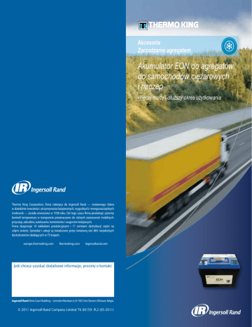 Akcesoria Zarządzanie agregatem Akumulator EON do agregatów do samochodów ciężarowych i naczep Więcej mocy i dłuższy okres użytkowania Thermo King Corporation, firma należąca do Ingersoll Rand — światowego lidera w dziedzinie tworzenia i utrzymywania bezpiecznych, wygodnych i energooszczędnych środowisk — została utworzona w 1938 roku. Od tego czasu firma produkuje systemy kontroli temperatury w transporcie przeznaczone do różnych zastosowań mobilnych: przyczep, zabudów, autobusów, kontenerów i wagonów kolejowych. Firma dysponuje 10 zakładami produkcyjnymi i 17 centrami dystrybucji części na całym świecie. Sprzedaż i usługi są świadczone przez światową sieć 865 niezależnych dystrybutorów działających w 75 krajach. europe.thermoking.com thermoking.com ingersollrand.com Jeśli chcesz uzyskać dodatkowe informacje, prosimy o kontakt: Ingersoll Rand Alma Court Building – Lenneke Marelaan 6, B-1932 Sint-Stevens-Woluwe, Belgia. © 2011 Ingersoll-Rand Company Limited TK 60159- PL2 (05-2011) Akumulator EON do samochodu ciężarowego i przyczepy W akumulatorach EON zastosowano technologię AGM (Absorbed Glass Mat), aby w jednym urządzeniu połączyć właściwości dwóch podobnych akumulatorów. Akumulator w trwałej obudowie może pracować w głębokich cyklach rozładowujących, a jednocześnie zapewnia bardzo wysoką moc rozruchową. Ponieważ przewidywany okres użytkowania, potwierdzony 2 lata gwarancją, obejmuje pięć do ośmiu lat, akumulatory EON pozwalają zaoszczędzić czas i pieniądze związane z ich wymianą. Moc rozruchowa akumulatorów EON w ciągu pierwszych pięciu sekund jest większa niż w przypadku konwencjonalnych akumulatorów podobnej wielkości, nawet w bardzo niskich temperaturach. Akumulatory EON utrzymują swoją wydajność w niskich temperaturach lepiej niż akumulatory z ciekłym elektrolitem. Podstawowe zalety • • • • • • • • • 2 lata gwarancja Nawet pięciokrotnie dłuższa żywotność w porównaniu z akumulatorami z ciekłym elektrolitem Ponad dwa razy krótszy czas ładowania w porównaniu z akumulatorami konwencjonalnymi Zbudowany z czystego ołowiu w celu zwiększenia pojemności i wyeliminowania zanieczyszczeń Bezobsługowy Odporny na działanie bardzo niskich i bardzo wysokich temperatur Przystosowany do transportu drogą powietrzną Cykl użytkowania — 400 cykli Nierdzewne zaciski Specyfikacje techniczne Charakterystyka i parametry eksploatacyjne akumulatora CCA 880 SAE MCA 1050 PHCA 1500 Pojemność rezerwowa 135 min Napięcie 12 V Temperatura robocza od -35°C do 80°C Waga 22 kg Wymiary 275 (dł.) x 170 (szer.) x 200 (wys.) Napięcie ładowania cyklicznego 14,4–14,8 V w temp. 25°C Napięcie ładowania płynnego 13,5–13,8 V w temp. 25°C Ograniczenie prądu ładowania Brak ograniczenia początkowego prądu ładowania Moment obrotowy zacisków 6,8 Nm, maksymalnie 60 funtów na cal Stale w ruchu