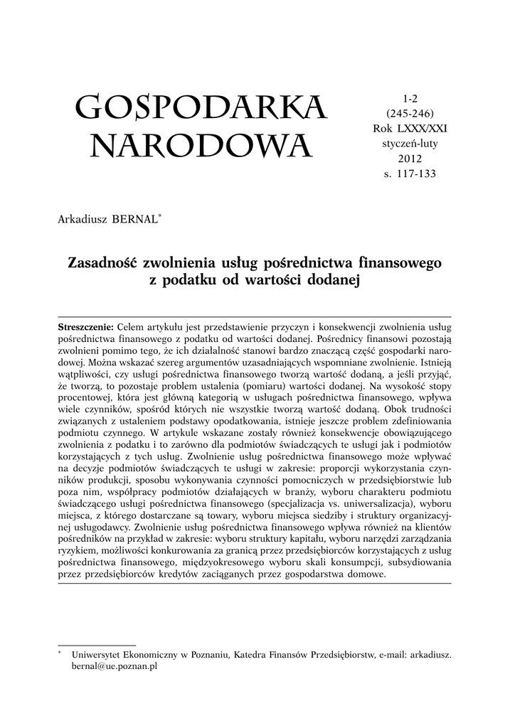 GOSPODARKA NARODOWA 1-2 (245-246) Rok LXXX/XXI styczeń-luty 2012 s. 117-133 Arkadiusz BERNAL* Zasadność zwolnienia usług pośrednictwa finansowego z podatku od wartości dodanej Streszczenie: Celem artykułu jest przedstawienie przyczyn i konsekwencji zwolnienia usług pośrednictwa finansowego z podatku od wartości dodanej. Pośrednicy finansowi pozostają zwolnieni pomimo tego, że ich działalność stanowi bardzo znaczącą część gospodarki narodowej. Można wskazać szereg argumentów uzasadniających wspomniane zwolnienie. Istnieją wątpliwości, czy usługi pośrednictwa finansowego tworzą wartość dodaną, a jeśli przyjąć, że tworzą, to pozostaje problem ustalenia (pomiaru) wartości dodanej. Na wysokość stopy procentowej, która jest główną kategorią w usługach pośrednictwa finansowego, wpływa wiele czynników, spośród których nie wszystkie tworzą wartość dodaną. Obok trudności związanych z ustaleniem podstawy opodatkowania, istnieje jeszcze problem zdefiniowania podmiotu czynnego. W artykule wskazane zostały również konsekwencje obowiązującego zwolnienia z podatku i to zarówno dla podmiotów świadczących te usługi jak i podmiotów korzystających z tych usług. Zwolnienie usług pośrednictwa finansowego może wpływać na decyzje podmiotów świadczących te usługi w zakresie: proporcji wykorzystania czynników produkcji, sposobu wykonywania czynności pomocniczych w przedsiębiorstwie lub poza nim, współpracy podmiotów działających w branży, wyboru charakteru podmiotu świadczącego usługi pośrednictwa finansowego (specjalizacja vs. uniwersalizacja), wyboru miejsca, z którego dostarczane są towary, wyboru miejsca siedziby i struktury organizacyjnej usługodawcy. Zwolnienie usług pośrednictwa finansowego wpływa również na klientów pośredników na przykład w zakresie: wyboru struktury kapitału, wyboru narzędzi zarządzania ryzykiem, możliwości konkurowania za granicą przez przedsiębiorców korzystających z usług pośrednictwa finansowego, międzyokresowego wyboru skali konsumpcji, subsydiowania przez przedsiębiorców kredytów zaciąganych przez gospodarstwa domowe. * Uniwersytet Ekonomiczny w Poznaniu, Katedra Finansów Przedsiębiorstw, e-mail: arkadiusz. [email protected] 118 GOSPODARKA NARODOWA Nr 1-2/2012 Słowa kluczowe: usługi pośrednictwa finansowego, podatek od wartości dodanej, opodatkowanie konsumpcji, bank, kredyt, Unia Europejska, dyrektywa. Kody JEL: H25 Artykuł wpłynął do druku 11 grudnia 2011 r. Wstęp Wartość dodana może być uznana za przedmiot opodatkowania podatkiem od wartości dodanej tylko wówczas, gdy podatek ten jest powszechny. Występujące w tym podatku zwolnienia, zakłócają mechanizm tego podatku i powodują szereg negatywnych konsekwencji. Usługi pośrednictwa finansowego, które stanowią istotną część gospodarki, są z tego podatku zwolnione. Zwolnienie odnoszące się do tak ważnej sfery gospodarki może wzbudzać kontrowersje, szczególnie jeśli weźmie się pod uwagę, że wiele państw poszukuje obecnie nowych sposobów opodatkowania działalności bankowej. Celem artykułu jest przedstawienie przyczyn i konsekwencji zwolnienia usług pośrednictwa finansowego z podatku od wartości dodanej, a także możliwych sposobów rozwiązania problemu tego zwolnienia. Podatek od wartości dodanej i zwolnienia w tym podatku Podatek od wartości dodanej jest podatkiem stosunkowo nowym. Podstawy konstrukcji teoretycznej tego podatku powstały w 1920 r. Za twórcę tych podstaw uznaje się niemieckiego przedsiębiorcę von Siemensa. W 1921 r. w Stanach Zjednoczonych Adams stworzył koncepcję metody fakturowej. Szczególne znaczenie dla rozwoju podatku od wartości dodanej przypisuje się Francuzowi – Lauré [Ebrill et al., 2001]. Pierwszym państwem, które wprowadziło podatek od wartości dodanej, była Francja w 1954 r. Od tego czasu popularność tego podatku rosła, a kolejne państwa wprowadzały ten podatek do swojego ustawodawstwa. Współcześnie podatek od wartości dodanej jest źródłem dochodów publicznych w 145 państwach [Schenk, Oldman, 2007]. Podatek od wartości dodanej może być pobierany według metody rachunkowej (accounts-based VAT), ale również według metody transakcyjnej (transaction based VAT). W ramach metody transakcyjnej można wyróżnić metodę fakturową (credit-invoice VAT), a także metodę kredytu podatkowego podlegającego odliczeniu, ale bez faktur (credit-subtraction VAT without invoices). Metodą mającą powszechne zastosowanie na świecie, w tym w szczególności w państwach europejskich, jest metoda fakturowa. W podatku od wartości dodanej pobieranym według metody fakturowej szczególne znaczenie ma mechanizm odliczania podatku z poprzednich faz obrotu. To właśnie dzięki systemowi naliczania podatku od dokonywanej sprzedaży i odliczania podatku z poprzedniej fazy, przedmiotem opodatkowania jest wartość dodana. Arkadiusz Bernal, Zasadność zwolnienia usług pośrednictwa finansowego z podatku... 119 Mechanizm podatku od wartości dodanej według metody fakturowej funkcjonuje właściwie tylko wówczas, gdy nie istnieją od niego żadne wyjątki. Brak prawa do odliczenia podatku naliczonego, czy też jakiekolwiek zwolnienie wprowadzone do tego mechanizmu wypacza jego istotę. Pomimo to istnieją pewne rodzaje działalności, które wymykają się spod opodatkowania podatkiem od wartości dodanej. Przykładami tego typu działalności są: działalność organów państwowych, działalność organizacji non for profit, hazard, handel elektroniczny, w pewnym zakresie obrót nieruchomościami, działalność mikroprzedsiębiorców, działalność rolnicza, a także usługi pośrednictwa finansowego. Uzasadnienie do szczególnego traktowania na gruncie podatku od wartości dodanej wyżej wymienionych rodzajów działalności jest zróżnicowane, ale faktem pozostaje, że władza publiczna w poszczególnych pań