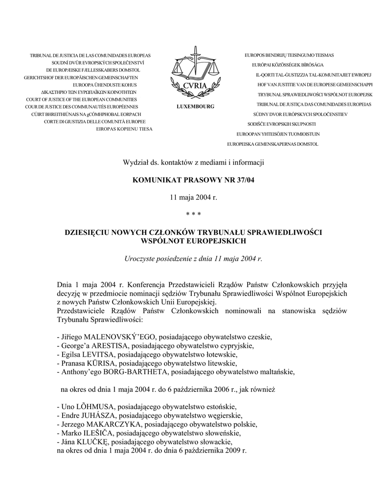 EUROPOS BENDRIJŲ TEISINGUMO TEISMAS TRIBUNAL DE JUSTICIA DE LAS COMUNIDADES EUROPEAS SOUDNÍ DVŮR EVROPSKÝCH SPOLEČENSTVÍ EURÓPAI KÖZÖSSÉGEK BÍRÓSÁGA DE EUROPÆISKE FÆLLESSKABERS DOMSTOL IL-QORTI TAL-ĠUSTIZZJA TAL-KOMUNITAJIET EWROPEJ GERICHTSHOF DER EUROPÄISCHEN GEMEINSCHAFTEN HOF VAN JUSTITIE VAN DE EUROPESE GEMEENSCHAPPE EUROOPA ÜHENDUSTE KOHUS ΔΙΚΑΣΤΗΡΙΟ ΤΩΝ ΕΥΡΩΠΑΪΚΩΝ ΚΟΙΝΟΤΗΤΩΝ TRYBUNAŁ SPRAWIEDLIWOŚCI WSPÓLNOT EUROPEJSK COURT OF JUSTICE OF THE EUROPEAN COMMUNITIES TRIBUNAL DE JUSTIÇA DAS COMUNIDADES EUROPEIAS COUR DE JUSTICE DES COMMUNAUTÉS EUROPÉENNES CÚIRT BHREITHIÚNAIS NA gCÓMHPHOBAL EORPACH SÚDNY DVOR EURÓPSKYCH SPOLOČENSTIEV CORTE DI GIUSTIZIA DELLE COMUNITÀ EUROPEE SODIŠČE EVROPSKIH SKUPNOSTI EIROPAS KOPIENU TIESA EUROOPAN YHTEISÖJEN TUOMIOISTUIN EUROPEISKA GEMENSKAPERNAS DOMSTOL Wydział ds. kontaktów z mediami i informacji KOMUNIKAT PRASOWY NR 37/04 11 maja 2004 r. *** DZIESIĘCIU NOWYCH CZŁONKÓW TRYBUNAŁU SPRAWIEDLIWOŚCI WSPÓLNOT EUROPEJSKICH Uroczyste posiedzenie z dnia 11 maja 2004 r. Dnia 1 maja 2004 r. Konferencja Przedstawicieli Rządów Państw Członkowskich przyjęła decyzję w przedmiocie nominacji sędziów Trybunału Sprawiedliwości Wspólnot Europejskich z nowych Państw Członkowskich Unii Europejskiej. Przedstawiciele Rządów Państw Członkowskich nominowali na stanowiska sędziów Trybunału Sprawiedliwości: - Jiříego MALENOVSKÝ’EGO, posiadającego obywatelstwo czeskie, - George’a ARESTISA, posiadającego obywatelstwo cypryjskie, - Egilsa LEVITSA, posiadającego obywatelstwo łotewskie, - Pranasa KŪRISA, posiadającego obywatelstwo litewskie, - Anthony’ego BORG-BARTHETA, posiadającego obywatelstwo maltańskie, na okres od dnia 1 maja 2004 r. do 6 października 2006 r., jak również - Uno LÕHMUSA, posiadającego obywatelstwo estońskie, - Endre JUHÁSZA, posiadającego obywatelstwo węgierskie, - Jerzego MAKARCZYKA, posiadającego obywatelstwo polskie, - Marko ILEŠIČA, posiadającego obywatelstwo słoweńskie, - Jána KLUČKĘ, posiadającego obywatelstwo słowackie, na okres od dnia 1 maja 2004 r. do dnia 6 października 2009 r. W dniu dzisiejszym, 11 maja 2004 r., o godz. 16.30. odbyło się uroczyste posiedzenie z okazji złożenia przysięgi i objęcia funkcji przez dziesięciu nowych członków Trybunału w Wielkiej Sali Rozpraw Trybunału Sprawiedliwości Wspólnot Europejskich. Curricula vitae nowych sędziów Trybunału Sprawiedliwości Jerzy Makarczyk urodzony w 1938 r.; doktor prawa (1966); profesor prawa międzynarodowego publicznego (1974); „Senior visiting fellow” na Uniwersytecie w Oxford (1985), profesor na Chrześcijańskim Uniwersytecie Międzynarodowym w Tokio (1988), autor licznych opracowań z zakresu prawa międzynarodowego publicznego, prawa wspólnotowego i praw człowieka; członek licznych towarzystw naukowych zajmujących się prawem międzynarodowym, prawem europejskim i prawami człowieka; negocjator rządu polskiego w związku z wycofaniem wojsk radzieckich z terytorium Rzeczpospolitej Polskiej; podsekretarz stanu, a następnie sekretarz stanu w Ministerstwie Spraw Zagranicznych (1989-1992); przewodniczący delegacji polskiej przy Zgromadzeniu Ogólnym Narodów Zjednoczonych; sędzia w Europejskim Trybunale Praw Człowieka (1992-2002); przewodniczący Instytutu Prawa Międzynarodowego (2003); doradca Prezydenta Rzeczpospolitej Polskiej ds. polityki zagranicznej i praw człowieka (2002-2004); sędzia Trybunału Sprawiedliwości od dnia 11 maja 2004 r. Pranas Kūris urodzony w 1938 r.; absolwent wydziału prawa Uniwersytetu w Wilnie (1961); doktor (kandydat w zakresie nauk prawnych) na Uniwersytecie Moskiewskim (1965), doktor habilitowany, Uniwersytet Moskiewski (1973), stażysta w Instytucie Wyższych Studiów Międzynarodowych (dyr.: prof. Ch. Rousseau), Uniwersytet w Paryżu (1967-1968); członek czynny Litewskiej Akademii Nauk (1996), doktor honoris causa Litewskiego Uniwersytetu Prawa (2001); szereg funkcji dydaktycznych i administracyjnych na Uniwersytecie w Wilnie (1961-1990); docent, professeur agrégé, profesor prawa międzynarodowego publicznego, dziekan wydziału prawa; szereg stanowisk rządowych w ramach litewskiej służby dyplomatycznej i prawnej; minister sprawiedliwości (1990-1991), członek Rady Stanu (1991), ambasador Republiki Litewskiej dla Belgii, Luksemburga i Holandii (1992-1994); sędzia (dawnego) Europejskiego Trybunału Praw Człowieka (czerwiec 1994 – listopad 1998); sędzia i prezes Sądu Najwyższego Litwy (grudzień 1994 – październik 1998); sędzia Europejskiego Trybunału Praw Człowieka (od listopada 1998 r.); udział w wielu konferencjach międzynarodowych; członek delegacji Republiki Litewskiej w negocjacjach z ZSRR (19901992); autor licznych publikacji (ok. 200); sędzia Trybunału Sprawiedliwości od dnia 11 maja 2004 r. Endre Juhász urodzony w 1944 r.; absolwent wydziału prawa Uniwersytetu w Szeged, Węgry (1967); egzamin adwokacki (1970); studia trzeciego cyklu w zakresie prawa porównawczego na Uniwersytecie w Strasburgu, Francja (1969, 1970, 1971, 1972); urzędnik w departamencie prawnym Ministerstwa Handlu Zagranicznego (1966-1974), dyrektor ds. legislacyjnych (19731974); pierwszy attaché handlowy w ambasadzie węgierskiej w Brukseli, odpowiedzialny za kwestie wspólnotowe (1974-1979); dyrektor generalny Ministerstwa Handlu Zagranicznego (1979-1983); pierwszy attaché handlowy, a następnie doradca handlowy w ambasadzie węgierskiej w Waszyngtonie, Stany Zjednoczone (1983-1989); dyrektor generalny w Ministerstwie Handlu i w Ministerstwie Międzynarodowych Stosunków Gospodarczych (1989 -1991); główny negocjator Układu Stowarzyszeniowego między Węgrami a Wspólnotami Europejskimi i ich Państwami Członkowskimi (1990 - 1991); sekretarz generalny w Ministerstwie Międzynarodowych Stosunków Gospodarczych; dyrektor Urzędu Spraw Europejskich (1992); sekretarz stanu w Ministerstwie Mi