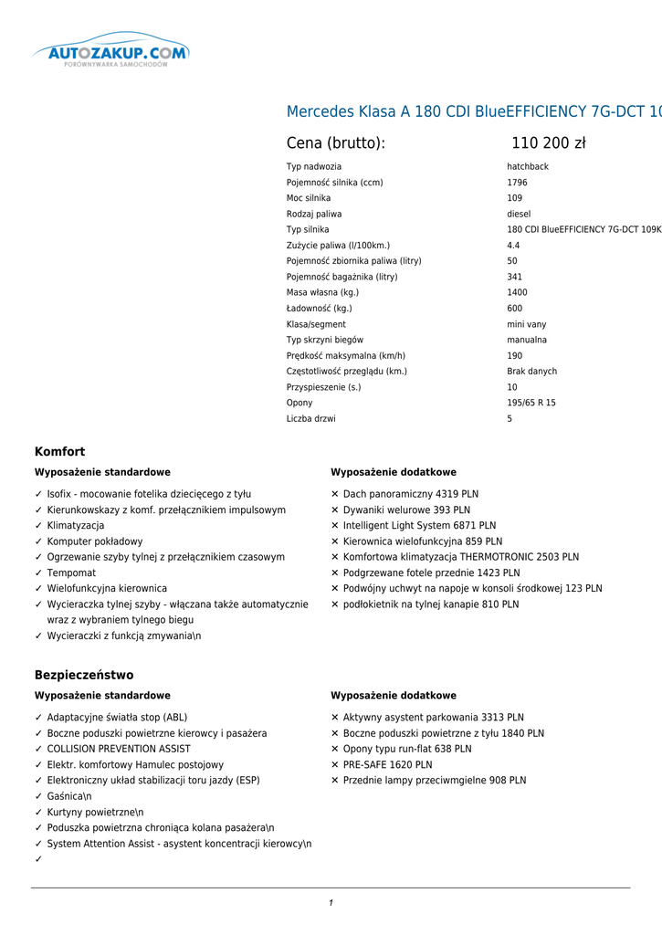 Mercedes Klasa A 180 CDI BlueEFFICIENCY 7G-DCT 10 Cena (brutto): 110 200 zł Typ nadwozia hatchback Pojemność silnika (ccm) 1796 Moc silnika 109 Rodzaj paliwa diesel Typ silnika 180 CDI BlueEFFICIENCY 7G-DCT 109K Zużycie paliwa (l/100km.) 4.4 Pojemność zbiornika paliwa (litry) 50 Pojemność bagażnika (litry) 341 Masa własna (kg.) 1400 Ładowność (kg.) 600 Klasa/segment mini vany Typ skrzyni biegów manualna Prędkość maksymalna (km/h) 190 Częstotliwość przeglądu (km.) Brak danych Przyspieszenie (s.) 10 Opony 195/65 R 15 Liczba drzwi 5 Komfort Wyposażenie standardowe Wyposażenie dodatkowe ✓ Isofix - mocowanie fotelika dziecięcego z tyłu ✕ Dach panoramiczny 4319 PLN ✓ Kierunkowskazy z komf. przełącznikiem impulsowym ✕ Dywaniki welurowe 393 PLN ✓ Klimatyzacja ✕ Intelligent Light System 6871 PLN ✓ Komputer pokładowy ✕ Kierownica wielofunkcyjna 859 PLN ✓ Ogrzewanie szyby tylnej z przełącznikiem czasowym ✕ Komfortowa klimatyzacja THERMOTRONIC 2503 PLN ✓ Tempomat ✕ Podgrzewane fotele przednie 1423 PLN ✓ Wielofunkcyjna kierownica ✕ Podwójny uchwyt na napoje w konsoli środkowej 123 PLN ✓ Wycieraczka tylnej szyby - włączana także automatycznie ✕ podłokietnik na tylnej kanapie 810 PLN wraz z wybraniem tylnego biegu ✓ Wycieraczki z funkcją zmywania\n Bezpieczeństwo Wyposażenie standardowe Wyposażenie dodatkowe ✓ Adaptacyjne światła stop (ABL) ✕ Aktywny asystent parkowania 3313 PLN ✓ Boczne poduszki powietrzne kierowcy i pasażera ✕ Boczne poduszki powietrzne z tyłu 1840 PLN ✓ COLLISION PREVENTION ASSIST ✕ Opony typu run-flat 638 PLN ✓ Elektr. komfortowy Hamulec postojowy ✕ PRE-SAFE 1620 PLN ✓ Elektroniczny układ stabilizacji toru jazdy (ESP) ✕ Przednie lampy przeciwmgielne 908 PLN ✓ Gaśnica\n ✓ Kurtyny powietrzne\n ✓ Poduszka powietrzna chroniąca kolana pasażera\n ✓ System Attention Assist - asystent koncentracji kierowcy\n ✓ 1 System wspomagający gwałtowne hamowanie (BAS)\n 2 ✓ Trójkąt ostrzegawczy\n ✓ Tylne światła przeciwmgłowe\n ✓ Układ antypoślizgowy (ASR)\n ✓ Wskaźnik awarii żarówek\n ✓ Zabezpieczenie wnętrza pojazdu\n Dodatki Wyposażenie standardowe Wyposażenie dodatkowe ✓ 3. światło stop w technice LED ✕ Audio 20 CD/ zmieniarka 6CD 2454 PLN ✓ 7G-DCT ✕ Becker Map Pilot 3534 PLN ✓ ABS - system zapobiegający blokadzie kół podczas ✕ Becker Map Pilot - przygotowanie 1080 PLN hamowania ✓ ADAPTIVE BRAKE z funkcją HOLD ✕ COMAND Online 13496 PLN ✓ Alarm antywłamaniowy (EDW) ✕ COMAND Online ze zmieniarką DVD 14968 PLN ✓ Apteczka ✕ Driver's seat, electrically adjustable with memory function 1644 PLN ✓ Asystent świateł przednich ✕ Fotel pasażera regulowany elektrycznie z pamięcią położenia 1374 PLN ✓ Audio 5 USB ✕ Hak holowniczy z funkcją stabilizacji ESP 3877 PLN ✓ Automat. oświetlenie powypadkowe ✕ Kamera cofania 1423 PLN ✓ Centralny zamek z blokadą od wewnątrz ✕ Lusterka zewnętrzne pokryte włóknem węglowym 5888 PLN ✓ DPF - filtr cząstek stałych ✕ Media interface 1080 PLN ✓ Elektryczne podnośniki szyb ✕ Moduł telefoniczny z Bluetooth® SAP 2159 PLN ✓ Fotele przednie z częściową regulacją elektr. ✕ Ogrzewanie postojowe 6135 PLN ✓ Funkcja ECO start/stop ✕ Opony zimowe M+S (komplet) 540 PLN ✓ Immobilizer elektroniczny ✕ Podgrzewane dysze spryskiwaczy szyby przedniej 564 PLN ✓ Instrument Kombi z centralnym wyświetlaczem ✕ Przyciemniane szyby z funkcją termoizolacji 1080 PLN ✓ Kierunkowskazy w obudowach lusterek zewnętrznych ✕ Przygotowanie do montażu telefonu komórkowego 1718 PLN ✓ Klamki drzwi z wstawką chromowaną ✕ Radio Audio 20 CD 1718 PLN ✓ Klejona szyba przednia ✕ Reflektory w technologii Bi-Xenon 4147 PLN ✓ Kluczyk z elementami chromowanymi ✕ Regulacja fotela- wypchnięcie odcinka lędźwiowego 761 PLN ✓ Lusterka zewnętrzne podgrzewane, regulowane elektrycznie ✕ System nagłaśniający surround Sound Harman Kardon® Logic7® 3239 PLN ✓ Manetki zmiany biegów przy kierownicy ✕ System rozpoznawania obecności fotelika dziecięcego dla fotela pasażera 245 PLN ✓ Mechaniczna regulacja kierownicy w pionie ✕ Tapicerka ARTICO - szara 1178 PLN ✓ Mocowanie ładunku w przestrzeni bagażowej ✕ Tapicerka ARTICO-czarna 1178 PLN ✓ Osłona przeciwsłoneczna z lusterkiem kosmetycznym ✕ Zestaw Drive Kit dla telefonu Apple(R) iPhone(R) 4/4S 1153 PLN ✓ Ozdobna listwa przyokienna, czarny, z połyskiem\n ✓ Pakiet zabezpieczenia pojazdu\n ✓ Parametryczna przekładnia układu kierowniczego\n ✓ Pasy bezpieczeństwa dopasowane do wnętrza\n ✓ Podsufitka materiałowa - szara\n ✓ Poduszka powietrzna chroniąca kolana kierowcy\n ✓ Poduszka powietrzna kierowcy i pasażera\n ✓ Przednie tarcze hamulcowe\n ✓ 3 Przełącznik impulsowy i wskaźnik przełożeń w 4 obrotomierzu\n 5 ✓ Reflektory soczewkowe\n ✓ Regul. zagłówki (x5) przód i tył-3 pneum. składane\n ✓ Rozpoznawanie obecności na fotelu pasażera\n ✓ Schowek przed fotelem pasażera\n ✓ Schowek z nawiewem\n ✓ Schowki\n ✓ Składane oparcie kanapy tylnej 1/3 : 2/3\n ✓ Składany podłokietnik z przodu\n ✓ System aktywnego serwisowania pojazdu - Assyst\n ✓ System ostrzegający o spadku ciśnienia w oponach\n ✓ Szyby izotermiczne\n ✓ Tirefit\n ✓ Tylne tarcze hamulcowe\n ✓ Wskaźnik temperatury zewnętrznej\n ✓ Wskaźnik zużycia klocków hamulcowych\n ✓ Zabezp. tylnych drzwi przed otwarciem przez dzieci\n ✓ Zawieszenie komfortowe\n ✓ Zestaw głośników (x8)\n ✓ Zintegrowana antena radiowa\n ✓ Złącze AUX-IN w schowku\n Doprecyzowanie oferty ✕ Pakiet Internet service/ travel package - 491 PLN ✕ Pakiet dynamiki jazdy - 1350 PLN ✕ Pakiet dla palących - 221 PLN ✕ Pakiet zabezpieczenia pojazdu (zawarte w cenie podstawowej) - 0 PLN Alarm antywłamaniowy (EDW) Zabezpieczenie wnętrza pojazdu Kontakt: Nazwa użytkownika: admin Nazwa firmy: qqq Adre