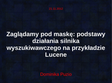 21.11.2012 Zaglądamy pod maskę: podstawy działania silnika wyszukiwawczego na przykładzie Lucene Dominika Puzio Indeks Podstawy: dokument Dokument: jednostka danych, pojedynczy element na liście wyników wyszukiwania, to co chcemy wyszukiwać ( strona www, artykuł, post, dobro konsumpcyjne ) dokument id:1 content: Ala ma kota pole 3 Podstawy: indeks Indeks: repozytorium, w którym silnik wyszukiwawczy przechowuje dane, zorganizowane w taki sposób, aby dało się w nich szybko wyszukiwać id:1 content: Ala ma kota id:2 content: Ola ma psa id:3 content: Ala lubi psa 4 Indeks odwrócony doc1 content: content: Ala Alama makota kota ala 1 3 ma 1 2 kota 1 ola 1 2 psa 2 lubi 1 3 doc2 content: content: Ola Olama mapsa psa doc3 content: content: Ala Alalubi lubipsa psa 3 5 Indeks: budowanie doc1 content: content: Ala Alama makota kota content:ala 1 3 content:ma content:kota 11 content:ma content:lubi 13 2 content:ola content:ma 1 12 2 content:psa content:ola 2 1 content:psa 2 doc2 content: content: Ola Olama mapsa psa doc3 content: content: Ala Alalubi lubipsa psa 3 6 Indeks: słownik słownik content:ala 1 content:kota 1 content:lubi 3 content:ma 1 content:ola 2 content:psa 2 termy 3 2 3 listy id dokumentów 7 Indeks: słownik doc1 id:1 id:1 content:Ala content:Alama makota kota content:ala 1 content:kota 1 content:lubi 3 content:ma 1 content:ola 2 content:psa 2 id:1 1 id:2 2 id:3 3 doc2 id:2 id:2 content:Ola content:Olama mapsa psa doc3 id:3 id:3 content:Ala content:Alalubi lubipsa psa 3 2 3 8 Indeks: przebieg wyszukiwania QUERY: [content: ala] 1 content:ala 3 QUERY: [content: ala OR content: kota] content:ala content:kota 1 3 OR 1 1 3 QUERY: [content: ala AND content: kota] content:ala 1 content:kota 1 3 AND 1 9 Indeks: oglądamy słownik Luke – czytnik indeksów Lucene 10 Algorytm scoringu (czyli dlaczego kot jest ważniejszy niż pies) Vector Space Model i trochę historii ● historycznie: ● ● ● ● ● idea użycia komputerów do poszukiwania informacji pojawiła się w 1945 roku (http://www.theatlantic.com/magazine/archive/1945/07/as-we-may-think/303881/) pierwsze silniki wyszukiwawcze (akademickie) – lata 50' pierwsze wielkoskalowe silniki wyszukiwawcze, gotowe do użytku komercyjnego – lata 70' Vector Space Model: algebraiczny model dokumentu tekstowego, opracowany i pierwszy raz użyty w latach 60' na Cornell University jako część systemu SMART (System for the Mechanical Analysis and Retrieval of Text) – jednej z pierwszych tekstowych wyszukiwarek Vector Space Ranking: algorytm scoringu oparty o Vector Space Model 12 Informacje zawarte w słowniku content:ala 1 content:kota 1 content:lubi 3 content:ma 1 content:ola 2 content:psa 2 3 dokument 1: zawiera słowo „ala” 2 dokument 2: nie zawiera słowa „ala” dokument 3: zawiera słowo „ala” 3 13 Alternatywny zapis słownika doc1 doc2 doc3 content:ala 1 0 1 content:kota 1 0 0 content:lubi 0 0 1 content:ma 1 1 0 content:ola 0 1 0 content:psa 0 1 1 Indeks macierzowy 14 Vector Space Model: wektor dokumentu doc1 doc2 doc3 1 1 0 0 1 kota 1 0 0 lubi 0 0 1 doc2 0 0 0 1 1 1 ma 1 1 0 doc1 1 1 0 1 0 0 ola 0 1 0 psa 0 1 1 psa 0 ola 1 ma doc3 lubi 0 kota 1 ala ala wektor dokumentu wektor dokumentu doc1 w przestrzeni doc1 słów 15 1 1 0 1 0 0 kota lubi ma ola psa doc1 ala Vector Space Model: waga słów Założenie Vector Space Model: informacja o tym, że słowo wystąpiło w dokumencie (lub nie) nie jest wystarczająca. Model bierze pod uwagę również to, że: ● ● im więcej wystąpień słowa w dokumencie, tym wyżej powinien być na liście wyników nie wszystkie słowa są jednakowo ważne 16 Vector Space Model: waga słów wala,doc1 wkota,doc1 wlubi,doc1 wma,doc1 wola,doc1 wpsa,doc1 kota lubi ma ola psa doc1 ala Wartością współrzędnej słowa s w dokumencie d jest waga ws, d obliczana na podstawie liczby wystąpień słowa s w dokumencie d i wartości informacyjnej słowa s. 17 Vector Space Model Krok 1: każde słowo w dokumencie dostaje wagę zależną od liczby wystąpień słowa w dokumencie i wartości informacyjnej słowa ● ● bierzemy pod uwagę liczbę wystąpień poszukiwanego słowa w dokumencie - im więcej razy słowo z zapytania wystąpiło w dokumencie, tym wyższy score dla dokumentu dla każdego słowa w dokumencie mamy liczbę: tfs, d (term frequency) = liczba wystąpień słowa s w dokumencie d ● dla każdego słowa w dokumencie wyznaczamy wagę wg. wzoru: w s , d = 1log tf s , d dlatf s ,d 0 0 w przeciwnym wypadku 18 Vector Space Model w s , d = ● Dlaczego logarytm? ● ● żeby nie mieć zależności wprost (dokument zawierający słowo 10 razy, nie jest 10 razy lepszy od tego, który zawiera je raz) Dlaczego 1+log ? ● ● 1log tf s , d dla tf s ,d 0 0 w przeciwnym wypadku żeby słowo, które wystąpiło w dokumencie 1 raz, nie otrzymało wagi 0 ( log1 = 0 ) Dlaczego osobno przypadek, kiedy tfs, d = 0 ? ● dlatego, że log0 = -ꝏ 19 Vector Space Model Krok 1: każde słowo w dokumencie dostaje wagę zależną od liczby wystąpień słowa w dokumencie i wartości informacyjnej słowa ● ● bierzemy pod uwagę liczbę wystąpień poszukiwanego słowa w całym indeksie – im rzadsze słowo, tym więcej informacji niesie i dokument je zawierający powinien mieć wyższy score dla każdego słowa w dokumencie mamy liczbę: dfs (document frequency) = liczba dokumentów w indeksie zawierających słowo s ● dla każdego słowa w dokumencie wyznaczamy tzw. inverse document frrequency: N idf s =log df s N - liczba wszystkich dokumentów w indeksie 20 Vector Space Model Krok 1: każde słowo w dokumencie dostaje wagę zależną od tf i idf ● dla każdego słowa w dokumencie wyznaczamy wagę: N w s , d =1logtf s ,d ×log df s ● waga jest wyznaczana podczas indeksowania i zapisywana w indeksie Przykład: doc1 doc2 doc3 ala tfala, doc1 = tfala,doc3 = 1 tfala,doc2 = 0 N=3 dfala = 2 1 0 1 3 w ala ,doc1 =w ala, doc3=1log 1×log ≈0,58 2 3 w ala ,doc2 =0×log =0 2 21 Vector Spa