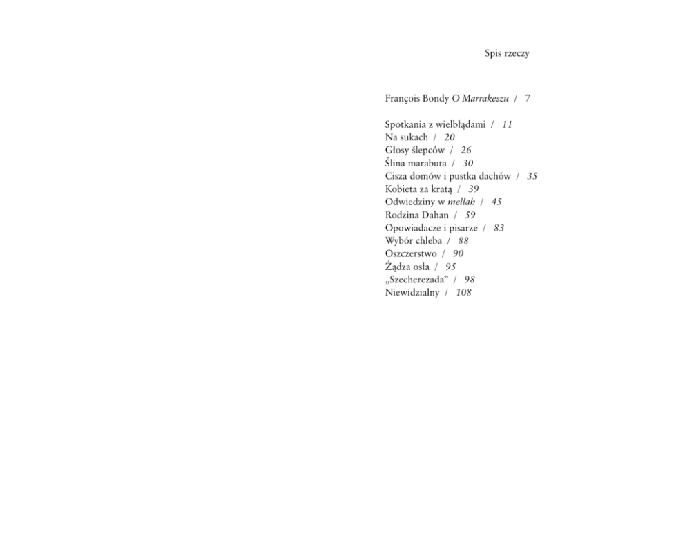 Spis rzeczy François Bondy O Marrakeszu / 7 Spotkania z wielbłądami / 11 Na sukach / 20 Głosy ślepców / 26 Ślina marabuta / 30 Cisza domów i pustka dachów / 35 Kobieta za kratą / 39 Odwiedziny w mellah / 45 Rodzina Dahan / 59 Opowiadacze i pisarze / 83 Wybór chleba / 88 Oszczerstwo / 90 Żądza osła / 95 „Szecherezada” / 98 Niewidzialny / 108