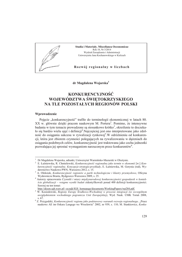Studia i Materiały. Miscellanea Oeconomicae Rok 18, Nr 3/2014 Wydział Zarządzania i Administracji Uniwersytetu Jana Kochanowskiego w Kielcach Rozwój regionalny w liczbach dr Magdalena Wojarska1 KONKURENCYJNOŚĆ WOJEWÓDZTWA ŚWIĘTOKRZYSKIEGO NA TLE POZOSTAŁYCH REGIONÓW POLSKI Wprowadzenie Pojęcie „konkurencyjność” trafiło do terminologii ekonomicznej w latach 80. XX w. głównie dzięki pracom naukowym M. Portera2. Pomimo, że intensywne badania w tym temacie prowadzone są stosunkowo krótko3, określenie to doczekało się bardzo wielu ujęć i definicji4.Najczęściej jest ono interpretowane jako zdolność do osiągania sukcesu w rywalizacji rynkowej5.W odróżnieniu od konkurencji, która jest zbiorem czynności polegających na rywalizowaniu w dążeniach do osiągania podobnych celów, konkurencyjność jest traktowana jako cecha jednostki pozwalająca jej sprostać wymaganiom narzuconym przez konkurentów6. 1 Dr Magdalena Wojarska, adiunkt, Uniwersytet Warmińsko-Mazurski w Olsztynie. E. Łaźniewska, R. Chmielewski, Konkurencyjność regionalna jako termin w ekonomii [w:] Konkurencyjność regionalna. Koncepcje-strategie-przykłady, E. Łaźniewska, M. Gorynia (red), Wydawnictwo Naukowe PWN, Warszawa 2012, s. 15. 3 A. Oleksiuk, Konkurencyjność regionów a parki technologiczne i klastry przemysłowe, Oficyna Wydawnicza Branta, Bydgoszcz-Warszawa 2009, s. 25. 4 Autorzy opracowania Czynniki i miary międzynarodowej konkurencyjności gospodarek w kontekście globalizacji – wstępne wyniki badań zidentyfikowali ponad 400 definicji konkurencyjności. Szerzej na ten temat: http://akson.sgh.waw.pl/~zczajk/IGS_homepage/documents/WorkingPapers/wp284.pdf. 5 W. Kosiedowski, Regiony Europy Środkowo-Wschodniej w procesie integracji (ze szczególnym uwzględnieniem wschodniego pogranicza Unii Europejskiej), Wyd. Nauk. UMK Toruń 2008, s. 67. 6 Z. Przygodzki, Konkurencyjność regionu jako podstawowy warunek rozwoju regionalnego, „Prace naukowe AE im Oskara Langego we Wrocławiu” 2002, nr 939, s. 110; M. Stankiewicz, Konku2 129 O konkurencyjności najczęściej mówi się w kontekście przedsiębiorstw, ale jak zaznaczają G. Gorzelak i B. Jałowiecki7, współcześnie do walki konkurencyjnej stanęły także układy terytorialne: państwa, regiony, miasta i gminy. W tym ujęciu, konkurencyjność jest sposobem porównania względnej wydajności gospodarek, co pomaga w określeniu zapóźnionych obszarów, ale nie wskazuje przyczyn tych opóźnień8.J. Meyer-Stamer9 zdefiniował konkurencyjność terytorialną jako zdolność generowania wysokich i rosnących dochodów oraz poprawy warunków życiowych ludzi zamieszkujących dany obszar. Podobnego zdania są autorzy The Global Competitiveness Report 2014-201510 twierdząc, że konkurencyjność to zbiór instytucji, polityk i czynników, które determinują poziom produktywności kraju, co ma wpływ na dobrobyt oraz stopy zwrotu z inwestycji. Ich zdaniem bardziej konkurencyjna gospodarka to taka, która może rozwijać się szybciej w czasie. Jednym z poziomów konkurencyjności terytorialnej jest konkurencyjność regionu, która jest pojęciem nieporównywalnie mniej ścisłym niż konkurencyjność produktu czy przedsiębiorstwa. Wynika to ze złożoności podmiotu definicji: jego uwarunkowań, instrumentów i czynników rozwoju, wielości i różnorodności podmiotów gospodarczych oraz możliwości ich współdziałania11. Ogólnie, hasło to można zinterpretować jako zdolność regionów do przystosowywania się do zmieniających się warunków, pod kątem utrzymania lub poprawy pozycji w toczącym się między regionami współzawodnictwie12.Tak rozumiana konkurencyjność jest wypadkową wielu wzajemnie ze sobą powiązanych czynników13, w tym przede wszystkim: zróżnicowania struktury ekonomicznej; dostęprencyjność przedsiębiorstwa. Budowanie konkurencyjności przedsiębiorstwa w warunkach globalizacji, TNOiK, Toruń 2005, s. 18. 7 G. Gorzelak, B. Jałowiecki, Konkurencyjność regionów, „Studia Regionalne i Lokalne” 2000, nr 1(1), s. 8. 8 J. Dunning, E. Bannerman i S. Lundan, Competitiveness and Industrial Policy in Northern Ireland, Northern Ireland Research Council, Research Monograph 5 podane za: D.J. Brooksbank, D.G. Pickamell, Regional Competitiveness Indicators. A reassessment of method., „Local Economy” 1999, vol. 13, no 4, s. 311. 9 J. Meyer-Stamer, Systemic Competitiveness and Local Economic Development [w:] Large Scale Systemic Change: Theories, Modelling and Practices, S. Bodhanya (red.), Mesopartner Duisburg 2008, s. 7. 10 X. Sala-I-Martín, B. Bilbao-Osorio, A. Di Battista, M. Drzeniek, H. C. Galvan, T. Geiger, The Global Competitiveness Index 2014–2015: Accelerating a Robust Recovery to Create Productive Jobs and Support Inclusive Growth [w:] The Global Competitiveness Report 2014–2015, K. Schwab (red.), World Economic Forum, Genewa 2014, s. 3. 11 W. Budner, Lokalizacja przedsiębiorstw. Aspekty ekonomiczno-przestrzenne i środowiskowe, Wyd. AE w Poznaniu, Poznań 2003, s. 47. 12 Winiarski, Konkurencyjność: kryterium wyboru czy kierunek strategii i cel pośredni polityki Re gionalnej? [w:] Konkurencyjność regionów, M. Klamut (red.), Wyd. AE im Oskara Langego we Wrocławiu, Wrocław 1999, s. 9. 13 Wnikliwy przegląd czynników konkurencyjności regionalnej zawarty jest m.in. w pracach: E. Łaźniewska, M. Gorynia (red.), Konkurencyjność regionalna. Koncepcje-strategie-przykłady, 130 ności komunikacyjnej; innowacyjności i przedsiębiorczości mieszkańców; wykształcenia i ogólnego potencjału intelektualno-kulturowego społeczności regionalnej; stopnia samoorganizacji społeczeństwa; stanu środowiska naturalnego; zaplecza naukowo-badawczego i rozwojowego; jakości zarządzania rozwojem regionu; zdolności absorpcyjnych inwestycji krajowych i zagranicznych; rezerw terenów nadających się do inwestycji. Istotny wpływ wywiera również otoczenie makroekonomiczn