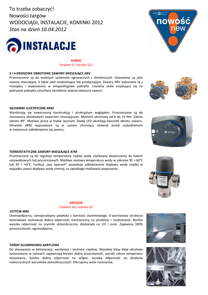 To trzeba zobaczyć! Nowości targów WODOCIĄGI, INSTALACJE, KOMINKI 2012 Stan na dzień 10.04.2012 AFRISO Pawilon 5 / stoisko 121 3 I 4-DROGOWE OBROTOWE ZAWORY MIESZAJĄCE ARV Przeznaczone są do wodnych systemów ogrzewczych i chłodniczych. Stosowane są jako zawory mieszające, a także jako rozdzielające lub przełączające. Zawory ARV wykonane są z mosiądzu i wyposażone w antypoślizgowe pokrętło. Czytelna skala znajdująca się na pokrywce pokrętła umożliwia określenie stopnia otwarcia zaworu. SIŁOWNIKI ELEKTRYCZNE ARM Wyróżniają się nowoczesną konstrukcją i atrakcyjnym wyglądem. Przeznaczone są do sterowania obrotowymi zaworami mieszającymi. Moment obrotowy od 6 do 15 Nm. Zakres obrotu 90°. Możliwa praca w trybie ręcznym. Diody LED określają kierunek obrotu zaworu. Siłowniki ARM wyposażone są w system chroniący siłownik przed uszkodzeniem w momencie zablokowania się zaworu. TERMOSTATYCZNE ZAWORY MIESZAJĄCE ATM Przeznaczone są do regulacji temperatury ciepłej wody użytkowej dostarczanej do baterii umywalkowych lub prysznicowych. Możliwa nastawa temperatury wody w zakresie 35 ÷ 60°C lub 20 ÷ 43°C. Funkcja „bez oparzeń” powoduje zablokowanie dopływu wody ciepłej w wypadku awarii dopływu wody zimniej, co zapobiega możliwości poparzenia. ANTICOR Pawilon 3A / stoisko 25 1577CW-WM Chemoodporna, samoprzylepna powłoka z laminatu aluminiowego. 6-warstwowa struktura laminatowa zachowuje dobrą odporność mechaniczną na przebicie i rozdzieranie. Bardzo wysoka odporność na czynniki atmosferyczne, doskonała na UV i ozon. Zapewnia 100% paroszczelność, ognioodporna. TAŚMY ALUMINIOWO-AKRYLOWE Do stosowania w klimatyzacji, wentylacji i technice cieplnej. Wysokiej klasy kleje akrylowe zastosowane w taśmach zapewniają bardzo dobrą przyczepność, szeroki zakres temperatur stosowania, bardzo dobrą odporność na wilgoć, wysoką odporność na działanie niekorzystnych warunków atmosferycznych. Oferujemy wiele rozmiarów. MBX® BRISTLE BLASTER® – SYSTEM PASÓW ŚRUTUJĄCYCH System pasów śrutujących do przygotowania powierzchni metalowych. Zapewnia oczyszczenie powierzchni do białego metalu i uzyskanie pożądanej chropowatości (40÷120µ). Zwiększa odporność powierzchni na pękanie i korozję. Eliminuje potrzebę stosowania kosztownych urządzeń do obróbki strumieniowo-ściernej. Metoda przyjazna środowisku. SYSTEM PRZEPUSTÓW KABLOWYCH I RUROWYCH ANTICOR SEAL – masa uszczelniająca oraz ANTICOR SEAL HT – masa uszczelniająca wysokotemperaturowa. System zwiększa bezpieczeństwo obiektów budowlanych, zapewniając szczelność przejścia rur i kabli przez ściany, fundamenty. Tworzy skuteczną barierę przed penetracją wody, wilgoci i gazu. APATOR-POWOGAZ Pawilon 5 / Stoisko 172 SMART C+ Jednostrumieniowy, suchobieżny wodomierz przeznaczony do precyzyjnego pomiaru zużycia wody. Dzięki nowoczesnym rozwiązaniom konstrukcyjnym, wodomierz przystosowany jest do montażu nakładki radiowej umożliwiającej zdalny odczyt wskazań. Jest najlepiej zabezpieczonym wodomierzem suchobieżnym przed działaniem silnego pola magnetycznego. Wykonany jest w oparciu o Dyrektywę MID w zakresie pomiarowym odpowiadającym wartości R=160 (dawna klasa metrologiczna C). AZ POKORNY Pawilon 3A / stoisko 83 FLEXIRA– KOMPAKTOWA THERMOCENTRALA Umożliwia połączenie kilku sterowanych i niesterowanych, przede wszystkim ekologicznych, źródeł ciepła oraz niezależne sterowanie wyprowadzeniem ciepła. System regulacyjny z możliwością adaptacji w optymalny sposób korzysta ze źródeł ciepła, ich dystrybucji w systemie, steruje szybkim i wydajnym przepływowym ogrzewaniem CWU. BARBOR Pawilon 5 / Stoisko 122 KRZYŻOWY WYMIENNIK CIEPŁA W OBUDOWIE Jego prosta budowa i łatwość montażu sprzyja rozpowszechnianiu rekuperacji w budynkach. Składa się z: wymiennika krzyżowego ciepła, filtrów klasy G4, obudowy, króćców przyłączeniowych. Krzyżowy wymiennik ciepła zbudowany jest z aluminiowych płyt, pomiędzy którymi przepływa powietrze nawiewane i wywiewane, w kierunku krzyżowym wobec siebie i odseparowane od siebie. BH-RES Pawilon 3A / Stoisko 34 CLIMAVER DECO ORAZ CLIMAVER A2 BLACK 40MM Są to najnowsze produkty marki Climaver. Oba te produkty są modyfikacją znanej od wielu lat na naszym rynku płyty Climaver A2 Black 25mm. Climaver Deco różni się od pierwowzoru powłoką zewnętrzną, którą stanowi laminat z włókna szklanego i aluminium występujący w różnych kolorach. Climaver A2 Black 40mm różni się grubością od dotychczas stosowanych płyt. BROEN Sp. Z O.O. Pawilon 5 / Stoisko 117 REDUKTORY CIŚNIENIA BROEN CLORIUS SERII G1PR I H1PR Mają zastosowanie w instalacjach wodnych, a przede wszystkim w instalacjach parowych. Charakteryzują się szerokim zakresem nastaw od 0,4 do 16 bar, dostępne są z połączeniami kołnierzowymi do DN80. Solidne polskie wykonanie, nowoczesna technologia, wpływa na niezawodność działania. BWT POLSKA Pawilon 5 / Stoisko 197 NOWY FILTR BWT E1 TITANIUM Ekologiczny, łatwy w użyciu i praktyczny. Centralny wkład filtracyjny wykonany jest z wysokogatunkowego stopu tytanu, wykazuje długą żywotność i po umyciu w zmywarce można go wykorzystać ponownie. Firma BWT wyznacza nowe standardy w dziedzinie funkcjonalności (łatwo i szybko), ekologii (bez popłuczyn, bez odpadów) oraz ekonomii (wkład filtra o długiej żywotności). FILTR BWT Protector mini C/R Mini filtr, maxi możliwości – filtr do wody zimnej z mosiężną głowicą, przezroczystym kloszem i elementem filtracyjnym ze stali nierdzewnej. Trwały, zajmujący niewiele miejsca filtr jest skuteczną ochroną domowej instalacji przed zanieczyszczeniami stałymi płynącymi w wodzie. Dostępny w 3 średnicach przyłączy z możliwością podłączenia manometru i reduktora ciśnienia (opcja). FILTR BWT PROTECTOR MINI H/R Mini filtr, maxi możliwości – filtr do wody gorącej z mosiężną głowicą, mosięż