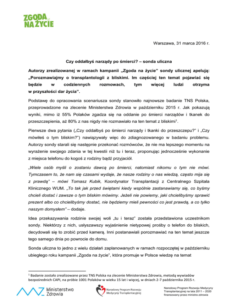 Warszawa, 31 marca 2016 r. Czy oddałbyś narządy po śmierci? – sonda uliczna Autorzy zrealizowanej w ramach kampanii „Zgoda na życie” sondy ulicznej apelują: „Porozmawiajmy o transplantologii z bliskimi. Im częściej ten temat pojawiać się będzie w codziennych rozmowach, tym więcej ludzi otrzyma w przyszłości dar życia”. Podstawę do opracowania scenariusza sondy stanowiło najnowsze badanie TNS Polska, przeprowadzone na zlecenie Ministerstwa Zdrowia w październiku 2015 r. Jak pokazują wyniki, mimo iż 55% Polaków zgadza się na oddanie po śmierci narządów i tkanek do przeszczepienia, aż 80% z nas nigdy nie rozmawiało na ten temat z bliskimi1. Pierwsze dwa pytania („Czy oddałbyś po śmierci narządy i tkanki do przeszczepu?” i „Czy mówiłeś o tym bliskim?”) nawiązywały więc do zdiagnozowanego w badaniu problemu. Autorzy sondy starali się następnie przekonać rozmówców, że nie ma lepszego momentu na wyrażenie swojego zdania w tej kwestii niż tu i teraz, proponując jednocześnie wykonanie z miejsca telefonu do kogoś z rodziny bądź przyjaciół. „Wiele osób myśli o zostaniu dawcą po śmierci, natomiast nikomu o tym nie mówi. Tymczasem to, że nam się czasami wydaje, że nasze rodziny o nas wiedzą, często mija się z prawdą” – mówi Tomasz Kubik, Koordynator Transplantacji z Centralnego Szpitala Klinicznego WUM. „To tak jak przed świętami kiedy wspólnie zastanawiamy się, co byśmy chcieli dostać i zawsze o tym bliskim mówimy. Jeżeli nie powiemy, jaki chcielibyśmy sprawić prezent albo co chcielibyśmy dostać, nie będziemy mieli pewności co jest prawdą, a co tylko naszym domysłem” – dodaje. Idea przekazywania rodzinie swojej woli „tu i teraz” została przedstawiona uczestnikom sondy. Niektórzy z nich, usłyszawszy wyjaśnienie nietypowej prośby o telefon do bliskich, decydowali się to zrobić przed kamerą. Inni postanawiali porozmawiać na ten temat jeszcze tego samego dnia po powrocie do domu. Sonda uliczna to jedno z wielu działań zaplanowanych w ramach rozpoczętej w październiku ubiegłego roku kampanii „Zgoda na życie”, która promuje w Polsce wiedzę na temat 1 Badanie zostało zrealizowane przez TNS Polska na zlecenie Ministerstwa Zdrowia, metodą wywiadów bezpośrednich CAPI, na próbie 1001 Polaków w wieku 15 lat i więcej, w dniach 2-7 października 2015 r. Narodowy Program Rozwoju Medycyny Transplantacyjnej na lata 2011 – 2020 finansowany przez ministra zdrowia medycyny transplantacyjnej. Jednym z jej głównych celów jest zachęcenie odbiorców do publicznego wyrażania swojego stanowiska w kwestii dawstwa narządów, tkanek oraz komórek. Oprócz spontanicznych telefonów proponowanych w ramach sondy, przekazywaniu bliskim i znajomym swojej woli służyć ma aplikacja webowa, dostępna pod adresem deklaracja.zgodanazycie.pl. Umożliwia ona wygenerowanie spersonalizowanego oświadczenia woli w formie graficznej i udostępnienie go w mediach społecznościowych. Materiał wideo z sondy ulicznej dostępny jest pod adresem https://youtu.be/aJRd63hkRy4 . Kampania „Zgoda na życie” Kampania „Zgoda na życie” potrwa do końca 2016 r. Jej celem jest upowszechnienie w społeczeństwie wiedzy na temat medycyny transplantacyjnej, zachęcenie Polaków do publicznego deklarowania swojej woli w kwestii dawstwa narządów oraz zostawania potencjalnymi dawcami szpiku kostnego. Kampania finansowana jest w ramach Narodowego Programu Rozwoju Medycyny Transplantacyjnej na lata 2011 – 2020. Więcej informacji znaleźć można na stronie www.zgodanazycie.pl. Więcej informacji udzielają: Maria Zakrzewska Fabryka Komunikacji Społecznej [email protected] (22) 616 12 17 Anna Iżyńska Fabryka Komunikacji Społecznej [email protected] (22) 616 12 17 Narodowy Program Rozwoju Medycyny Transplantacyjnej na lata 2011 – 2020 finansowany przez ministra zdrowia