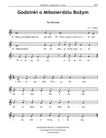 651 Modlitwy, nabożeństwa i inne Godzinki o Miłosierdziu Bożym Na Jutrznię m.: J. Kosko & W œ œ K.: Boże, przybądź nam na & po- moc. œ W K.: Miłosierdzie j œ &‰ j œ œ W.: U - fa - my j œ 1. Mi - ło Pa j œ - j j œ œ œ J j œ œ j œ œ J j œ œ ‰ nu, u - fa - my j œ œ Two - je, Pa j œ sier - dzie j œ ło, jest j œ i nie u j œ & j œ j œ j œ j œ j œ Za to dzię ki Ci skła & œj j œ j œ j œ j œ j œ ci Twej u by i - do - bro - - œ chro - ni świat nasz ca œ - œ œ W.: Panie, śpiesz nam na ra - tu - nek. j œ & œj j œ œ Pa - na j œ 5 & 4 œj W j œ j œ - œ sta nie, œ - nie. - œ da œ fa WSZELKIE PRAWA ZASTRZEŻONE Copyright © by Paweł Bazan [email protected] - œ - - - - - ły. œ Pa œ - - my œ my. nu. 652 Modlitwy, nabożeństwa i inne Hymn & 45 j œ j œ 1. Bo - że & œj z mi - & œj bez ło j œ wiecz - ny, j œ - wy - j œ & A j œ do j œ - sier j œ j œ by j œ czło - wie j œ j œ chcia - łeś j œ j œ - żad - nej & œj & j œ j œ j œ - Trój - je j œ j œ j œ nej Twej mi j œ in - j œ j œ - j œ nej świat j œ j œ ka prze j œ j œ & .. W dy œ - ło - coś j œ ob j œ ny, œ - ści, œ œ - - ny œ z ni - - œ - œ j #œ swo - im 2. Nowe miłosierdzia dziwy: Gdy człek pychą uwiedziony, sądem Twoim sprawiedliwym, z raju został wypędzony. Ty opuścić go nie chciałeś, Zbawiciela obiecałeś. - przy - czy - j œ łeś da - rzyć j œ œ œ - - œ - œ fi - œ ży - ci. - - cie œ œ - - ciem. 3. Boże jeden i Troisty, w miłosierdziu nieprzebrany, ku Twej chwale hymn wieczysty, w niebie nucą Ci wybrani. Wraz z niebieskim Jeruzalem, my głosimy Twoją chwałę. j œ œ œ .. œ J œ œ W K.: Miłosierdzie Bo - że ogarnia świat nasz ca - ły. W.: Bądźmy także miło - sier - ni jak nasz Bóg jest mi - ło-sier-ny. K.: O Krwi i Wo - do, któraś wypłynęła z Najświętszego Serca Je zu - so-we - go. W.: Jako zdrój miłosierdziadla nas, u - fa - my To-bie. & W K.: Dziękujemy Panu, bo jest W.: Bo Jego łaska trwa na œ do wie œ - bry. ki. Modlitwy, nabożeństwa i inne 653 Módlmy się: (z Wigilii Paschalnej) Boże, Ty w przedziwny sposób stworzyłeś człowieka i w jeszcze cudowniejszy sposób go odkupiłeś, spraw abyśmy siłą ducha opierali się powabom grzechu i zasłużyli na osiągnięcie wiecznej radości. Przez Chrystusa Pana naszego. W.: Amen. Na Prymę 1. Miłosierdzie Twoje, Panie, było, jest i nie ustanie. Za to dzięki Ci składamy i dobroci Twej ufamy. 2. Bogu Ojcu i Synowi i równemu im Duchowi, niech rozbrzmiewa serc hosanna szczera, wzniosła, nieustanna. Hymn 1. Pośród nocy, zła i grzechu, Miłosierdzia lśni Jutrzenka, Bogu, ludziom na pociechę, Maryja czysta Panienka. W Niej się spełnił cud miłości, Bóg pojednał się z ludzkością. 2. Oto Jezus, Bóg, Zbawiciel, Miłosierdzie w Nim wcielone, za nas oddał swoje życie, na haniebnym drzewie skonał. Taką ceną odkupieni, znów jesteśmy dziećmi Twymi. 3. W Sercu Twoim Jezu Chryste, Tyś nam skarbiec łask otworzył, niech więc płynie hymn wieczysty, na Twą cześć Baranku Boży. Miłosierdzia Twego chwałę, chcemy głosić życiem całym. 654 Modlitwy, nabożeństwa i inne K.: Miłosierdzie Boże usprawiedliwia nas przez Jezusa Chrystusa, naszego Pana. W.: Bądźmy także miłosierni jak nasz Bóg jest miłosierny. K.: O krwi i Wodo, któraś wypłynęła z Serca Jezusowego. W.: Jako zdrój miłosierdzia dla nas, ufamy Tobie. K.: O Boże nasz, składamy Ci dzięki, W.: Hymnami chwały Cię wywyższamy. Módlmy się: (z Uroczystości Zwiastowania NMP) Boże, z Twojej woli w łonie Maryi Dziewicy odwieczne Słowo przyjęło ludzkie ciało; abyśmy wyznając, że nasz Odkupiciel jest prawdziwym Bogiem i prawdziwym człowiekiem, zasłużyli na udział w Jego Boskiej naturze. Przez Chrystusa Pana naszego. W.: Amen. Na Tercję 1. Miłosierdzie Twoje, Panie, było, jest i nie ustanie. Za to dzięki Ci składamy i dobroci Twej ufamy. 2. Bogu Ojcu i Synowi i równemu im Duchowi, niech rozbrzmiewa serc hosanna szczera, wzniosła, nieustanna. Hymn 1. By obdarzyć świat pokojem z Serca włócznią otwartego, wytrysnęły te dwa zdroje, Miłosierdzia niezmiernego. Woda na grzechów obmycie, Krew, by karmić nasze życie. 2. I jak w arce Twej zbawienia, skarb złożony jest w Kościele, aby wszystkie pokolenia zeszły się w Mistycznym Ciele; By wysławiać całym życiem, Miłosierdzia tajemnicę. Modlitwy, nabożeństwa i inne 655 3. W Sercu Twoim, Jezu Chryste, Tyś nam skarbiec łask otworzył; Niech więc płynie hymn wieczysty, na Twą cześć, Baranku Boży. Miłosierdzia Twego chwałę, chcemy głosić całym życiem. K.: Miłosierdzie Boże koi serca udręczone. W.: Bądźmy także miłosierni jak nasz Bóg jest miłosierny. K.: O krwi i Wodo, któraś wypłynęła z Serca Jezusowego. W.: Jako zdrój miłosierdzia dla nas, ufamy Tobie. K.: Skosztujecie i zobaczcie jak nasz Pan jest dobry. W.: Szczęśliwy człowiek, który znajduje w Nim ucieczkę. Módlmy się: (z Uroczystości Najświętszego Ciała i Krwi Chrystusa) Boże, Ty w Najświętszym Sakramencie zostawiłeś nam pamiątkę swej Męki, daj nam taką czcią otaczać święte tajemnice Ciała i Krwi Twojej, abyśmy nieustannie doznawali owoców Twego odkupienia. Który żyjesz i królujesz na wieki wieków. W.: Amen. Na Sekstę 1. Miłosierdzie Twoje, Panie, było, jest i nie ustanie. Za to dzięki Ci składamy i dobroci Twej ufamy. 2. Bogu Ojcu i Synowi i równemu im Duchowi, niech rozbrzmiewa serc hosanna szczera, wzniosła, nieustanna. Hymn 1. Z wodą chrztu na świat spływają, Miłosierdzia hojne zdroje, dzieci gniewu przemieniając, w ukochane dzieci Twoje. Co przez wieczność będą całą, Miłosierdzia głosić chwałę. 656 Modlitwy, nabożeństwa i inne 2. Lecz Zbawiciel miłosierny, znając słabość naszą wielką, wie jak łatwośmy niewierni, jak cofamy się przed walką. Więc moc daje do działania, w sakramencie Bierzmowania. 3. W Sercu 