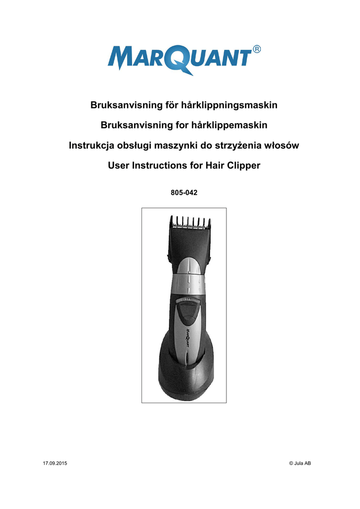 Bruksanvisning för hårklippningsmaskin Bruksanvisning for hårklippemaskin Instrukcja obsługi maszynki do strzyżenia włosów User Instructions for Hair Clipper 805-042 17.09.2015 © Jula AB SE - Bruksanvisning i original Rätten till ändringar förbehålles. Vid eventuella problem, kontakta vår serviceavdelning på telefon 0200-88 55 88. www.jula.se NO - Bruksanvisning (Oversettelse av original bruksanvisning) Med forbehold om endringer. Ved eventuelle problemer kan du kontakte vår serviceavdeling på telefon 67 90 01 34. www.jula.no PL - Instrukcja obsługi (Tłumaczenie oryginalnej instrukcji) Z zastrzeżeniem prawa do zmian. W razie ewentualnych problemów skontaktuj się telefonicznie z naszym działem obsługi klienta pod numerem: 22 338 88 88. www.jula.pl EN - Operating instructions (Translation of the original instructions) Jula reserves the right to make changes. In the event of problems, please contact our service department. www.jula.com Tillverkare/ Produsent / Producenci/ Manufacturer Jula AB, Box 363, 532 24 SKARA Importör/ Importør/ Importer/ Importer Jula Norge AS, Solheimsveien 6–8, 1471 LØRENSKOG Distributör/ Distributør/ Dystrybutor/ Distributor Jula Poland Sp. z o.o., ul. Malborska 49, 03-286 Warszawa, Polska 2 SVENSKA 4 Säkerhetsanvisningar ................................................................................................................................... 4 Barnsäkerhet ........................................................................................................................................ 4 Elsäkerhet ............................................................................................................................................ 4 Övriga skaderisker ............................................................................................................................... 4 Tekniska data ............................................................................................................................................... 5 Beskrivning ................................................................................................................................................... 5 Handhavande ............................................................................................................................................... 5 Laddning .............................................................................................................................................. 5 Information om laddningsbart batteri ................................................................................................... 5 Distanskam .......................................................................................................................................... 6 Underhåll ...................................................................................................................................................... 6 Smörjning av sax ................................................................................................................................. 7 NORSK 8 Sikkerhetsanvisninger .................................................................................................................................. 8 Barnesikkerhet ..................................................................................................................................... 8 El-sikkerhet .......................................................................................................................................... 8 Øvrige risikoer ...................................................................................................................................... 8 Tekniske data ............................................................................................................................................... 9 Beskrivelse ................................................................................................................................................... 9 Bruk .............................................................................................................................................................. 9 Lading .................................................................................................................................................. 9 Informasjon om oppladbart batteri ....................................................................................................... 9 Distansekam ...................................................................................................................................... 10 Vedlikehold ................................................................................................................................................. 10 Smøring av saks ................................................................................................................................ 11 POLSKI 12 Zasady bezpieczeństwa ............................................................................................................................. 12 Bezpieczeństwo dzieci ....................................................................................................................... 12 Bezpieczeństwo elektryczne .............................................................................................................. 12 Pozostałe zagrożenia......................................................................................................................... 12 Dane techniczne ......................................................................................................................................... 13 Opis ............................................................................................................................................................ 13 Obsługa ..............................................................................