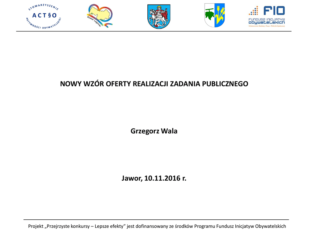 NOWY WZÓR OFERTY REALIZACJI ZADANIA PUBLICZNEGO Grzegorz Wala Jawor, 10.11.2016 r. Projekt „Przejrzyste konkursy – Lepsze efekty” jest dofinansowany ze środków Programu Fundusz Inicjatyw Obywatelskich 3.09.2016 r. weszło w życie Rozporządzenie Ministra Rodziny, Pracy i Polityki Społecznej z dnia 17 sierpnia 2016 r. w sprawie wzorów ofert i ramowych wzorów umów dotyczących realizacji zadań publicznych oraz wzorów sprawozdań z wykonania tych zadań. Projekt „Przejrzyste konkursy – Lepsze efekty” jest dofinansowany ze środków Programu Fundusz Inicjatyw Obywatelskich Rozporządzenie określa: 1) wzór oferty realizacji zadania publicznego oraz oferty wspólnej realizacji zadania publicznego, o których mowa w art. 14 ust. 1 i 2 ustawy z dnia 24 kwietnia 2003 r. o działalności pożytku publicznego i o wolontariacie, zwanej dalej „ustawą”, stanowiący załącznik nr 1 do rozporządzenia; 2) wzór oferty realizacji zadania publicznego oraz oferty wspólnej realizacji zadania publicznego, o których mowa w art. 14 ust. 1a i 2 ustawy, stanowiący załącznik nr 2 do rozporządzenia; (tzw. regranting) 3) ramowy wzór umowy o realizację zadania publicznego oraz umowy o realizację zadania publicznego na podstawie oferty wspólnej, o których mowa w art. 16 ust. 1 i 6 ustawy, stanowiący załącznik nr 3 do rozporządzenia; 4) ramowy wzór umowy o realizację zadania publicznego oraz umowy o realizację zadania publicznego na podstawie oferty wspólnej, o których mowa w art. 16 ust. 1a i 6 ustawy, stanowiący załącznik nr 4 do rozporządzenia; (tzw. regranting) 5) wzór sprawozdania z wykonania zadania publicznego, o którym mowa w art. 18 ust. 4 ustawy, stanowiący załącznik nr 5 do rozporządzenia; 6) wzór sprawozdania z wykonania zadania publicznego, o którym mowa w art. 18 ust. 5 ustawy, stanowiący załącznik nr 6 do rozporządzenia. (tzw. regranting) Projekt „Przejrzyste konkursy – Lepsze efekty” jest dofinansowany ze środków Programu Fundusz Inicjatyw Obywatelskich NAJWAŻNIEJSZE ZMIANY: - rezygnowano z konieczności podawania niektórych danych dotyczących np. daty wpisu lub rejestracji organizacji, numeru NIP i REGON oraz numeru wpisu do rejestru przedsiębiorców i przedmiotu działalności gospodarczej, - wprowadzono możliwość oszacowania przez oferenta w kosztorysie zadania wartości wkładu rzeczowego w zakresie w jakim będzie on wykorzystany podczas realizacji zadania publicznego, - rozbudowano kosztorys zadania (podział wkładu własnego, wyodrębnienie kosztów partnerów), - skrócono listę załączników. Projekt „Przejrzyste konkursy – Lepsze efekty” jest dofinansowany ze środków Programu Fundusz Inicjatyw Obywatelskich „PODSTAWOWY” WZÓR OFERTY Projekt „Przejrzyste konkursy – Lepsze efekty” jest dofinansowany ze środków Programu Fundusz Inicjatyw Obywatelskich WZÓR OFERTA REALIZACJI ZADANIA PUBLICZNEGO* / OFERTA WSPÓLNA REALIZACJI ZADANIA PUBLICZNEGO*, Oferta wspólna dotyczy sytuacji, gdy ofertę składa więcej niż jeden podmiot uprawniony do ubiegania się o dofinansowanie (w takim przypadku niezbędna jest umowa oferty wspólnej lub umowa o współpracy). O KTÓRYCH MOWA W ART. 14 UST. 1 I 2 USTAWY Z DNIA 24 KWIETNIA 2003 R. O DZIAŁALNOŚCI POŻYTKU PUBLICZNEGO I O WOLONTARIACIE (DZ. U. Z 2016 R. POZ. 239 I 395) POUCZENIE co do sposobu wypełniania oferty: Ofertę należy wypełnić wyłącznie w białych pustych polach, zgodnie z instrukcjami umieszonymi przy poszczególnych polach lub w przypisach. W przypadku pól, które nie dotyczą danej oferty, należy wpisać „nie dotyczy” lub przekreślić pole. Zaznaczenie „*”, np.: „Krajowym Rejestrem Sądowym*/właściwą ewidencją*”, oznacza, że należy skreślić niewłaściwą odpowiedź i pozostawić prawidłową. Przykład: „Krajowym Rejestrem Sądowym*/właściwą ewidencją*”. Projekt „Przejrzyste konkursy – Lepsze efekty” jest dofinansowany ze środków Programu Fundusz Inicjatyw Obywatelskich I. Podstawowe informacje o złożonej ofercie 1. Organ administracji publicznej, do którego jest adresowana oferta 2. Rodzaj zadania publicznego1) W zależności od podmiotu ogłaszającego konkurs, np. Burmistrz Miasta Jawora Należy wskazać rodzaj zadania, o którym mowa w art. 13 ust. 2 pkt 1 ustawy z dnia 24 kwietnia 2003 r. o działalności pożytku publicznego i o wolontariacie, wynikający z ogłoszenia o otwartym konkursie ofert 3. Tytuł zadania publicznego Data rozpoczęcia 4. Termin realizacji zadania publicznego Data nie może być wcześniejsza niż rozpoczęcie projektu zgodnie z ogłoszeniem konkursu Data zakończenia Data nie może być późniejsza niż zakończenie projektu zgodnie z ogłoszeniem konkursu [1] Wypełnić jedynie w przypadku, gdy oferta została złożona w związku z ogłoszonym przez organ otwartym konkursem ofert. Należy wskazać rodzaj zadania, o którym mowa w art. 13 ust. 2 pkt 1 ustawy z dnia 24 kwietnia 2003 r. o działalności pożytku publicznego i o wolontariacie, wynikający z ogłoszenia o otwartym konkursie ofert. Projekt „Przejrzyste konkursy – Lepsze efekty” jest dofinansowany ze środków Programu Fundusz Inicjatyw Obywatelskich II. Dane oferenta(-tów) 1. Nazwa oferenta(-tów), numer w Krajowym Rejestrze Sądowym lub innej ewidencji, adres siedziby lub adres do korespondencji Nie ma potrzeby wpisywania nr NIP, REGON W przypadku oferty wspólnej należy podać adekwatne dane dotyczące każdego z oferentów. 2. Inne dodatkowe dane kontaktowe, w tym dane osób upoważnionych do składania wyjaśnień dotyczących oferty (np. numer telefonu, adres poczty elektronicznej, numer faksu) Osoba, której dane zostaną podane w tym miejscu, powinna się orientować w merytoryce oferty. Zazwyczaj w tym miejscu podaje się dane kontaktowe potencjalnego koordynatora projektu. 3. Nazwa, adres i dane kontaktowe jednostki organizacyjnej bezpośrednio wykonującej zadanie publiczne, o kt