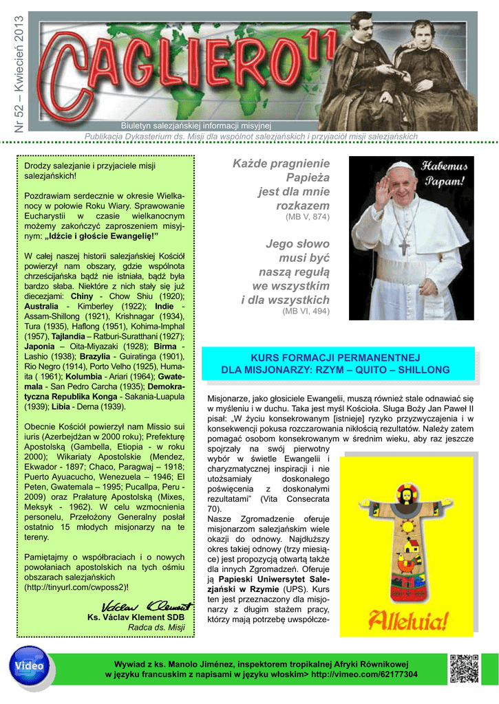 Nr 52 – Kwiecień 2013 Biuletyn salezjańskiej informacji misyjnej Publikacja Dykasterium ds. Misji dla wspólnot salezjańskich i przyjaciół misji salezjańskich Drodzy salezjanie i przyjaciele misji salezjańskich! Pozdrawiam serdecznie w okresie Wielkanocy w połowie Roku Wiary. Sprawowanie Eucharystii w czasie wielkanocnym możemy zakończyć zaproszeniem misyjnym: „Idźcie i głoście Ewangelię!” W całej naszej historii salezjańskiej Kościół powierzył nam obszary, gdzie wspólnota chrześcijańska bądź nie istniała, bądź była bardzo słaba. Niektóre z nich stały się już diecezjami: Chiny - Chow Shiu (1920); Australia - Kimberley (1922); Indie Assam-Shillong (1921), Krishnagar (1934), Tura (1935), Haflong (1951), Kohima-Imphal (1957), Tajlandia – Ratburi-Suratthani (1927); Japonia – Oita-Miyazaki (1928); Birma Lashio (1938); Brazylia - Guiratinga (1901), Rio Negro (1914), Porto Velho (1925), Humaita ( 1961); Kolumbia - Ariari (1964); Gwatemala - San Pedro Carcha (1935); Demokratyczna Republika Konga - Sakania-Luapula (1939); Libia - Derna (1939). Obecnie Kościół powierzył nam Missio sui iuris (Azerbejdżan w 2000 roku); Prefekturę Apostolską (Gambella, Etiopia - w roku 2000); Wikariaty Apostolskie (Mendez, Ekwador - 1897; Chaco, Paragwaj – 1918; Puerto Ayuacucho, Wenezuela – 1946; El Peten, Gwatemala – 1995; Pucallpa, Peru 2009) oraz Prałaturę Apostolską (Mixes, Meksyk - 1962). W celu wzmocnienia personelu, Przełożony Generalny posłał ostatnio 15 młodych misjonarzy na te tereny. Pamiętajmy o współbraciach i o nowych powołaniach apostolskich na tych ośmiu obszarach salezjańskich (http://tinyurl.com/cwposs2)! Ks. Václav Klement SDB Radca ds. Misji Każde pragnienie Papieża jest dla mnie rozkazem (MB V, 874) Jego słowo musi być naszą regułą we wszystkim i dla wszystkich (MB VI, 494) KURS FORMACJI PERMANENTNEJ DLA MISJONARZY: RZYM – QUITO – SHILLONG Misjonarze, jako głosiciele Ewangelii, muszą również stale odnawiać się w myśleniu i w duchu. Taka jest myśl Kościoła. Sługa Boży Jan Paweł II pisał: „W życiu konsekrowanym [istnieje] ryzyko przyzwyczajenia i w konsekwencji pokusa rozczarowania nikłością rezultatów. Należy zatem pomagać osobom konsekrowanym w średnim wieku, aby raz jeszcze spojrzały na swój pierwotny wybór w świetle Ewangelii i charyzmatycznej inspiracji i nie utożsamiały doskonałego poświęcenia z doskonałymi rezultatami” (Vita Consecrata 70). Nasze Zgromadzenie oferuje misjonarzom salezjańskim wiele okazji do odnowy. Najdłuższy okres takiej odnowy (trzy miesiące) jest propozycją otwartą także dla innych Zgromadzeń. Oferuje ją Papieski Uniwersytet Salezjański w Rzymie (UPS). Kurs ten jest przeznaczony dla misjonarzy z długim stażem pracy, którzy mają potrzebę uwspółcze- Wywiad z ks. Manolo Jiménez, inspektorem tropikalnej Afryki Równikowej w języku francuskim z napisami w języku włoskim> http://vimeo.com/62177304 śnienia. Rozpoczyna się rekolekcjami. Ofiaruje różne bloki tematyczne (Pismo Święte, antropologia, psychologia, katecheza, zagadnienia misjologiczne). Intymne spotkanie z osobą Jezusa dokonuje się we wspólnocie braterskiej, w klimacie miłości i w duchu rodzinnym, stwarzając wiele możliwości dzielenia się doświadczeniami i braterskiej interakcji. Uczestnicy salezjanie mogą ponadto odkryć na nowo bogactwo początków swojego Zgromadzenia i charyzmatu salezjańskiego poprzez pielgrzymkę do miejsc związanych ze świętymi salezjańskimi. Oprócz kursu organizowanego przez UPS, dla misjonarzy (Rodziny Salezjańskiej), którzy nie dysponują tak długim czasem, organizowane są krótkie kursy (trzy tygodnie) również w Regionie. Ich celem jest promowanie głębszego dialogu z kontekstem lokalnym. Jeden z takich kursów odbędzie się w Quito, Ekwador (w 2014) dla Regionów Ameryki (w języku hiszpańskim). W nadchodzącym sierpniu, podobny kurs odbędzie się w Shillong, Indie, dla dwóch Regionów Azji (w języku angielskim). Salezjanie, którzy chcą uzyskać więcej informacji na temat tego kursu mogą napisać do sekretariatu Dykasterium: [email protected] Ks. Jose Anikuzhikattil, SDB Dykasterium ds. Misji Misja należy do Boga… my mamy tylko siać! Podczas uniwersyteckich studiów prawniczych (1988-1992), razem z dziewczyną myśleliśmy pojechać do Afryki, już jako rodzina misyjna. Ale potem zdałem sobie sprawę, że owszem, jestem zadowolony, ale nie jestem szczęśliwy. Czegoś mi brakowało… Wtedy zacząłem słuchać i starać się być wiernym „wewnętrznemu głosowi serca”. Czytałem Słowo Boże, modliłem się, szukałem… Pewnego dnia poszedłem do spowiedzi, potem okazało się, że była to parafia salezjańska. Czułem jakby iskra zapaliła się w moim sercu. Kiedy, dzięki kierownictwu salezjanina, miałem pewność, że Jezus mnie woła, postanowiłem oddać się Panu na zawsze. Potrzeby są wszędzie; nawet jeśli prawdą jest, że jesteśmy wezwani do odpowiedzi na nie, trzeba je rozeznać, dostrzec, usłyszeć to, czego Bóg chce w danej sytuacji i w życiu każdego z nas. Kiedy mój przyjaciel salezjanin, który był ze mną, powiedział mi: „Teraz napisz do Przełożonego Generalnego”, napisałem i otrzymałem odpowiedź: „Posyłam cię do Pakistanu”. Dlaczego chciałem być misjonarzem, kiedy Argentyna też potrzebuje misjonarzy? Odpowiedź brzmi: „Ponieważ Bóg tego chciał”. Ostatecznym kryterium jest wezwanie Boga, to On posyła. Im więcej czasu mija, tym bardziej jestem przekonany o tym… Na poziomie osobistym, największym wyzwaniem było nauczyć się rozpoznawać i akceptować moje ograniczenia i moje słabości. Paradoksalnie, strach, ból, samotność, poczucie zdrady, nieumiejętność zrozumienia i panowania nad rzeczywistością, mogą stać się drogą, która pomaga stawać się osobą bardziej głęboką i bardziej szczerą wobec siebie samej. W kwestii wiary, wyz
