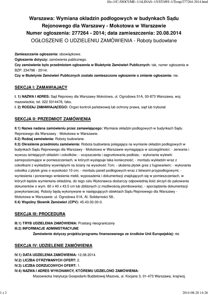 1z2 file:///C:/DOCUME~1/ALINAS~1/USTAWI~1/Temp/277264-2014.html Warszawa: Wymiana okładzin podłogowych w budynkach Sądu Rejonowego dla Warszawy - Mokotowa w Warszawie Numer ogłoszenia: 277264 - 2014; data zamieszczenia: 20.08.2014 OGŁOSZENIE O UDZIELENIU ZAMÓWIENIA - Roboty budowlane Zamieszczanie ogłoszenia: obowiązkowe. Ogłoszenie dotyczy: zamówienia publicznego. Czy zamówienie było przedmiotem ogłoszenia w Biuletynie Zamówień Publicznych: tak, numer ogłoszenia w BZP: 234798 - 2014r. Czy w Biuletynie Zamówień Publicznych zostało zamieszczone ogłoszenie o zmianie ogłoszenia: nie. SEKCJA I: ZAMAWIAJĄCY I. 1) NAZWA I ADRES: Sąd Rejonowy dla Warszawy Mokotowa, ul. Ogrodowa 51A, 00-873 Warszawa, woj. mazowieckie, tel. 022 5314478, faks. I. 2) RODZAJ ZAMAWIAJĄCEGO: Organ kontroli państwowej lub ochrony prawa, sąd lub trybunał. SEKCJA II: PRZEDMIOT ZAMÓWIENIA II.1) Nazwa nadana zamówieniu przez zamawiającego: Wymiana okładzin podłogowych w budynkach Sądu Rejonowego dla Warszawy - Mokotowa w Warszawie. II.2) Rodzaj zamówienia: Roboty budowlane. II.3) Określenie przedmiotu zamówienia: Robota budowlana polegająca na wymianie okładzin podłogowych w budynkach Sądu Rejonowego dla Warszawy - Mokotowa w Warszawie wymagająca w szczególności: - zerwania i wywozu istniejących okładzin i cokolików; - oczyszczenia i zagruntowania podłoża; - wykonania wylewki samopoziomujące w pomieszczeniach, w których występuje taka konieczność; - montażu wykładzin wraz z cokolikami z wykładziny wywiniętymi na ściany na wysokość 7cm; - ułożenia płytek gres z fugowaniem; - wykonania cokolika z płytek gres o wysokości 10 cm; - montażu paneli podłogowych wraz z listwami przypodłogowymi; wyniesienia i ponownego wniesienia mebli, wyposażenia i dokumentacji znajdujących się w pomieszczeniach, w których będzie wymieniana okładzina, do tego celu Wykonawca dostarczy odpowiednią ilość skrzyń do pakowania dokumentów o wym. 60 x 40 x 43,5 cm lub zbliżonych (z możliwością plombowania); - sporządzenia dokumentacji powykonawczej. Roboty będą wykonywane w następujących obiektach Sądu Rejonowego dla Warszawy Mokotowa w Warszawie: ul. Ogrodowa 51A, Al. Solidarności 58.. II.4) Wspólny Słownik Zamówień (CPV): 45.43.00.00-0. SEKCJA III: PROCEDURA III.1) TRYB UDZIELENIA ZAMÓWIENIA: Przetarg nieograniczony III.2) INFORMACJE ADMINISTRACYJNE Zamówienie dotyczy projektu/programu finansowanego ze środków Unii Europejskiej: nie SEKCJA IV: UDZIELENIE ZAMÓWIENIA IV.1) DATA UDZIELENIA ZAMÓWIENIA: 12.08.2014. IV.2) LICZBA OTRZYMANYCH OFERT: 2. IV.3) LICZBA ODRZUCONYCH OFERT: 1. IV.4) NAZWA I ADRES WYKONAWCY, KTÓREMU UDZIELONO ZAMÓWIENIA: Mazowiecka Instytucja Gospodarki Budżetowej Mazovia, ul. Kocjana 3, 01-473 Warszawa, kraj/woj. 2014-08-20 14:26 2z2 file:///C:/DOCUME~1/ALINAS~1/USTAWI~1/Temp/277264-2014.html mazowieckie. IV.5) Szacunkowa wartość zamówienia (bez VAT): 362950,40 PLN. IV.6) INFORMACJA O CENIE WYBRANEJ OFERTY ORAZ O OFERTACH Z NAJNIŻSZĄ I NAJWYŻSZĄ CENĄ Cena wybranej oferty: 446428,99 Oferta z najniższą ceną: 446428,99 / Oferta z najwyższą ceną: 446428,99 Waluta: PLN. 2014-08-20 14:26