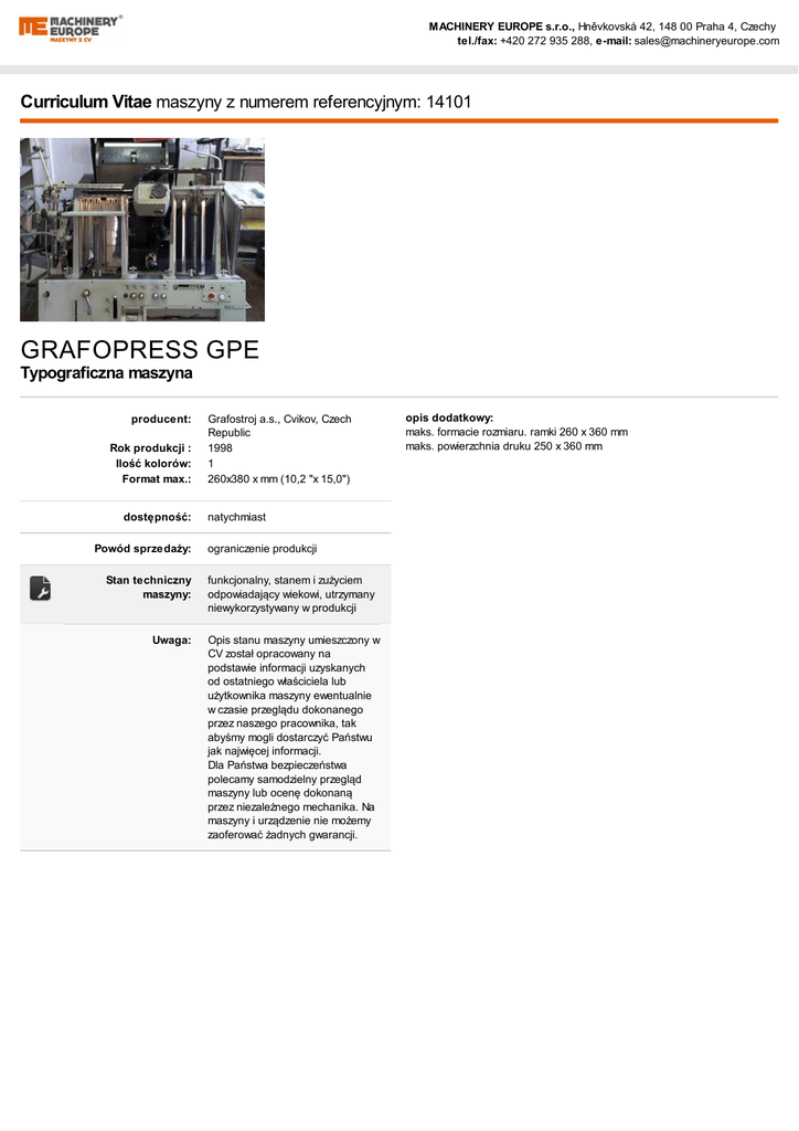 MACHINERY EUROPE s.r.o., Hněvkovská 42, 148 00 Praha 4, Czechy tel./fax: +420 272 935 288, e-mail: [email protected] Curriculum Vitae maszyny z numerem referencyjnym: 14101 GRAFOPRESS GPE Typograficzna maszyna producent: Rok produkcji : Ilość kolorów: Format max.: dostępność: Powód sprzedaży: Stan techniczny maszyny: Uwaga: Grafostroj a.s., Cvikov, Czech Republic 1998 1 260x380 x mm (10,2 "x 15,0") natychmiast ograniczenie produkcji funkcjonalny, stanem i zużyciem odpowiadający wiekowi, utrzymany niewykorzystywany w produkcji Opis stanu maszyny umieszczony w CV został opracowany na podstawie informacji uzyskanych od ostatniego właściciela lub użytkownika maszyny ewentualnie w czasie przeglądu dokonanego przez naszego pracownika, tak abyśmy mogli dostarczyć Państwu jak najwięcej informacji. Dla Państwa bezpieczeństwa polecamy samodzielny przegląd maszyny lub ocenę dokonaną przez niezależnego mechanika. Na maszyny i urządzenie nie możemy zaoferować żadnych gwarancji. opis dodatkowy: maks. formacie rozmiaru. ramki 260 x 360 mm maks. powierzchnia druku 250 x 360 mm