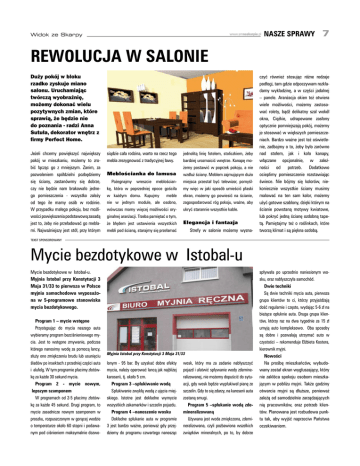 Widok ze Skarpy www.smnaskarpie.pl nasze sprawy 7 Rewolucja w salonie Duży pokój w bloku rzadko zyskuje miano salonu. Uruchamiając twórczą wyobraźnię, możemy dokonać wielu pozytywnych zmian, które sprawią, że będzie nie do poznania - radzi Anna Sutuła, dekorator wnętrz z firmy Perfect Home. Jeżeli chcemy powiększyć największy pokój w mieszkaniu, możemy to zrobić łącząc go z mniejszym. Zanim, za pozwoleniem spółdzielni pozbędziemy się ściany, zastanówmy się dobrze, czy nie będzie nam brakowało jednego pomieszczenia - wszystko zależy od tego ile mamy osób w rodzinie. W przypadku małego pokoju, bez możliwości powiększenia podstawową zasadą jest to, żeby nie przeładować go meblami. Najważniejszy jest stół, przy którym siądzie cała rodzina, warto na rzecz tego mebla zrezygnować z tradycyjnej ławy. jednolitą linię fotelem, stoliczkiem, żeby bardziej urozmaicić wnętrze. Kanapę możemy postawić w poprzek pokoju, a nie Meblościanka do lamusa wzdłuż ściany. Meblem zajmującym dużo meblościan- miejsca przestał być telewizor, pomyśl- kę, która w poprzedniej epoce gościła my więc w jaki sposób umieścić płaski w każdym domu. Kupujmy meble ekran, możemy go powiesić na ścianie, nie w jednym module, ale osobno, zagospodarować róg pokoju, ważne, aby wówczas mamy więcej możliwości ory- ukryć starannie wszystkie kable. Pożegnajmy wreszcie ginalnej aranżacji. Trzeba pamiętać o tym, że błędem jest ustawienia wszystkich Elegancja i fantazja Strefy w salonie możemy wyzna- mebli pod ścianą, starajmy się przełamać czyć również stosując różne rodzaje podłogi, tam gdzie odpoczywam rozkładamy wykładzinę, a w części jadalnej – panele. Aranżacja okien też otwiera wiele możliwości, możemy zastosować rolety, bądź delikatny szal wokół okna, Ciężkie, udrapowane zasłony optycznie pomniejszają pokój, możemy je stosować w większych pomieszczeniach. Bardzo ważne jest też oświetlenie, zadbajmy o to, żeby było zarówno nad stołem, jak i koło kanapy, włączane opcjonalnie, w zależności od potrzeb. Dodatkowo ocieplimy pomieszczenie rozstawiając świece. Nie bójmy się kolorów, niekoniecznie wszystkie ściany musimy malować na ten sam kolor, możemy użyć gotowe szablony, dzięki którym na ścianie powstaną motywy kwiatowe, lub pokryć jedną ścianę ozdobną tapetą. Pamiętajmy też o roślinkach, które tworzą klimat i są piękna ozdobą. TEKST SPONSOROWANY Mycie bezdotykowe w Istobal-u Mycie bezdotykowe w Istobal-u. Myjnia Istobal przy Konstytucji 3 Maja 31/33 to pierwsza w Polsce myjnia samochodowa wyposażona w 5-programowe stanowiska mycia bezdotykowego. Program 1 – mycie wstępne Przystępując do mycia naszego auta wybieramy program bezciśnieniowego mycia. Jest to wstępne zmywanie, podczas którego nanosimy wodę za pomocą lancy, służy ono zmiękczeniu brudu lub usunięciu śladów po insektach z przedniej części auta i alufelg. W tym programie płacimy złotówkę za każde 30 sekund mycia. Program 2 - mycie nowym, lepszym szamponem W programach od 2-5 płacimy złotówkę za każde 45 sekund. Drugi program, to mycie zasadnicze nowym szamponem w proszku, rozpuszczonym w gorącej wodzie o temperaturze około 60 stopni i podawanym pod ciśnieniem maksymalnie dozwo- Myjnia Istobal przy Konstytucji 3 Maja 31/33 lonym - 95 bar. By uzyskać dobre efekty mycia, należy operować lancą jak najbliżej karoserii, tj. około 5 cm. Program 3 –spłukiwanie wodą Spłukiwanie zwykłą wodą z ujęcia miejskiego. Istotne jest dokładne wymycie wszystkich zakamarków i szczelin pojazdu. Program 4 –nanoszenie wosku Dokładne spłukanie auta w programie 3 jest bardzo ważne, ponieważ gdy przejdziemy do programu czwartego nanosząc wosk, który ma za zadanie nabłyszczyć pojazd i ułatwić spływanie wody zdemineralizowanej, nie możemy dopuścić do sytuacji, gdy wosk będzie wypłukiwał pianę ze szczelin. Gdy to się zdarzy, na karoserii auta zostaną smugi. Program 5 –spłukanie wodą zdemineralizowaną Używana jest woda zmiękczona, zdemineralizowana, czyli pozbawiona wszelkich związków mineralnych, po to, by dobrze spływała po uprzednio naniesionym wosku, oraz nabłyszczyła samochód. Dwie techniki Są dwie techniki mycia auta, pierwsza grupa klientów to ci, którzy przyjeżdżają dość regularnie i często, wydając 5-6 zł na bieżące opłuknie auta. Druga grupa klientów, którzy raz na dwa tygodnie za 15 zł umyją auto kompleksowo. Oba sposoby są dobre i pozwalają utrzymać auto w czystości – rekomenduje Elżbieta Kostera, kierownik myjni. Nowości Na prośbę mieszkańców, wybudowany został ekran wygłuszający, który nie zakłóca spokoju osobom mieszkającym w pobliżu myjni. Także godziny otwarcia myjni są dłuższe, ponieważ zależą od samodzielnie zarządzających nią pracowników, oraz potrzeb klientów. Planowana jest rozbudowa punktu tak, aby wyjść naprzeciw Państwa oczekiwaniom.