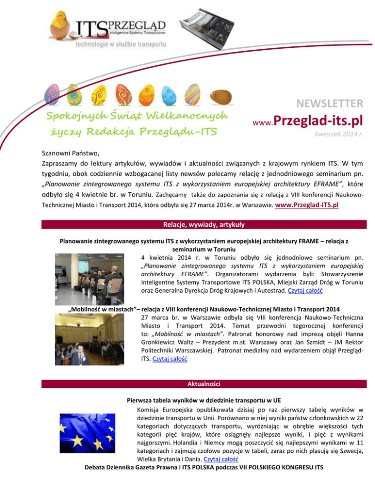 NEWSLETTER www. Przeglad-its.pl kwiecień 2014 r. Szanowni Państwo, Zapraszamy do lektury artykułów, wywiadów i aktualności związanych z krajowym rynkiem ITS. W tym tygodniu, obok codziennie wzbogacanej listy newsów polecamy relację z jednodniowego seminarium pn. „Planowanie zintegrowanego systemu ITS z wykorzystaniem europejskiej architektury EFRAME”, które odbyło się 4 kwietnie br. w Toruniu. Zachęcamy także do zapoznania się z relacją z VIII konferencji NaukowoTechnicznej Miasto i Transport 2014, która odbyła się 27 marca 2014r. w Warszawie. www.Przeglad-ITS.pl Relacje, wywiady, artykuły Planowanie zintegrowanego systemu ITS z wykorzystaniem europejskiej architektury FRAME – relacja z seminarium w Toruniu 4 kwietnia 2014 r. w Toruniu odbyło się jednodniowe seminarium pn. „Planowanie zintegrowanego systemu ITS z wykorzystaniem europejskiej architektury EFRAME”. Organizatorami wydarzenia byli: Stowarzyszenie Inteligentne Systemy Transportowe ITS POLSKA, Miejski Zarząd Dróg w Toruniu oraz Generalna Dyrekcja Dróg Krajowych i Autostrad. Czytaj całość „Mobilność w miastach”– relacja z VIII konferencji Naukowo-Technicznej Miasto i Transport 2014 27 marca br. w Warszawie odbyła się VIII konferencja Naukowo-Techniczna Miasto i Transport 2014. Temat przewodni tegorocznej konferencji to: „Mobilność w miastach”. Patronat honorowy nad imprezą objęli Hanna Gronkiewicz Waltz – Prezydent m.st. Warszawy oraz Jan Szmidt – JM Rektor Politechniki Warszawskiej. Patronat medialny nad wydarzeniem objął PrzeglądITS. Czytaj całość Aktualności Pierwsza tabela wyników w dziedzinie transportu w UE Komisja Europejska opublikowała dzisiaj po raz pierwszy tabelę wyników w dziedzinie transportu w Unii. Porównano w niej wyniki państw członkowskich w 22 kategoriach dotyczących transportu, wyróżniając w obrębie większości tych kategorii pięć krajów, które osiągnęły najlepsze wyniki, i pięć z wynikami najgorszymi. Holandia i Niemcy mogą poszczycić się najlepszymi wynikami w 11 kategoriach i zajmują czołowe pozycje w tabeli, zaraz po nich plasują się Szwecja, Wielka Brytania i Dania. Czytaj całość Debata Dziennika Gazeta Prawna i ITS POLSKA podczas VII POLSKIEGO KONGRESU ITS Podczas drugiego dnia Polskiego Kongresu ITS odbędzie się trzecia edycja debaty nt. Inteligentnych Systemów Transportowych. Organizatorami wydarzenia są Dziennik Gazeta Prawna oraz ITS POLSKA. Aktualnie trwają prace nad zaproszeniem gości z instytucji publicznych oraz zainteresowanych firm, które współfinansowałyby wydarzenie. Czytaj całość Zakończenie naboru projektów do konkursu LIDER ITS Informujemy, że z dniem 10 kwietnia 2014 r. (po przedłużeniu terminu nadsyłania prac) zakończony został nabór projektów do piątej edycji konkursu LIDER ITS współorganizowanego przez ITS POLSKA oraz redakcję Przeglądu-ITS. Dziękujemy wszystkim za zainteresowanie i udział w konkursie. Czytaj całość 12 mld euro na inwestycje transportowe w Europie 26 marca br. Komisja Europejska uruchomiła pierwszą transze funduszy na realizację transeuropejskiej sieci transportowej, w ramach której 12 mld euro, z całkowitej puli 26 mld euro zostanie przeznaczonych na projekty infrastrukturalne, mające poprawić połączenia transportowe w UE. Czytaj całość Współpraca Zespół redakcyjny zaprasza do współpracy: reklamowej (szczegóły dostępne na www.Przeglad-its.pl/REKLAMA); merytorycznej (przysyłanie informacji prasowych do bezpłatnej publikacji, propozycji artykułów, wywiadów). Kontakt Poproszę o dopisanie adresu e-mail: [email protected] do list mailingowych działów kontaktów z prasą lub public relations, chętnie będę zamieszczała Państwa informacje prasowe na łamach portalu www.PrzeglądITS.pl. Jeśli nie znajdują się Państwo w naszym katalogu "FIRMY" prosimy o nadesłanie swoich danych lub samodzielne dopisanie się do bazy. Uprzejmie informujemy, że Państwa adres został pozyskany bezpośrednio z Państwa strony internetowej lub z oficjalnych i ogólnie dostępnych baz danych i w związku z tym, w myśl przepisów o świadczeniu usług drogą elektroniczną (Dz. U. 2002 144.1204) niniejszy e-mail nie stanowi przesyłki mającej znamiona spamu. Jeśli jednak nie życzycie sobie Państwo dalszych informacji lub chcecie wskazać innych właściwych odbiorców prosimy o kontakt: Redakcja Przegląd ITS, e-mail: [email protected].