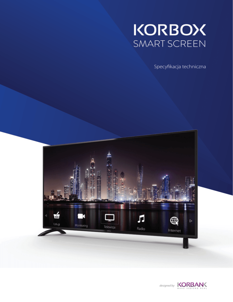 SMART SCREEN Specyfikacja techniczna designed by Specyfikacja techniczna Model Producent Przekątna ekranu Typ telewizora Korbox SmartScreen 42 Korbank SA 42 cale Odbiornik telewizji naziemnej oraz IP Matryca Rodzaj matrycy Format HD Rozdzielczość Częstotliwość odświeżania Jasność Kontrast Liczba kolorów Direct LED backlight screen Full HD 1366*768/1920*1080 200 Hz 500 cd/m2 2000:1 16,7 mln cyfrowy naziemny cyfrowy satelitarny nie nie DVB-T (MPEG-4) (71) nie Technologia wyświetlania 3D Zakrzywiony ekran Tuner Komunikacja Wi-Fi Bluetooth DLNA Wi-Fi Direct MHL - Mobile HD Link Smart TV Android IPTV Przeglądarka internetowa AllCast You Tube Dodatkowe cechy Nagrywanie na USB Sterowanie smartfonem Pilot na podczerwień Aktualizacja oprogramowania przez USB Montaż ścienny Porty / złącza Liczba złączy HDMI: Liczba złączy USB 3.0: Liczba złączy USB 2.0: Złącze MHL: Czytnik kart pamięci SD Analogowe wejście wideo SCART: Złącze LAN (RJ45): Analogowe wejście wideo YPbPr (component): Cyfrowe wyjście audio SPDIF: Wejście antenowe (coaxial): Moduł kart CI: Analogowe wejście audio (jack) Analogowe wyjście słuchawkowe (jack) 2 1 2 1 1 1 1 1 1 1 1 1 1 Zewnętrzne: kolor wymiary waga czarny błyszczący 938 x 545 x 89 mm 8 kg Klasa energetyczna: A+