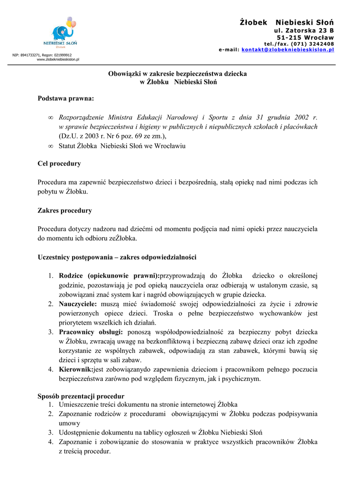 Żłobek Niebieski Słoń ul . Z a to rs ka 23 B 51-2 15 Wr o cła w tel./fax. (071) 3242408 e-mail: [email protected] NIP: 8941733271, Regon: 021999912 www.zlobekniebieskislon.pl Obowiązki w zakresie bezpieczeństwa dziecka w Żłobku Niebieski Słoń Podstawa prawna: • • Rozporządzenie Ministra Edukacji Narodowej i Sportu z dnia 31 grudnia 2002 r. w sprawie bezpieczeństwa i higieny w publicznych i niepublicznych szkołach i placówkach (Dz.U. z 2003 r. Nr 6 poz. 69 ze zm.), Statut Żłobka Niebieski Słoń we Wrocławiu Cel procedury Procedura ma zapewnić bezpieczeństwo dzieci i bezpośrednią, stałą opiekę nad nimi podczas ich pobytu w Żłobku. Zakres procedury Procedura dotyczy nadzoru nad dziećmi od momentu podjęcia nad nimi opieki przez nauczyciela do momentu ich odbioru zeŻłobka. Uczestnicy postępowania – zakres odpowiedzialności 1. Rodzice (opiekunowie prawni):przyprowadzają do Żłobka dziecko o określonej godzinie, pozostawiają je pod opieką nauczyciela oraz odbierają w ustalonym czasie, są zobowiązani znać system kar i nagród obowiązujących w grupie dziecka. 2. Nauczyciele: muszą mieć świadomość swojej odpowiedzialności za życie i zdrowie powierzonych opiece dzieci. Troska o pełne bezpieczeństwo wychowanków jest priorytetem wszelkich ich działań. 3. Pracownicy obsługi: ponoszą współodpowiedzialność za bezpieczny pobyt dziecka w Żłobku, zwracają uwagę na bezkonfliktową i bezpieczną zabawę dzieci oraz ich zgodne korzystanie ze wspólnych zabawek, odpowiadają za stan zabawek, którymi bawią się dzieci i sprzętu w sali zabaw. 4. Kierownik:jest zobowiązanydo zapewnienia dzieciom i pracownikom pełnego poczucia bezpieczeństwa zarówno pod względem fizycznym, jak i psychicznym. Sposób prezentacji procedur 1. Umieszczenie treści dokumentu na stronie internetowej Żłobka 2. Zapoznanie rodziców z procedurami obowiązującymi w Żłobku podczas podpisywania umowy 3. Udostępnienie dokumentu na tablicy ogłoszeń w Żłobku Niebieski Słoń 4. Zapoznanie i zobowiązanie do stosowania w praktyce wszystkich pracowników Żłobka z treścią procedur. Tryb dokonywania zmian w procedurze 1. Proponowane zmiany nie mogą być sprzeczne z prawem. 2. Zasady wchodzą w życie z dniem: ………. 3. Wprowadza się zmiany w treści zasad z dniem: ………. Opis procedury 1. Nauczyciel odpowiada za zdrowie i życie powierzonych jego opiece dzieci, a w przypadku narażenia ich na niebezpieczeństwo poniesie za to pełną odpowiedzialność dyscyplinarną. przyprowadzane do Żłobka od godziny 6:00 przez 2. Dzieci są rodziców/opiekunówprawnych bądź inne upoważnione osoby. Rodzice rozbierają dziecko i wprowadzają je do sali, w której dzieci przebywają pod opieką nauczyciela. Analogicznie rodzice/opiekunowie prawni lub inne upoważnione osoby odbierają dziecko z grupy bezpośrednio od nauczyciela. 3. Dzieci sąobjęte ciągłym dozorem, opieką nauczyciela i personelu pomocniczego. 4. Nauczyciel musi być obecny przy rozchodzeniu się dzieci do czasu, gdy wszystkie dzieci zostaną odebrane przez rodziców. 5. Nauczycielowi nie wolno podczas pracy z dziećmi ani na chwilę zostawić grupy samej. Gdy nauczyciel musi wyjść, np. do telefonu, toalety, grupą powinna się zająć osoba z personelu pomocniczego (np. woźna). Nauczyciel powinien ograniczyć swoją nieobecność do minimum. Nauczyciel musi umieć przewidzieć ewentualne skutki swojej nieobecności. 6. W razie konieczności sprawowania dodatkowej opieki nad dzieckiem, tj. wyjścia dziecka do toalety, zmiany bielizny z powodu zmoczenia się dziecka, nauczyciel powierza dziecko woźnej oddziałowej lub innemu nauczycielowi. Opiekę taką należy ograniczyć do minimum. 7. Nauczyciel musi skupić swoją uwagę na dzieciach – nie może zajmować się rozpraszającymi jego uwagę czynnościami, np. rozmową z inną osobą (bezpośrednio lub przez telefon komórkowy). 8. Dzieciom, które już weszły do sali, nie wolno podczas dnia wychodzić z niej samowolnie, bez powodu i dozoru. Nie wolno im też samowolnie wychodzić z budynku. Dziecko przez cały czas pobytu w Żłobku jest otoczone opieką nauczyciela lub upoważnionego pracownika Żłobka . 9. Nauczyciel (oraz personel pomocniczy) odpowiada za stan zabawek, którymi bawią się dzieci i sprzętu w sali zabaw.Każdorazowo przed rozpoczęciem zajęć nauczycielka powinna skontrolować salę zajęć, sprzęt, pomoce i zabawki. 10. Podczas zabaw dowolnych w sali nauczyciel (oraz personel pomocniczy) zwraca uwagę na bezkonfliktową i bezpieczną zabawę dzieci, ich zgodne korzystanie ze wspólnych zabawek. 11. Nauczyciele obserwują dzieci podczas zabaw, kierują zabawą lub ją inspirują, ewentualnie ingerują w konflikty między dziećmi, jeśli te nie są w stanie same ich rozwiązać. W czasie zabaw dowolnych nauczyciel zwraca przede wszystkim uwagę na bezpieczeństwo dzieci. 12. Nauczyciel ustala wspólnie z dziećmi zasady i normy obowiązujące w grupie, systematycznie wdraża dzieci do bezkonfliktowej zabawy, do przestrzegania zasad 2 zgodnego współżycia z rówieśnikami, uczestniczy w zabawach dzieci. Zapoznaje dzieci i ich rodziców z systemem kar i nagród obowiązujących w danej grupie. 13. Nauczyciel nie prowadzi rozmów z innymi osobami podczas zabaw dzieci. Jego uwaga powinna być skupiona wyłącznie na podopiecznych. Nauczyciel powinien mieć świadomość, jakie mogą być konsekwencje jego nieuwagi. 14. Podczas zajęć obowiązkowych zawsze należy przemyśleć organizacyjnie zajęcia, tok ćwiczeń ruchowych i przebieg zabawy pod kątem bezpieczeństwa dzieci. Nauczyciel musi przewidywać ewentualne zagrożenia i im przeciwdziałać. 15. Przy przemieszczaniu się grupy, np. na rytmikę, do szatni, na wycieczki piesze, dzieci ustawiają się w „pociąg”. 16. Nauczyciele mają ściśle wyznaczone godziny pracy z dziećmi. Obowiązkiem nauczyciela jest punktualne przychodzenie do pracy i za