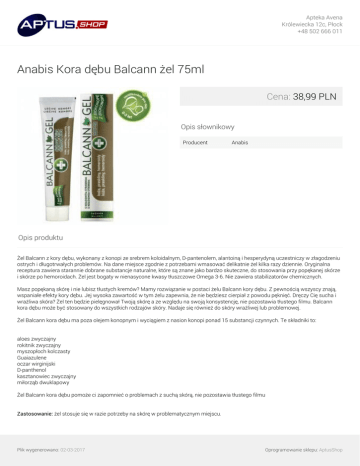 Apteka Avena Królewiecka 12c, Płock +48 502 666 011 Anabis Kora dębu Balcann żel 75ml Cena: 38,99 PLN Opis słownikowy Producent Anabis Opis produktu Żel Balcann z kory dębu, wykonany z konopi ze srebrem koloidalnym, D-pantenolem, alantoiną i hesperydyną uczestniczy w złagodzeniu ostrych i długotrwałych problemów. Na dane miejsce zgodnie z potrzebami wmasować delikatnie żel kilka razy dziennie. Oryginalna receptura zawiera starannie dobrane substancje naturalne, które są znane jako bardzo skuteczne, do stosowania przy popękanej skórze i skórze po hemoroidach. Żel jest bogaty w nienasycone kwasy tłuszczowe Omega 3-6. Nie zawiera stabilizatorów chemicznych. Masz popękaną skórę i nie lubisz tłustych kremów? Mamy rozwiązanie w postaci żelu Balcann kory dębu. Z pewnością wszyscy znają, wspaniałe efekty kory dębu. Jej wysoka zawartość w tym żelu zapewnia, że nie będziesz cierpiał z powodu pęknięć. Dręczy Cię sucha i wrażliwa skóra? Żel ten będzie pielęgnował Twoją skórę a ze względu na swoją konsystencję, nie pozostawia tłustego filmu. Balcann kora dębu może być stosowany do wszystkich rodzajów skóry. Nadaje się również do skóry wrażliwej lub problemowej. Żel Balcann kora dębu ma poza olejem konopnym i wyciągiem z nasion konopi ponad 15 substancji czynnych. Te składniki to: aloes zwyczajny rokitnik zwyczajny myszopłoch kolczasty Guaiazulene oczar wirginijski D-panthenol kasztanowiec zwyczajny miłorząb dwuklapowy Żel Balcann kora dębu pomoże ci zapomnieć o problemach z suchą skórą, nie pozostawia tłustego filmu Zastosowanie: żel stosuje się w razie potrzeby na skórę w problematycznym miejscu. Plik wygenerowano: 02-03-2017 Oprogramowanie sklepu: AptusShop Apteka Avena Królewiecka 12c, Płock +48 502 666 011 Složení (INCI): Aqua, Propylene Glycol, Quercus Robur Bark Extract, Glycerin, Cannabis Sativa Seed Extract, Aloe Barbadensis Leaf Juice, PEG-40 Hydrogenated Castor Oil, Hamamelis Virginiana Leaf Extract, Ruscus Aculeatus Root Extract, Panthenol, Cannabis Sativa Seed Oil, Aesculus Hippocastanum Fruit Extract, Ginkgo Biloba Leaf Extract, Carbomer, Triethanolamine, Eugenia Caryophyllus Bud Oil, Melaleuca Alternifolia Leaf Oil, Allantoin, Bisabolol, Diosmine, Hesperidin, Guaiazulene, Colloidal Silver. Plik wygenerowano: 02-03-2017 Powered by TCPDF (www.tcpdf.org) Oprogramowanie sklepu: AptusShop