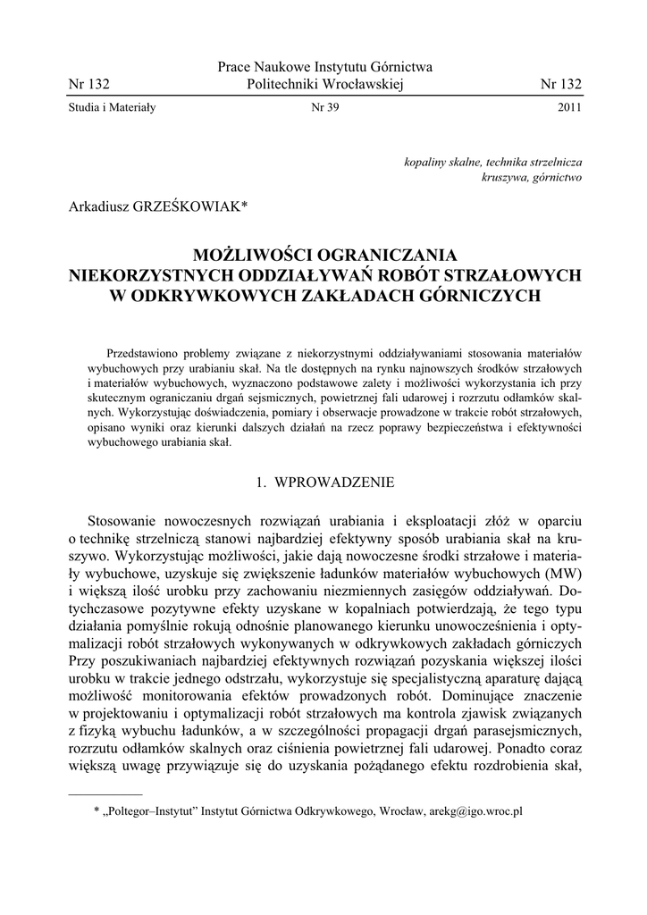 Nr 132 Prace Naukowe Instytutu Górnictwa Politechniki Wroc awskiej Studia i Materia y Nr 39 Nr 132 2011 kopaliny skalne, technika strzelnicza kruszywa, górnictwo Arkadiusz GRZE!KOWIAK* MO LIWO!CI OGRANICZANIA NIEKORZYSTNYCH ODDZIA"YWA# ROBÓT STRZA"OWYCH W ODKRYWKOWYCH ZAK"ADACH GÓRNICZYCH Przedstawiono problemy zwi"zane z niekorzystnymi oddzia ywaniami stosowania materia ów wybuchowych przy urabianiu ska . Na tle dost#pnych na rynku najnowszych $rodków strza owych i materia ów wybuchowych, wyznaczono podstawowe zalety i mo%liwo$ci wykorzystania ich przy skutecznym ograniczaniu drga& sejsmicznych, powietrznej fali udarowej i rozrzutu od amków skalnych. Wykorzystuj"c do$wiadczenia, pomiary i obserwacje prowadzone w trakcie robót strza owych, opisano wyniki oraz kierunki dalszych dzia a& na rzecz poprawy bezpiecze&stwa i efektywno$ci wybuchowego urabiania ska . 1. WPROWADZENIE Stosowanie nowoczesnych rozwi"za& urabiania i eksploatacji z ó% w oparciu o technik# strzelnicz" stanowi najbardziej efektywny sposób urabiania ska na kruszywo. Wykorzystuj"c mo%liwo$ci, jakie daj" nowoczesne $rodki strza owe i materiay wybuchowe, uzyskuje si# zwi#kszenie adunków materia ów wybuchowych (MW) i wi#ksz" ilo$' urobku przy zachowaniu niezmiennych zasi#gów oddzia ywa&. Dotychczasowe pozytywne efekty uzyskane w kopalniach potwierdzaj", %e tego typu dzia ania pomy$lnie rokuj" odno$nie planowanego kierunku unowocze$nienia i optymalizacji robót strza owych wykonywanych w odkrywkowych zak adach górniczych Przy poszukiwaniach najbardziej efektywnych rozwi"za& pozyskania wi#kszej ilo$ci urobku w trakcie jednego odstrza u, wykorzystuje si# specjalistyczn" aparatur# daj"c" mo%liwo$' monitorowania efektów prowadzonych robót. Dominuj"ce znaczenie w projektowaniu i optymalizacji robót strza owych ma kontrola zjawisk zwi"zanych z fizyk" wybuchu adunków, a w szczególno$ci propagacji drga& parasejsmicznych, rozrzutu od amków skalnych oraz ci$nienia powietrznej fali udarowej. Ponadto coraz wi#ksz" uwag# przywi"zuje si# do uzyskania po%"danego efektu rozdrobienia ska , __________ * „Poltegor–Instytut” Instytut Górnictwa Odkrywkowego, Wroc aw, [email protected] 100 prawid owo$ci kszta tu usypu oraz stanu sp"gu i ociosu po strzelaniu. Najcz#$ciej ju% na etapie projektowania robót strza owych du%y nacisk k adziony jest na ograniczanie wychodu bry nadwymiarowych, maj"cy na celu minimalizacj# lub eliminacj# robót zwi"zanych z wtórnym rozdrabnianiem. Dobór parametrów strzelania musi uwzgl#dnia': rodzaj i w a$ciwo$ci fizyko-mechaniczne urabianych ska , budow# geologiczn" oraz geometri# zabierki przewidzianej do urobienia. Informacje na ten temat musz" by' skorelowane z w a$ciwo$ciami energetycznymi przewidzianych do zastosowania materia ów wybuchowych oraz mo%liwo$ci systemu inicjacji w otworach. Obecnie $rodki strza owe zapewniaj" du%e mo%liwo$ci sterowania procesem detonacji adunków przy wybuchowym urabianiu ska [9]. Ze wzgl#du na cz#ste przypadki prowadzenia eksploatacji w pobli%u obiektów chronionych (zabudowania mieszkalno-gospodarcze, budynki u%yteczno$ci publicznej, drogi, linie teletechniczne i energetyczne, ruroci"gi i inne) konieczne jest skuteczne ograniczanie zasi#gu rozprzestrzeniania drga& sejsmicznych oraz rozrzutu od amków skalnych. 2. ZA(O)ENIA I WARUNKI PROWADZENIA ROBÓT STRZA(OWYCH Stosowanie popularnych ju% nieelektrycznych systemów inicjacji daje mo%liwo$' takiego oddzia ywania MW na calizn# skaln", aby przy zachowanym bezpiecze&stwie i minimalizacji oddzia ywa& na otoczenie uzyska' jak najlepsze efekty. Du%e zró%nicowanie w a$ciwo$ci fizykomechanicznych i specyfika ska eksploatowanych na kruszywo, nie pozwalaj" na proste zdefiniowanie parametrów strzelania i prowadzenia wydobywania, ujmuj"cych to zagadnienie w sposób uniwersalny. Badania terenowe dotycz"ce mo%liwo$ci i efektów zastosowania nowych $rodków strza owych i metod strzelania, prowadzono we wspó pracy z Orica Poland, EPC Polska czy PGS. Uzyskane wyniki potwierdzi y potrzeb# prowadzenia i rozwijania bada& nad nowoczesnymi rozwi"zaniami wieloszeregowego strzelania milisekundowego, szczególnie pod k"tem ich dostosowania do zró%nicowanych w a$ciwo$ci ska . W zale%no$ci od schematu budowy geologicznej z o%a, mo%liwy jest dobór parametrów prowadzenia robót strza owych w sposób zapewniaj"cy uzyskiwanie oczekiwanej granulacji urobku lub odpowiedniego przygotowania, ukszta towania usypu pod k"tem maszyn stosowanych w dalszym procesie za adunku i transportu. Optymalizacja procesu urabiania ska , prowadzona jest ju% na etapie projektowania robót strza owych determinuj"c dalszy proces urabiania, przeróbki i transportu kopalin. 101 3. (ADUNEK JEDNOSTKOWY MW Konieczno$' lepszego wykorzystania z ó% kopalin skalnych stawia coraz wy%sze wymagania dotycz"ce racjonalnego prowadzenia eksploatacji i dostosowania procesu urabiania do warunków zalegania z ó% i ich w a$ciwo$ci fizykomechanicznych. Optymalizacj# uzyskania jednorazowo wi#kszej ilo$ci urobku oraz zmniejszenie powstawania bry nadwymiarowych wyznacza si# w oparciu o kryteria [3]: – optymalizacj granulacji urobku, okre$lan" zmniejszeniem frakcji nadwymiarowych i podziarna, – ograniczania propagacji niekorzystnych efektów stosowania MW, b#d"cych wyrazem strat energetycznych stosowanej metody strzelania, – zachowania prawid owego stanu sp"gu i ociosów po strzelaniu, – uzyskania oczekiwanego kszta tu i wysoko$ci usypu. Nadrz#dne znaczenie ma optymalizacja energii zwi"zanej z jednostkowym zu%yciem MW koniecznym do odspojenia, skruszenia i przemieszczenia ska y [6]. Zu%ycie jednostkowe MW – qj [kg/m3] jest wska*nikiem zaanga%owania ilo$ci materia u przypadaj"cego na jednostk# urabianej calizny w odniesieniu do jej obj#to$ci lub masy. Parametr ten wp ywa w istotny sposób na wzrost obj#to$ci kruszenia calizny skalnej [1]. Gradient pola napr#%e& wywo any detonacj" stanowi o obj#to$ci calizny poddanej urabianiu. Przy dzia aj"cej na calizn# w punkcie ene