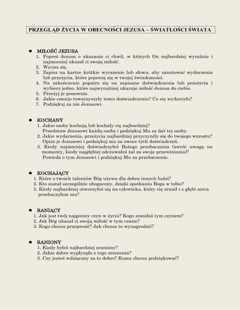 PRZEGLĄD ŻYCIA W OBECNOŚCI JEZUSA – ŚWIATŁOŚCI ŚWIATA MIŁOŚĆ JEZUSA 1. Poproś Jezusa o ukazanie ci chwil, w których On najbardziej wyraźnie i najmocniej ukazał ci swoją miłość. 2. Wycisz się. 3. Zapisz na kartce krótkie wyrażenie lub słowa, aby zanotować wydarzenia lub przeżycia, które pojawią się w twojej świadomości. 4. Na zakończenie popatrz się na zapisane doświadczenia lub przeżycia i wybierz jedno, które najwyraźniej ukazuje miłość Jezusa do ciebie. 5. Przeżyj je ponownie. 6. Jakie emocje towarzyszyły temu doświadczeniu? Co się wydarzyło? 7. Podziękuj za nie Jezusowi. KOCHANY 1. Jakie osoby kochają lub kochały cię najbardziej? Przedstaw Jezusowi każdą osobę i podziękuj Mu za dar tej osoby. 2. Jakie wydarzenia, przeżycia najbardziej przyczyniły się do twojego wzrostu? Opisz je Jezusowi i podziękuj mu za owoce tych doświadczeń. 3. Kiedy najmocniej doświadczyłeś Bożego przebaczenia (zwróć uwagę na momenty, kiedy najgłębiej odczuwałeś żal za swoje przewinienia)? Powiedz o tym Jezusowi i podziękuj Mu za przebaczenie. KOCHAJĄCY 1. Które z twoich talentów Bóg używa dla dobra innych ludzi? 2. Kto został szczególnie ubogacony, dzięki spotkaniu Boga w tobie? 3. Kiedy najbardziej otworzyłeś się na człowieka, który cię zranił i z głębi serca przebaczyłem mu? RANIĄCY 1. Jak jest twój najgorszy czyn w życiu? Kogo zraniłeś tym czynem? 2. Jak Bóg ukazał ci swoją miłość w tym czasie? 3. Kogo chcesz przeprosić? Jak chcesz to wynagrodzić? RANIONY 1. Kiedy byłeś najbardziej zraniony? 2. Jakie dobro wypłynęło z tego zranienia? 3. Czy jesteś wdzięczny za to dobro? Komu chcesz podziękować?
