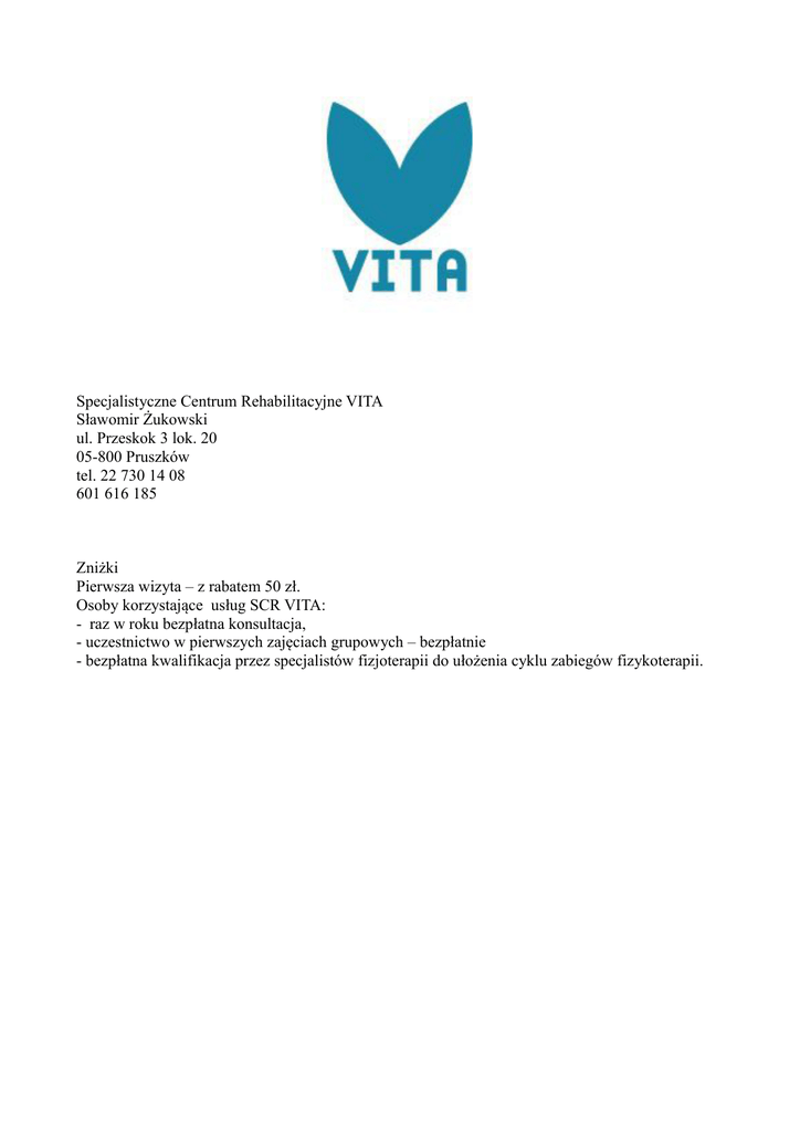 Specjalistyczne Centrum Rehabilitacyjne VITA Sławomir Żukowski ul. Przeskok 3 lok. 20 05-800 Pruszków tel. 22 730 14 08 601 616 185 Zniżki Pierwsza wizyta – z rabatem 50 zł. Osoby korzystające usług SCR VITA: - raz w roku bezpłatna konsultacja, - uczestnictwo w pierwszych zajęciach grupowych – bezpłatnie - bezpłatna kwalifikacja przez specjalistów fizjoterapii do ułożenia cyklu zabiegów fizykoterapii.