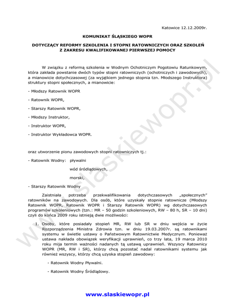 Katowice 12.12.2009r. KOMUNIKAT ŚLĄSKIEGO WOPR DOTYCZĄCY REFORMY SZKOLENIA I STOPNI RATOWNICZYCH ORAZ SZKOLEŃ Z ZAKRESU KWALIFIKOWANEJ PIERWSZEJ POMOCY op r.p l W związku z reformą szkolenia w Wodnym Ochotniczym Pogotowiu Ratunkowym, która zakłada powstanie dwóch typów stopni ratowniczych (ochotniczych i zawodowych), a mianowicie dotychczasowej (za wyjątkiem jednego stopnia tzn. Młodszego Instruktora) struktury stopni społecznych, a mianowicie: - Młodszy Ratownik WOPR - Ratownik WOPR, - Starszy Ratownik WOPR, w w .s la sk ie w - Młodszy Instruktor, - Instruktor WOPR, - Instruktor Wykładowca WOPR. oraz utworzenie pionu zawodowych stopni ratowniczych tj.: - Ratownik Wodny: pływalni wód śródlądowych, morski, - Starszy Ratownik Wodny w Zaistniała potrzeba przekwalifikowania dotychczasowych „społecznych” ratowników na zawodowych. Dla osób, które uzyskały stopnie ratownicze (Młodszy Ratownik WOPR, Ratownik WOPR i Starszy Ratownik WOPR) wg dotychczasowych programów szkoleniowych (tzn.: MR – 50 godzin szkoleniowych, RW – 80 h, SR – 10 dni) czyli do końca 2009 roku istnieją dwie możliwości: 1. Osoby, które posiadały stopień MR, RW lub SR w dniu wejścia w życie Rozporządzenia Ministra Zdrowia tzn. w dniu 19.03.2007r. są ratownikami systemu w świetle ustawy o Państwowym Ratownictwie Medycznym. Ponieważ ustawa nakłada obowiązek weryfikacji uprawnień, co trzy lata, 19 marca 2010 roku mija termin ważności nadanych tą ustawą uprawnień. Wszyscy Ratownicy WOPR (MR, RW i SR), którzy chcą pozostać nadal ratownikami systemu jak również wszyscy, którzy chcą uzyska stopień zawodowy: - Ratownik Wodny Pływalni. - Ratownik Wodny Śródlądowy. www.slaskiewopr.pl - Ratownik Wodny Morski. - Starszy Ratownik Wodny. op r.p l muszą przejść recertyfikację tj. państwowy egzamin z zakresu Kwalifikowanej Pierwszej Pomocy. Do egzaminu można podejść bez dodatkowego szkolenia wnosząc stosowne opłaty egzaminacyjne (aktualnie 200 zł/osoby) przy czym należy sobie zdawać sprawę, że zakres materiału, który należy umieć jest dosyć duży i odbiegający od wiedzy jaką uzyskaliśmy z tego zakresu na kursach ratowniczych. Z tego powodu Zarząd Wojewódzki WOPR w Katowicach uruchamia cykl szkoleń przygotowujących do egzaminu weryfikacyjnego w zakresie Kwalifikowanej Pierwszej Pomocy. Po zdaniu egzaminu z KPP każdy Ratownik WOPR może uzyskać stopień zawodowy: Ratownik Wodny pływalni, śródlądowy i morski po wniesieniu minimalnych opłat manipulacyjnych w wysokości 10 zł/za każde z tych uprawnień. Starszy Ratownik WOPR może uzyskać stopień zawodowy Starszego Ratownika Wodnego na podobnej zasadzie. w w .s la sk ie w Reforma szkolenia w WOPR zakłada, że Młodszy Ratownik WOPR wg nowego programu, nie może pracować, natomiast wszyscy, którzy uzyskali stopień do dnia 31.12.2009r. wg starego systemu tj. na 50 godzinnym kursie szkoleniowym mogą pracować zarobkowo. To samo dotyczy Ratowników WOPR (80 godzinny kurs szkoleniowy) i Starszych Ratowników WOPR (10-dniowy kurs szkoleniowy). Przy czym reforma zakłada, że Ratownik WOPR jest asystentem ratownika wyższego stopniem, czyli nie może pracować samodzielnie. 2. Natomiast osoby, które uzyskały uprawnienia ratownicze wg starego programu, ale po dniu 19 marca 2007 roku, aby uzyskać zawodowe stopnie jw. muszą przejść pełne 66 godzinne szkolenie z zakresu Kwalifikowanej Pierwszej Pomocy. Wychodząc na przeciw potrzebom ZW WOPR uruchomi takie szkolenia. Niestety koszt tego typu szkolenia średnio w kraju oscyluje ok. 1200 – 1500 zł od osoby, dlatego też czynimy starania o uzyskanie miejsc na kursach dofinansowywanych z Unii Europejskiej jak również próbujemy sami pozyskać takie fundusze. Dużym minusem tego typu szkoleń za pieniądze unijne jest bezwzględna obecność na wszystkich zajęciach pod groźbą zwrotu całej kwoty kosztów zazwyczaj w wysokości ok. 4500 – 4800 zł/osobę. Aktualna ścieżka edukacji ratowniczej (dla osób, które rozpoczynają szkolenie wg nowych programów szkoleniowych – dla przykładu Młodszy Ratownik WOPR od 24 do 50 godzin szkoleniowych, zdobywają kolejne uprawnienia społeczne tj.: w I - Młodszy Ratownik WOPR. Wymagania formalne; 1. Uczestnikiem może być osoba, która ukończyła 12 rok życia. 2. Uczestnik ma być członkiem WOPR. 3. Uczestnik ma złożyć: a/ pisemną zgodę na udział w kursie (w przypadku osoby niepełnoletniej pisemną zgodę wyraża jej opiekun prawny) b/ zaświadczenie lekarskie lub oświadczenie o braku przeciwwskazań do odbycia kursu (w przypadku osoby niepełnoletniej oświadczenie składa jej opiekun prawny) 4. Uczestnik ma posiadać kartę pływacką lub specjalną kartę pływacką. www.slaskiewopr.pl op r.p l II - Ratownik WOPR. Wymagania formalne: 1. Uczestnik ma mieć ukończony 16 rok życia. 2. Uczestnik ma posiadać: a/ stopień młodszego ratownika WOPR; b/ ważną legitymację członka WOPR z poświadczeniem lekarskim o zdolności do pracy w charakterze ratownika na dany rok kalendarzowy; c/ specjalną kartę pływacką; d/ patent lub uprawnienie przydatne w ratownictwie wodnym; e/ pisemną zgodę na udział w kursie (w przypadku osoby niepełnoletniej pisemną zgodę wyraża jej opiekun prawny). III - Starszy Ratownik WOPR. Wymagania formalne: 1. Uczestnik ma mieć ukończony 19 rok życia . 2. Uczestnik ma posiadać: a/ stopień ratownika WOPR; b/ ważną legitymacja członka WOPR z poświadczeniem lekarskim o w w .s la sk ie w zdolności do pracy w charakterze ratownika na dany rok kalendarzowy; c/ ważną kartę identyfikacyjną ratownika WOPR; d/ udokumentowane odbycie stażu co najmniej 200 godzin (h) pracy w stopniu ratownika WOPR, w tym co najmniej 50 h na wodach śródlądowych, 50 godzin na wodach morskich, 50 h na pływalniach lub parkach wodnych; e/ wypełnioną kartę kandydata na kurs przygotowujący do egzaminu na stopień starszego ratownika WOPR wg wzoru zamieszczon