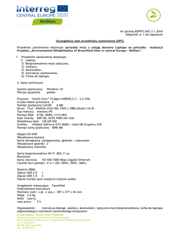 Nr sprawy BZPiFZ.042.3.1.2016 Załącznik nr 1 do zapytania Szczegółowy opis przedmiotu zamówienia (OPZ) Przedmiot zamówienia obejmuje sprzedaż wraz z usługą dostawy Laptopa na potrzeby Projektu „Environmental Rehabilitation of Brownfield Sites in central Europe – ReSites”. realizacji 1. Przedmiot zamówienia obejmuje: 1) Laptop, 2) Bezprzewodowa mysz optyczna, 3) Zasilacz, 4) Akumulator, 5) Instrukcja użytkowania, 6) Torba do laptopa. 2. Dane techniczne System operacyjny Wersja językowa Windows 10 polska Procesor Intel® Core™ i5 6gen 6300HQ 2,3 - 3,2 GHz Liczba rdzeni procesora 4 Pamięć podręczna CACHE 6 MB Ekran 15,6'', WUXGA (Full HD) 1920 x 1080 pikseli (16:9) Typ matrycy matowa IPS Pamięć RAM 8 GB, DDR4, 2133 MHz Dysk twardy 500 GB, SATA 5400 obr/min Dodatkowy dysk 128 GB SSD Grafika nVidia® GeForce GTX 960M + Intel HD Graphics 530 Pamięć karty graficznej 4096 MB Napęd CD/DVD Wbudowana kamera Karta dźwiękowa zintegrowana, głośniki + subwoofer Wbudowane głośniki 2 Wbudowany mikrofon Karta bezprzewodowa Wi-Fi 802.11 ac Bluetooth Karta sieciowa 10/100/1000 Mbps Gigabit Ethernet Czytnik kart pamięci 4 w 1 (SD, SDHC, SDXC, MMC) Wyjście HDMI Złącze USB 2.0 1 Złącze USB 3.0 2 Złącze Combo jack (wejście/wyjście audio) Urządzenie wskazujące TouchPad Podświetlana klawiatura Wymiary (szer. x gł. x wys.) 387 x 277 x 26 mm Waga 2,6 kg Kolor czarny czas pracy 5h Wyposażenie: instrukcja obsługi, zasilacz, akumulator, optyczna mysz bezprzewodowa, torba do laptopa odpowiadająca wymiarom zamówionego komputera Urząd Miasta i Gminy Solec Kujawski Wydział Inwestycji i Planowania Przestrzennego Biuro Zamówień Publicznych i Pozyskiwania Funduszy Zewnętrznych ul. 23 Stycznia 7 86-040 Solec Kujawski Tel. 52 387 0151 Gwarancja 24 miesiące Gwarancja baterii 12 miesięcy ……………............................. (data, podpis) Urząd Miasta i Gminy Solec Kujawski Wydział Inwestycji i Planowania Przestrzennego Biuro Zamówień Publicznych i Pozyskiwania Funduszy Zewnętrznych ul. 23 Stycznia 7 86-040 Solec Kujawski Tel. 52 387 0151