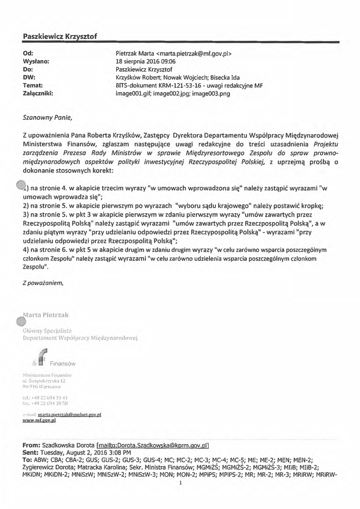 Paszkiewicz Krzysztof Od: Wysłano: Do: OW: Temat: Załączniki: Pietrzak Marta <[email protected]> 18 sierpnia 2016 09:06 Paszkiewicz Krzysztof Krzyśków Robert; Nowak Wojciech; Bisecka Ida 8115-dokument KRM-121-53-16 - uwagi redakcyjne MF image001.gif; image002jpg; image003.png Szanowny Panie, Z upoważnienia Pana Roberta Krzyśków, Zastępcy Dyrektora Departamentu Współpracy Międzynarodowej Ministerstwa Finansów, zgłaszam następujące uwagi redakcyjne do treści uzasadnienia Projektu zarzqdzenia Prezesa Rady Ministrów w sprawie Międzyresortowego Zespołu do spraw prawnomiędzynarodowych aspektów polityki inwestycyjnej Rzeczypospolitej Polskiej, z uprzejmą prośbą o dokonanie stosownych korekt: r• na stronie 4. w akapicie trzecim wyrazy TMw umowach wprowadzona się" należy zastąpić wyrazami "w umowach wprowadza się"; 2) na stronie 5. w akapicie pierwszym po wyrazach "wyboru sądu krajowego" należy postawić kropkę; 3) na stronie 5. w pkt 3 w akapicie pierwszym w zdaniu pierwszym wyrazy "umów zawartych przez Rzeczypospolitą Polską" należy zastąpić wyrazami "umów zawartych przez Rzeczpospolitą Polską", a w zdaniu piątym wyrazy "przy udzielaniu odpowiedzi przez Rzeczypospolitą Polską" - wyrazami "przy udzielaniu odpowiedzi przez Rzeczpospolitą Polską"; 4) na stronie 6. w pkt 5 w akapicie drugim w zdaniu drugim wyrazy "w celu zarówno wsparcia poszczególnym członkom Zespołu" należy zastąpić wyrazami "w celu zarówno udzielenia wsparcia poszczególnym członkom Zespotu". Z poważaniem, arta Pietrzak ii Główny Special ist3 Departa m imt Współ pracy M itglzynarodowej 45 ir Finansów Mirt€sterstwo Einansów k1i.:;\victokrzyska 12 011-916 Warszaw, td: +48 2269-1 31 41 -W 22 694 30 50 jnarta.pletrzak&inofnet.gov.n1 www,mf.gov.pt From: Szadkowska Dorota [mailto:Dorota.Szaclkowska(&korm.CIOV.Ol] Sent: Tuesday, August 2, 2016 3:08 PM To: ABW; CBA; CBA-2; GUS; G1JS-2; GUS-3; GUS-4; MC; MC-2; MC-3; MC-4; MC-5; ME; ME-2; MEN; MEN-2; Zygierewicz Dorota; Matracka Karolina; Sekr. Ministra Finansów; MGMi25; MGM125-2; MGMi25-3; MIiB; MIiB-2; MKiDN; MKiDN-2; MNiSzW; MN15zW-2; MNiSzW-3; MON; MON-2; MPiPS; MPiPS-2; MR; MR-2; MR-3; MRiRW; MRIRW1 2; MRIRW-3; MRiRW-4; MRIRW-5; MS; MS-2; M5-3; MS-4; MS11-; MS1T-2; MS1T-3; MSIT-4; MSIT-5; M5P; MSP-2; MSP3; MSP-4; MSW; MSW-2; MSW-3; MSZ; MSZ-2; MSZ-3; MSZ-4; M5; M5-2; MŚ-3; MZ; MZ-2; MZ-3; NBP; NBP-2; NBP3; RCL; RCL-2; U0KiK; Babińska Hanka Elżbieta; Biedrzycki Jacek; Bilióska Agnieszka; bip; Borzym Kinga; Brudnicka Patrycja; Bujak Izabela; Byszek Katarzyna; Cwilich-Mikolajczyk Jolanta; Czapla Alicja; Czarnacki Maciej; Filipek Agnieszka; Firlus Piotr; Grzeszczuk-Gniewek Małgorzata; Halota Renata; Hirszel Małgorzata; Jędrych Jarosław; Kamionek Marcin; Kaniewska Monika; Klech Alicja; Korszun Beata; Koza Jarosław; Kozłowska Kryspina; Krawczyk Wojciech; Król Elżbieta; Kucharska Magdalena; Lenart Sławomir; Lodkowska-Skoneczna Apolonia; Loniewska Julita; Malesza Jędrzej; Mazurkiewicz Tomasz; Moskaluk Agnieszka; Mościcka-Bqk Dorota; Olędzka Karolina; Pawłowska Agata; Rosa Krzysztof; Rosióska Dorota; Skalmowski Wojciech; Słotwióska-Rosłanowska Ewelina; Stępinska Beata; Sypuła Anna; Szadkowska Dorota; Szlifirska Marta; 5miała Katarzyna; Świderski Jacek; Wichrowska Kinga; Wierzchon Maria; Wolszc:zak Jan; Zarzecka Beata; Zwolinska Anna; Zólkowski Adam Subject: BITS-dokument KRM-121-53-16 Szanowni Państwo, w załączeniu przekazuję dokument KRM-121-53-16, przeznaczony do rozpatrzenia z terminem zgłaszania ewentualnych uwag do dnia 19 sierpnia 2016 r. Z poważaniem Anna Zwolinska (w zast. D. Szadkowskiej) DOROTA SZADKOWSKA Radca Szefa Kancelarii Prezesa Rady Ministrów w Departamencie Komitetu Rady Ministrów KANCELARIA PREZESA RADY MINISTRÓW • Ujazdowskie 1/3, 00-583 Warszawa te). +48 22 694 7450. fax +1822 694 74 81 • Doreta.Szadlcowska(tkorm qoypt THE CHANCELLERY OF THE PRIME MINISTER Counaellor to the Head of the Chanceilery ot the Prime Minister Ai. Ujazdowskie 113, 00-583 Warszawa Phone. +48 22 694 7450. fax: +48 22 694 74 81 • [email protected] 2