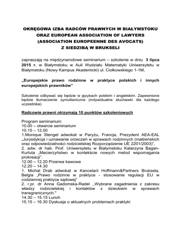 OKRĘGOWA IZBA RADCÓW PRAWNYCH W BIAŁYMSTOKU ORAZ EUROPEAN ASSOCIATION OF LAWYERS (ASSOCIATION EUROPEENNE DES AVOCATS) Z SIEDZIBĄ W BRUKSELI zapraszają na międzynarodowe seminarium – szkolenie w dniu 3 lipca 2015 r. w Białymstoku w Auli Wydziału Matematyki Uniwersytetu w Białymstoku (Nowy Kampus Akademicki) ul. Ciołkowskiego 1-1M, „Europejskie prawo rodzinne w praktyce polskich i innych europejskich prawników” Szkolenie odbywać się będzie w językach polskim i angielskim. Zapewnione będzie tłumaczenie symultaniczne (indywidualne słuchawki dla każdego uczestnika) Radcowie prawni otrzymają 10 punktów szkoleniowych Program seminarium: 10.00 – otwarcie seminarium 10.15 – 12.00 1.Monique Stengel adwokat w Paryżu, Francja, Prezydent AEA-EAL „Jurysdykcja i uznawanie orzeczeń w sprawach rodzinnych (małżeńskich oraz odpowiedzialności rodzicielskiej Rozporządzenie UE 2201/2003)”, 2. adw. dr hab. Prof. Uniwersytetu w Białymstoku Katarzyna BaganKurluta „Macierzyństwo w kontekście nowych metod wspomagania prokreacji”. 12.00 – 12.20 Przerwa kawowa 12.20 – 14.30 1. Michal Drab adwokat w Kancelarii Hoffmann&Partners Bruksela, Belgia „Prawo rodzinne w praktyce - stosowanie regulacji EU w codziennej praktyce sądowej” 2. r.pr. dr Anna Gadomska-Radel ,,Wybrane zagadnienia z zakresu władzy rodzicielskiej i kontaktów z dzieckiem w sprawach transgranicznych." 14.30 – 15.15 Lunch 15.15 – 16.30 Dyskusja o aktualnych problemach praktyki Wydarzenia towarzyszące 3 lipca 2015 r. 20.00 galowa kolacja z udziałem członków władz samorządu radcowskiego, władz AEA-EAL i uczestników konferencji, RESTAURACJA SAVOY Białystok ul. Kilińskiego 15, 4 lipca 2015 r. wycieczka do Białowieskiego Parku Narodowego Opłaty za udział w seminarium w dniu 3 lipca 2015 r. : Radcowie prawni – 120 zł, Aplikanci radcowscy – 60 zł, Opłaty z udział w wydarzeniach towarzyszących: Kolacja galowa – 150 zł, Wycieczka do Białowieskiego Parku Narodowego – 125 zł, Zgłoszenia udziału w seminarium i wydarzeniach towarzyszących będą przyjmowane do dnia 29 czerwca 2015 r. ilość miejsc ograniczona, decyduje kolejność zgłoszeń. Zgłoszenia należy przesyłać na adres [email protected], Wpłat należy dokonywać na konto OIRP Białystok nr 51 1130 1059 0017 3208 0920 0001 Rekomendowane hotele: Hotel Branicki ul. Ludwika Zamenhofa 25, 15-435 Białystok 4*, Hotel Aristo ul. Kilińskiego 15, 15-089 Białystok 3*, Best Western Hotel Cristal ul. Lipowa 3/5, 15-424 Białystok 3*, Hotel Gołębiewski Białystok ul. Pałacowa 7, 15-064 Białystok 4*, Hotel Esperanto ul. Legionowa 10, 15-099 Białystok 3*,