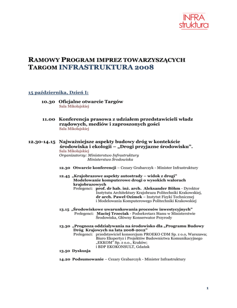 RAMOWY PROGRAM IMPREZ TOWARZYSZĄCYCH TARGOM INFRASTRUKTURA 2008 15 października, Dzień I: 10.30 Oficjalne otwarcie Targów Sala Mikołajskiej 11.00 Konferencja prasowa z udziałem przedstawicieli władz rządowych, mediów i zaproszonych gości Sala Mikołajskiej 12.30-14.15 Najważniejsze aspekty budowy dróg w kontekście środowiska i ekologii – „Drogi przyjazne środowisku”. Sala Mikołajskiej Organizatorzy: Ministerstwo Infrastruktury Ministerstwo Środowiska 12.30 Otwarcie konferencji – Cezary Grabarczyk - Minister Infrastruktury 12.45 „Krajobrazowe aspekty autostrady – widok z drogi” Modelowanie komputerowe drogi o wysokich walorach krajobrazowych Prelegenci: prof. dr hab. inż. arch. Aleksander Böhm - Dyrektor Instytutu Architektury Krajobrazu Politechniki Krakowskiej, dr arch. Paweł Ozimek – Instytut Fizyki Technicznej i Modelowania Komputerowego Politechniki Krakowskiej 13.15 „Środowiskowe uwarunkowania procesów inwestycyjnych” Prelegenci: Maciej Trzeciak - Podsekretarz Stanu w Ministerstwie Środowiska, Główny Konserwator Przyrody 13.30 „Prognoza oddziaływania na środowisko dla „Programu Budowy Dróg Krajowych na lata 2008-2012” Prelegenci: przedstawiciel konsorcjum PROEKO CDM Sp. z o.o, Warszawa; Biuro Ekspertyz i Projektów Budownictwa Komunikacyjnego „EKKOM” Sp. z o.o., Kraków; i BDP EKOKONSULT, Gdańsk 13.50 Dyskusja 14.20 Podsumowanie – Cezary Grabarczyk - Minister Infrastruktury 1 11.30-16.45 Konferencja ”Polska infrastruktura – szansa dla prywatnych inwestorów? ” Sala Goethego 11.30-14.00 Realizacja inwestycji infrastrukturalnych finansowanych przez kapitał prywatny – uwarunkowania prawne Organizator: Kancelaria Prawna Leśnodorski Ślusarek i Wspólnicy W wykładzie poruszone zostaną następujące zagadnienia: • Zagospodarowanie przestrzenne • Inwestycje samorządowe w projekty infrastrukturalne w ramach Partnerstwa Publiczno Prywatnego • Stała cena w komercyjnych kontraktach budowlanych Wykład poprowadzą Mecenas Justyna Bójko - Wspólnik, Radca Prawny i Kierownik Departamentu Inwestycji Majątkowych oraz mecenas Rafał Dębowski – Wspólnik i Kierownik Departamentu Nieruchomości i Inwestycji Budowlanych w Kancelarii Leśnodorski Ślusarek i Wspólnicy Dyskusja z udziałem przedstawicieli resortu drogownictwa, instytucji finansujących projekty infrastrukturalne, konsultanci branży, przedsiębiorcy budowlani. 14.00–14.15 przerwa 14.15–15.30 „Rozwój infrastruktury a rynek budownictwa mieszkaniowego” Organizator: redNet Consulting Jaki wpływ na rozwój rynku mieszkaniowego ma rozwój infrastruktury miejskiej i drogowej? Jak oszacować potencjalne korzyści i ryzyko? Na te pytania postarają się odpowiedzieć analitycy i doradcy redNet Consulting – lidera branży nieruchomości w zakresie profesjonalnego wsparcia na wszystkich etapach realizacji procesu inwestycyjnego, oferującego wsparcie merytoryczne dla firm deweloperskich, instytucji finansowych, banków oraz prywatnych inwestorów. 15.45-17.00 Infrastruktura a wizerunek samorządu Organizator: Eurocean Sp. z o.o. Agencja Public Relations EurOcean przedstawi nowatorskie opracowanie wpływu infrastruktury na wizerunek samorządu. Na przykładzie rzymskich akweduktów, współczesnych obwodnic, wieżowców, słynnych landmarków (m.in. most Akashi-Kaikyo), a także miast sprofilowanych wizerunkowo przez infrastrukturę („miasta sportowe”, „miasta studenckie”) specjaliści PR zaprezentują jak świadomie budować wizerunek samorządu za pomocą infrastruktury. W programie: Wpływ infrastruktury na postrzeganie wizerunku samorządu przez otoczenie wewnętrzne (społeczność lokalną). • Komunikacja o inwestycjach infrastrukturalnych • Kongestia i inne problemy transportu miejskiego oraz ich wpływ na wizerunek samorządu. • Infrastrukturalny landmark 2 • Lotnisko - elitarność miasta, wygoda dla społeczności • Infrastruktura informatyczna – czy samorząd dba o dostęp społeczności do informacji i nowych technologii? • Inwestycje samorządu w infrastrukturę – działania doraźne, czy przemyślana biznesowo strategia? • Wieżowce, kontrowersje w kwestii ich powstawania. Wpływ infrastruktury na postrzeganie wizerunku samorządu przez otoczenie zewnętrzne (media, inwestorów, turystów, polityków). W ramach spotkania swoje osiągnięcia i plany inwestycyjne zaprezentują największe miasta w Polsce. 14.30-16.45 „Projektowanie i realizacja inwestycji sportowych” – II sesja plenarna Ogólnopolskiego Forum Działaczy Samorządowych „Infrastruktura sportowa w gminach, miastach i powiatach” Sala Mikołajskiej Organizator: Krajowa Federacja Sportu dla Wszystkich na zlecenie Ministerstwa Sportu i Turystyki przy współpracy z MT Polska Spotkanie stanowi blok informacyjny branży sportowo-rekreacyjnej. W programie: 1. Baza sportowa w gminie 2. Budowa, finansowanie i utrzymanie obiektów sportowych w gminie 3. Nowe technologie w budownictwie obiektów sportowych 4. Energooszczędne systemy grzewcze 5. Budowa boisk ze sztuczną trawą i otwartych lodowisk 16 października, Dzień II: 10.15-17.00 Konferencja „Bezpieczeństwo w mieście i na drodze” Sala Goethego 10.15-12.45 „Inwestycje w bezpieczeństwo ruchu drogowego – korzystną lokata długoterminową.” Najlepsze praktyki, zachęta do działania. Organizator: Krajowa Rada Bezpieczeństwa Ruchu Drogowego Działania dotyczące poprawy bezpieczeństwa w ruchu drogowym realizowane przez jednostki samorządu terytorialnego, najlepsze projekty i najlepsze praktyki w zakresie bezpieczeństwa ruchu drogowego omówią przedstawiciele Krajowej Rady Bezpieczeństwa Ruchu Drogowego. Seminarium zostało przygotowane we współpracy z Unią Metropolii Miast Polskich. 13.00-14.45 „Miejski system monitoringu wizyjnego – niewykorzystywany potencjał” Organizator: Akademia Monitoringu Wizyjnego www.cctv.org.pl 3 Podczas prezentacji multimedialnej zostaną pr