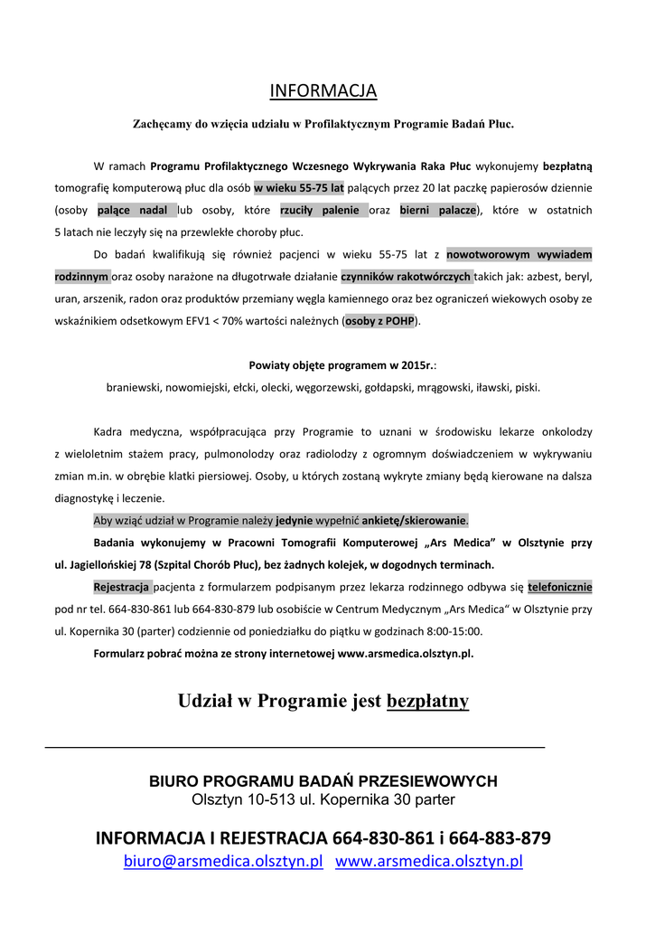 INFORMACJA Zachęcamy do wzięcia udziału w Profilaktycznym Programie Badań Płuc. W ramach Programu Profilaktycznego Wczesnego Wykrywania Raka Płuc wykonujemy bezpłatną tomografię komputerową płuc dla osób w wieku 55-75 lat palących przez 20 lat paczkę papierosów dziennie (osoby palące nadal lub osoby, które rzuciły palenie oraz bierni palacze), które w ostatnich 5 latach nie leczyły się na przewlekłe choroby płuc. Do badao kwalifikują się również pacjenci w wieku 55-75 lat z nowotworowym wywiadem rodzinnym oraz osoby narażone na długotrwałe działanie czynników rakotwórczych takich jak: azbest, beryl, uran, arszenik, radon oraz produktów przemiany węgla kamiennego oraz bez ograniczeo wiekowych osoby ze wskaźnikiem odsetkowym EFV1 < 70% wartości należnych (osoby z POHP). Powiaty objęte programem w 2015r.: braniewski, nowomiejski, ełcki, olecki, węgorzewski, gołdapski, mrągowski, iławski, piski. Kadra medyczna, współpracująca przy Programie to uznani w środowisku lekarze onkolodzy z wieloletnim stażem pracy, pulmonolodzy oraz radiolodzy z ogromnym doświadczeniem w wykrywaniu zmian m.in. w obrębie klatki piersiowej. Osoby, u których zostaną wykryte zmiany będą kierowane na dalsza diagnostykę i leczenie. Aby wziąd udział w Programie należy jedynie wypełnid ankietę/skierowanie. Badania wykonujemy w Pracowni Tomografii Komputerowej „Ars Medica” w Olsztynie przy ul. Jagiellooskiej 78 (Szpital Chorób Płuc), bez żadnych kolejek, w dogodnych terminach. Rejestracja pacjenta z formularzem podpisanym przez lekarza rodzinnego odbywa się telefonicznie pod nr tel. 664-830-861 lub 664-830-879 lub osobiście w Centrum Medycznym „Ars Medica“ w Olsztynie przy ul. Kopernika 30 (parter) codziennie od poniedziałku do piątku w godzinach 8:00-15:00. Formularz pobrad można ze strony internetowej www.arsmedica.olsztyn.pl. Udział w Programie jest bezpłatny BIURO PROGRAMU BADAŃ PRZESIEWOWYCH Olsztyn 10-513 ul. Kopernika 30 parter INFORMACJA I REJESTRACJA 664-830-861 i 664-883-879 [email protected] www.arsmedica.olsztyn.pl