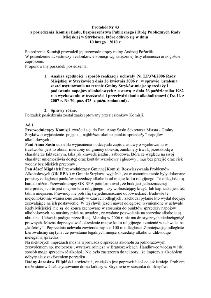 Protokół Nr 43 z posiedzenia Komisji Ładu, Bezpieczeństwa Publicznego i Dróg Publicznych Rady Miejskiej w Strykowie, które odbyło się w dniu 10 lutego 2010 r. Posiedzenie Komisji prowadził jej przewodniczący radny Andrzej Pożarlik. W posiedzeniu uczestniczyli członkowie komisji wg załączonej listy obecności oraz goście zaproszeni. Proponowany porządek posiedzenia: 1. Analiza zgodności i sposób realizacji uchwały Nr LI/374/2006 Rady Miejskiej w Strykowie z dnia 26 kwietnia 2006 r. w sprawie ustalenia zasad usytuowania na terenie Gminy Stryków miejsc sprzedaży i podawania napojów alkoholowych z ustawą z dnia 26 października 1982 r. o wychowaniu w trzeźwości i przeciwdziałaniu alkoholizmowi ( Dz. U. z 2007 r. Nr 70, poz. 473 z późn. zmianami) . 2. Sprawy różne. Porządek posiedzenia został zaakceptowany przez członków Komisji. Ad.1 Przewodniczący Komisji zwrócił się do Pani Anny Sasin Sekretarza Miasta - Gminy Stryków o wyjaśnienie pojęcia ,, najbliższa okolica punktu sprzedaży ” napojów alkoholowych . Pani Anna Sasin udzieliła wyjaśnienia i odczytała zapis z ustawy o wychowaniu w trzeźwości :jest to obszar mierzony od granicy obiektu, zamknięty trwałą przeszkodą o charakterze faktycznym, taka jak krawędź jezdni , zabudowa, która ze względu na swój charakter uniemożliwia dostęp oraz kontakt wzrokowy i głosowy , mur bez przejść oraz ciek wodny bez bliskich przepraw . Pan Józef Migdałek Przewodniczący Gminnej Komisji Rozwiązywania Problemów Alkoholowych (GK RPA ) w Gminie Stryków wyjaśnił , że w ostatnim czasie były dokonane pomiary odległości punktów sprzedaży alkoholu od miejsc kultu religijnego. Te odległości są bardzo różne .Przewodniczący GK RPA poinformował , że brak jest jednoznacznej interpretacji co to jest miejsce lutu religijnego , czy wolnostojący krzyż lub kapliczka jest też takim miejscem. Prawnicy nie potrafią się jednoznacznie odpowiedzieć. Budowle te niejednokrotnie wzniesione zostały w czasach odległych , zachodzi pytanie kto wydał decyzje zezwalające na ich postawienie. W tej chwili jeżeli nawet odległości wymienione w uchwale Rady Miejskiej nie są do końca zachowane w stosunku do punktów sprzedaży napojów alkoholowych to musimy mieć na uwadze , że wydane pozwolenia na sprzedaż alkoholu są aktualne. Uchwała podjęta przez Radę Miejską w 2006 r. nie ma drastycznych niedociągnięć prawnych. Można doprecyzować określenie miejsc kultu religijnego i zmienić w uchwale na ,,kościoły” . Poprzednia uchwała zawierała zapis o 100 m odległości .Zmniejszając odległość kierowaliśmy się tym , że powstanie legalnych miejsc sprzedaży alkoholu zlikwiduje nielegalną sprzedaż. Na niektórych imprezach można wprowadzić sprzedaż alkoholu za jednorazowym zezwoleniem np. motocross , wystawa rolnicza w Bratoszewicach .Handlowce wiedzą w jaki sposób mogą sprzedawać alkohol . Nie było zastrzeżeń do tej pory , że imprezy z alkoholem odbyły się z zakłóceniem porządku . Radny Jarosław Filipiński stwierdził , że ciężko jest poprawiać coś co już istnieje .Problem może stanowić też usytuowanie domu kultury w Strykowie w stosunku do sklepów. 2 Komendant Komisariatu Policji w Strykowie zgłosił takie zastrzeżenia po ostatnich dożynkach . Pan Józef Migdałek poinformował , że w przypadku dożynek nie było wydawane pozwolenie na sprzedaż alkoholu. Podkreślił , że jest zwolennikiem odbywania się imprez bez alkoholu . Wydawane są z ograniczeniem i sprzedający wiedzą jakie muszą spełniać warunki. Można zmienić regulamin wydawania zezwoleń , ale czy będzie on lepszy ? Raz w roku przeprowadzane sa kontrole placówek sprzedających alkohol, robione są szkolenia sprzedawców. Nie ma skarg na sklepy , które prowadza sprzedaż napojów alkoholowych. Jesteśmy jedna z niewielu gmin , która w całości wpływy z zezwoleń na sprzedaż alkoholu przeznacza na działalność związaną z ustawa o wychowaniu w trzeźwości np. zakupione zostały opaski odblaskowe dla uczniów szkół , organizowane są przedstawienia w szkołach związane z profilaktyką przeciwalkoholową i antynarkotykową itp. Pan Józef Migdałek nawiązał do posiedzenia Komisji Edukacji … oraz do sposobu organizowania zajęć w szkołach w okresie ferii. Poinformował o problemie opieki nad uczniami w czasie ferii ze strony nauczycieli i sposobu ich zatrudniania w czasie ferii. Pani Anna Sasin mówiła o tym , że dla Gminy Stryków ustalony limit punktów sprzedaży napojów alkoholowych wynosi 40 z czego mamy 39 punktów sprzedaży w tym 9 punktów gastronomicznych .Decyzje zezwalające na sprzedaż alkoholu danej placówce są wydawane po uzyskaniu pozytywnej opinii G K RPA .Sekretarz poinformowała , że w przypadku radykalnych posunięć i nie przedłużeniu pozwolenia na sprzedaż alkoholu w tych miejscach gdzie są niezgodne odległości od krzyży i kapliczek , wpływy środków z opłat za pozwolenia zmniejszyłyby się o ok. 18% tj. w granicach 27.000 zł w stosunku do roku poprzedniego. Zastanowić się też należy nad odległością od boisk . Radny Mirosław Kucharski stwierdził , że dyskusja w tej sprawie zmierza do tego jak komuś zaszkodzić bądź nie. Komisja Ładu, Bezpieczeństwa Publicznego i Dróg Publicznych Rady Miejskiej w Strykowie na posiedzeniu w dniu 10 lutego 2010 r. po dokonaniu analizy zgodności i sposobu realizacji uchwały Nr LI/374/2006 Rady Miejskiej w Strykowie z dnia 26 kwietnia 2006 r. w sprawie ustalenia zasad usytuowania na terenie Gminy Stryków miejsc sprzedaży i podawania napojów alkoholowych z ustawą z dnia 26 października 1982 r. o wychowaniu w trzeźwości i przeciwdziałaniu alkoholizmowi ( Dz. U. z 2007 r. Nr 70, poz. 473 z późn. zmianami) nie dopatrzyła się rozbieżności w wyżej wymienionych aktach prawnych . WNIOSEK Komisja wnioskuje o doprecyzowanie zapisu w uchwale Nr LI/374/2006 Rady Miejskiej w 