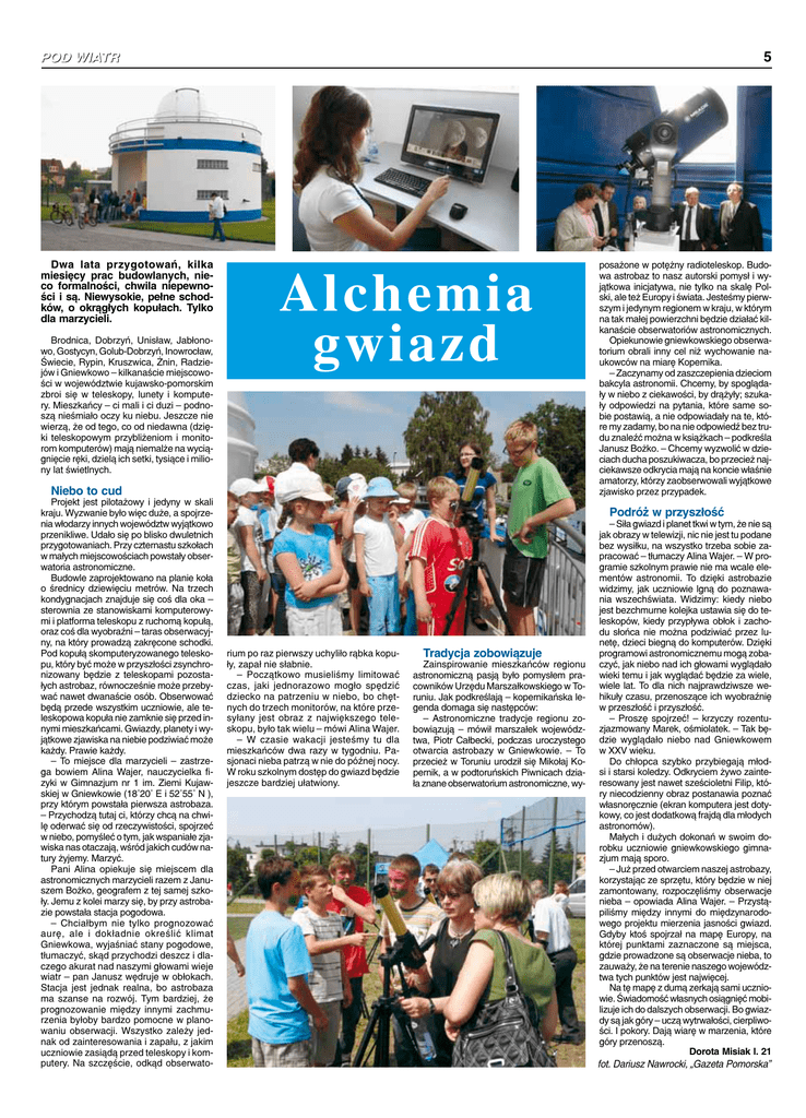 5 Dwa lata przygotowań, kilka miesięcy prac budowlanych, nieco formalności, chwila niepewności i są. Niewysokie, pełne schodków, o okrągłych kopułach. Tylko dla marzycieli. Brodnica, Dobrzyń, Unisław, Jabłonowo, Gostycyn, Golub-Dobrzyń, Inowrocław, Świecie, Rypin, Kruszwica, Żnin, Radziejów i Gniewkowo – kilkanaście miejscowości w województwie kujawsko-pomorskim zbroi się w teleskopy, lunety i komputery. Mieszkańcy – ci mali i ci duzi – podnoszą nieśmiało oczy ku niebu. Jeszcze nie wierzą, że od tego, co od niedawna (dzięki teleskopowym przybliżeniom i monitorom komputerów) mają niemalże na wyciągnięcie ręki, dzielą ich setki, tysiące i miliony lat świetlnych. Alchemia gwiazd Niebo to cud Projekt jest pilotażowy i jedyny w skali kraju. Wyzwanie było więc duże, a spojrzenia włodarzy innych województw wyjątkowo przenikliwe. Udało się po blisko dwuletnich przygotowaniach. Przy czternastu szkołach w małych miejscowościach powstały obserwatoria astronomiczne. Budowle zaprojektowano na planie koła o średnicy dziewięciu metrów. Na trzech kondygnacjach znajduje się coś dla oka – sterownia ze stanowiskami komputerowymi i platforma teleskopu z ruchomą kopułą, oraz coś dla wyobraźni – taras obserwacyjny, na który prowadzą zakręcone schodki. Pod kopułą skomputeryzowanego teleskopu, który być może w przyszłości zsynchronizowany będzie z teleskopami pozostałych astrobaz, równocześnie może przebywać nawet dwanaście osób. Obserwować będą przede wszystkim uczniowie, ale teleskopowa kopuła nie zamknie się przed innymi mieszkańcami. Gwiazdy, planety i wyjątkowe zjawiska na niebie podziwiać może każdy. Prawie każdy. – To miejsce dla marzycieli – zastrzega bowiem Alina Wajer, nauczycielka fizyki w Gimnazjum nr 1 im. Ziemi Kujawskiej w Gniewkowie (18°20° E i 52°55° N ), przy którym powstała pierwsza astrobaza. – Przychodzą tutaj ci, którzy chcą na chwilę oderwać się od rzeczywistości, spojrzeć w niebo, pomyśleć o tym, jak wspaniałe zjawiska nas otaczają, wśród jakich cudów natury żyjemy. Marzyć. Pani Alina opiekuje się miejscem dla astronomicznych marzycieli razem z Januszem Bożko, geografem z tej samej szkoły. Jemu z kolei marzy się, by przy astrobazie powstała stacja pogodowa. – Chciałbym nie tylko prognozować aurę, ale i dokładnie określić klimat Gniewkowa, wyjaśniać stany pogodowe, tłumaczyć, skąd przychodzi deszcz i dlaczego akurat nad naszymi głowami wieje wiatr – pan Janusz wędruje w obłokach. Stacja jest jednak realna, bo astrobaza ma szanse na rozwój. Tym bardziej, że prognozowanie między innymi zachmurzenia byłoby bardzo pomocne w planowaniu obserwacji. Wszystko zależy jednak od zainteresowania i zapału, z jakim uczniowie zasiądą przed teleskopy i komputery. Na szczęście, odkąd obserwato- posażone w potężny radioteleskop. Budowa astrobaz to nasz autorski pomysł i wyjątkowa inicjatywa, nie tylko na skalę Polski, ale też Europy i świata. Jesteśmy pierwszym i jedynym regionem w kraju, w którym na tak małej powierzchni będzie działać kilkanaście obserwatoriów astronomicznych. Opiekunowie gniewkowskiego obserwatorium obrali inny cel niż wychowanie naukowców na miarę Kopernika. – Zaczynamy od zaszczepienia dzieciom bakcyla astronomii. Chcemy, by spoglądały w niebo z ciekawości, by drążyły; szukały odpowiedzi na pytania, które same sobie postawią, a nie odpowiadały na te, które my zadamy, bo na nie odpowiedź bez trudu znaleźć można w książkach – podkreśla Janusz Bożko. – Chcemy wyzwolić w dzieciach ducha poszukiwacza, bo przecież najciekawsze odkrycia mają na koncie właśnie amatorzy, którzy zaobserwowali wyjątkowe zjawisko przez przypadek. Podróż w przyszłość rium po raz pierwszy uchyliło rąbka kopuły, zapał nie słabnie. – Początkowo musieliśmy limitować czas, jaki jednorazowo mogło spędzić dziecko na patrzeniu w niebo, bo chętnych do trzech monitorów, na które przesyłany jest obraz z największego teleskopu, było tak wielu – mówi Alina Wajer. – W czasie wakacji jesteśmy tu dla mieszkańców dwa razy w tygodniu. Pasjonaci nieba patrzą w nie do późnej nocy. W roku szkolnym dostęp do gwiazd będzie jeszcze bardziej ułatwiony. Tradycja zobowiązuje Zainspirowanie mieszkańców regionu astronomiczną pasją było pomysłem pracowników Urzędu Marszałkowskiego w Toruniu. Jak podkreślają – kopernikańska legenda domaga się następców: – Astronomiczne tradycje regionu zobowiązują – mówił marszałek województwa, Piotr Całbecki, podczas uroczystego otwarcia astrobazy w Gniewkowie. – To przecież w Toruniu urodził się Mikołaj Kopernik, a w podtoruńskich Piwnicach działa znane obserwatorium astronomiczne, wy- – Siła gwiazd i planet tkwi w tym, że nie są jak obrazy w telewizji, nic nie jest tu podane bez wysiłku, na wszystko trzeba sobie zapracować – tłumaczy Alina Wajer. – W programie szkolnym prawie nie ma wcale elementów astronomii. To dzięki astrobazie widzimy, jak uczniowie lgną do poznawania wszechświata. Widzimy: kiedy niebo jest bezchmurne kolejka ustawia się do teleskopów, kiedy przypływa obłok i zachodu słońca nie można podziwiać przez lunetę, dzieci biegną do komputerów. Dzięki programowi astronomicznemu mogą zobaczyć, jak niebo nad ich głowami wyglądało wieki temu i jak wyglądać będzie za wiele, wiele lat. To dla nich najprawdziwsze wehikuły czasu, przenoszące ich wyobraźnię w przeszłość i przyszłość. – Proszę spojrzeć! – krzyczy rozentuzjazmowany Marek, ośmiolatek. – Tak będzie wyglądało niebo nad Gniewkowem w XXV wieku. Do chłopca szybko przybiegają młodsi i starsi koledzy. Odkryciem żywo zainteresowany jest nawet sześcioletni Filip, który niecodzienny obraz postanawia poznać własnoręcznie (ekran komputera jest dotykowy, co jest dodatkową frajdą dla młodych astronom